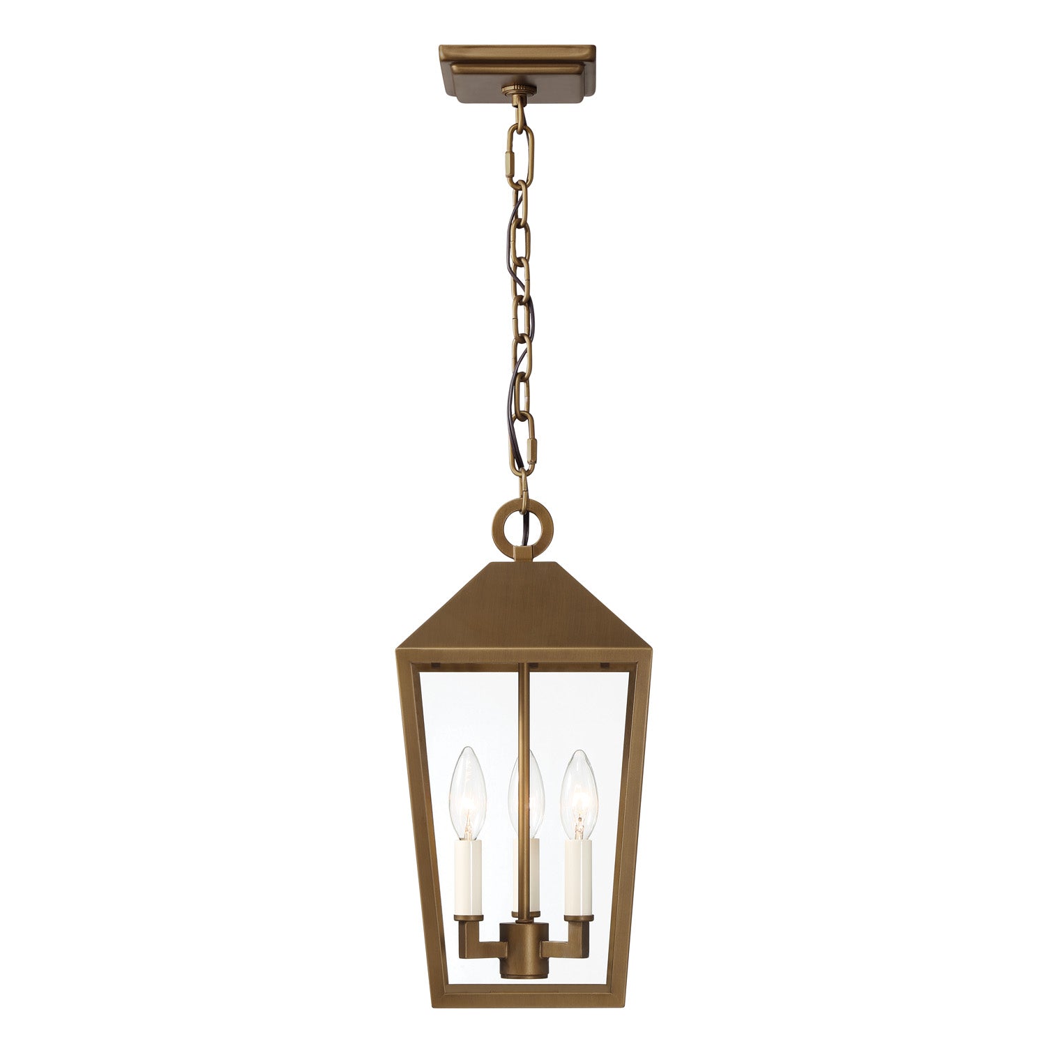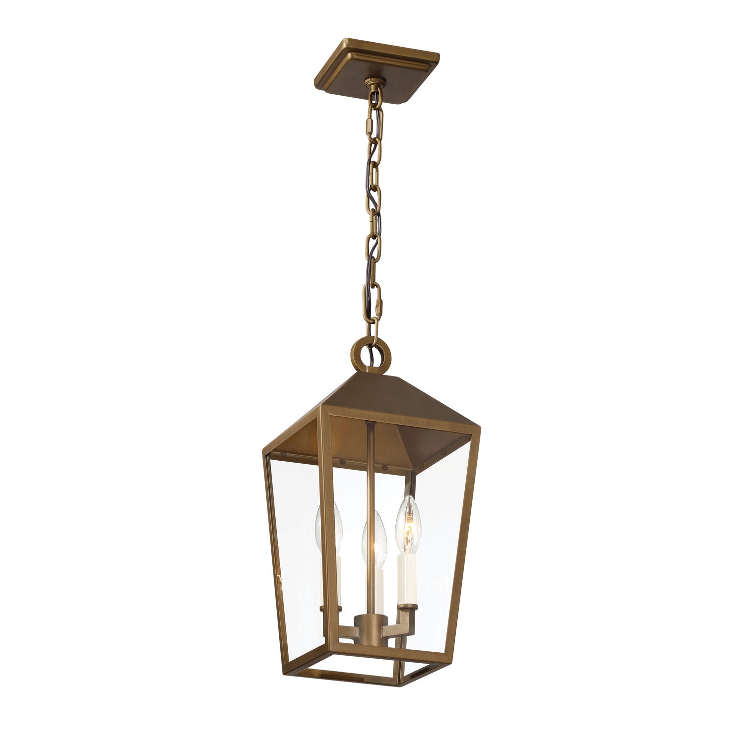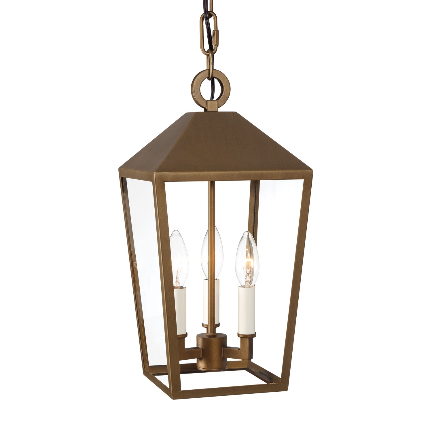 The Cole Outdoor Hanging Light is a timeless and classic lantern design with a modern sensibility. A slightly tapered silhouette reveals simple lines that seamlessly frame clear glass and three candelabra style bulbs, housed in burnished brass or cream-colored sleeves. The outdoor hanging light fixture is topped with a weatherproof canopy that blends harmoniously with the frame. A coordinated metal chain securely hangs the light and accentuates the arching ring detail. This sturdy outdoor light is designed to withstand the elements complete with a burnished brass, powder-coated finish. Perfect as a single fixture illuminating an entryway, or used in multiples for lighting a porch or patio, this fixture can also be used indoors to light up a foyer or in multiples as pendants over an island. This medium-sized outdoor pendant light is part of the larger Cole Outdoor Lighting collection, including post and wall lights to complete your exterior lighting project.