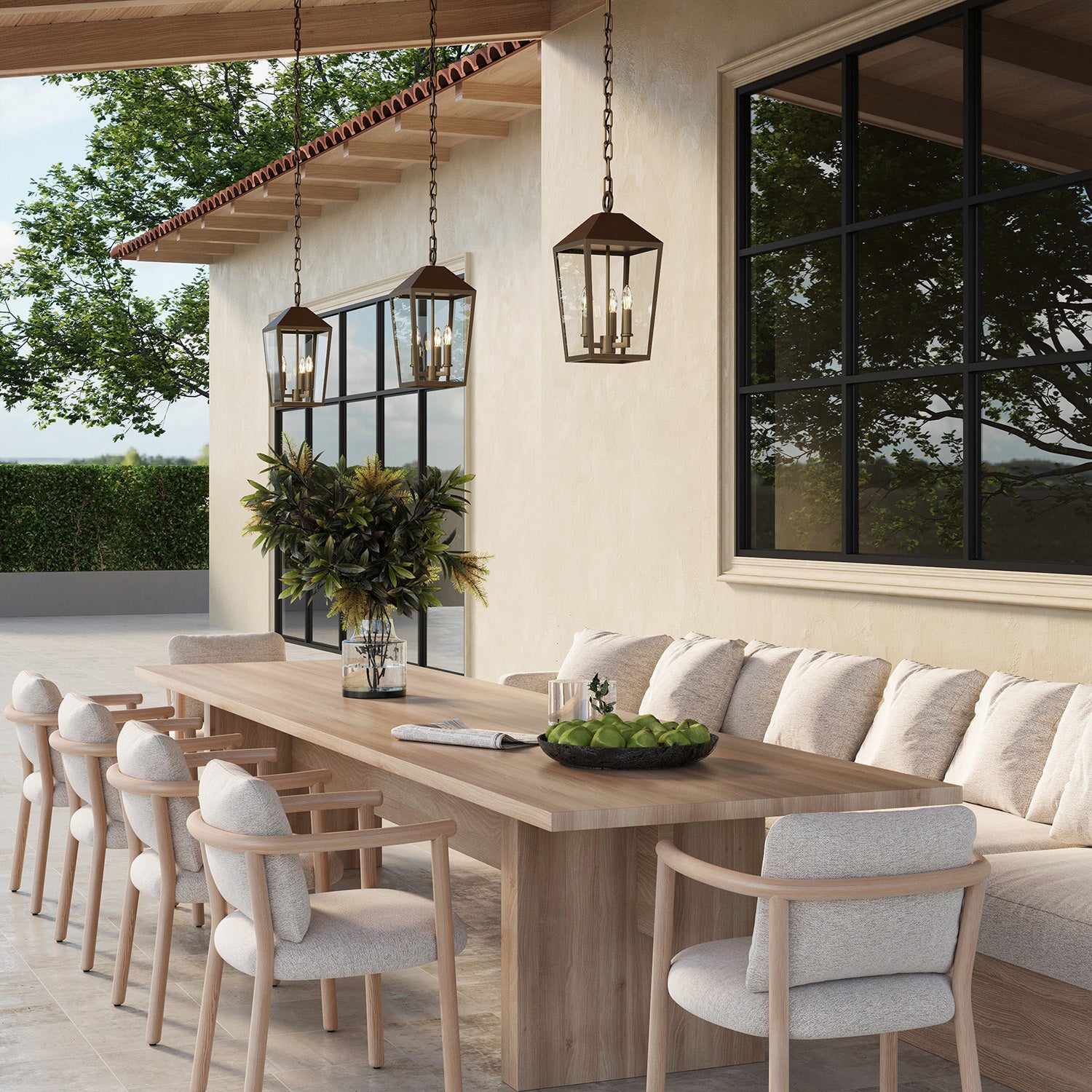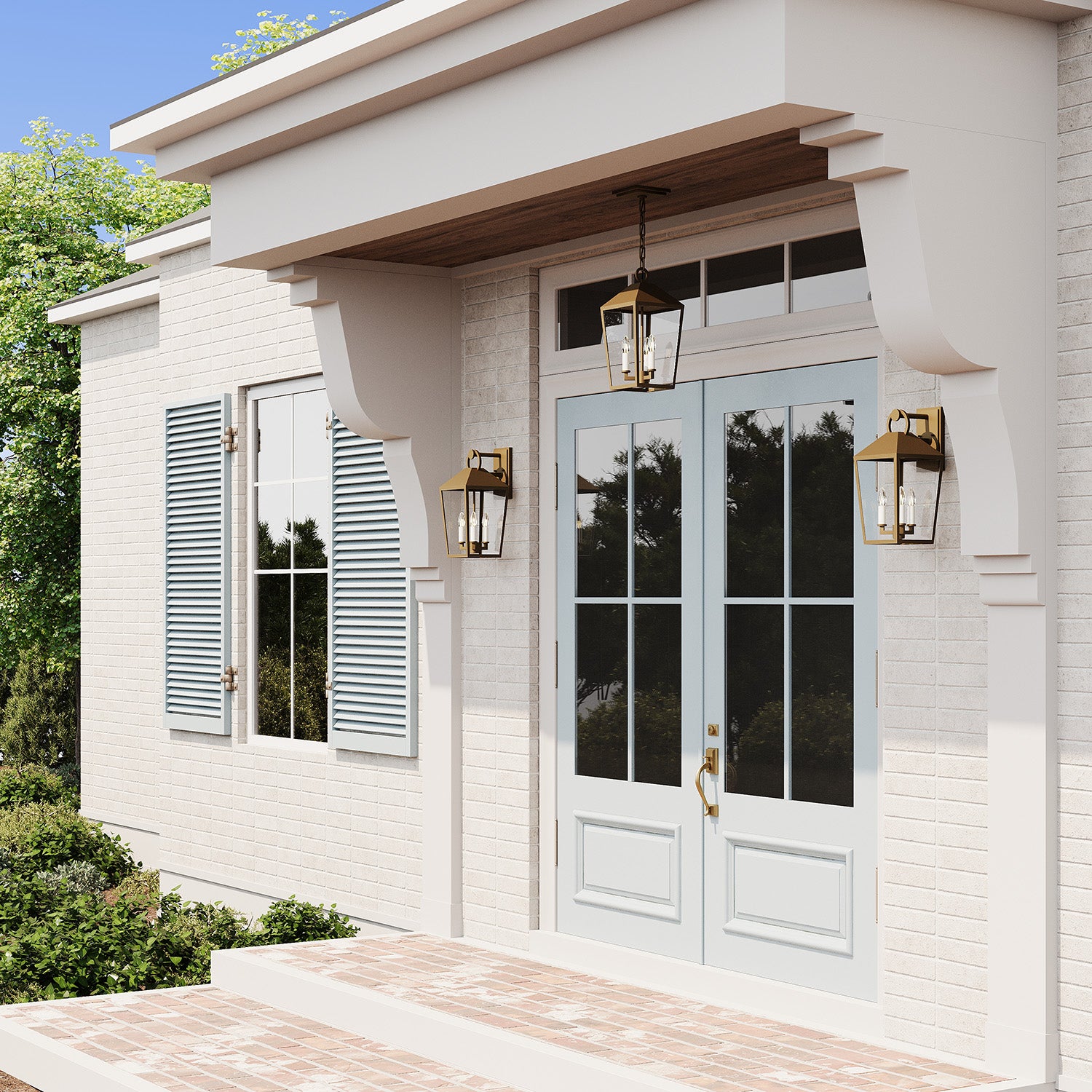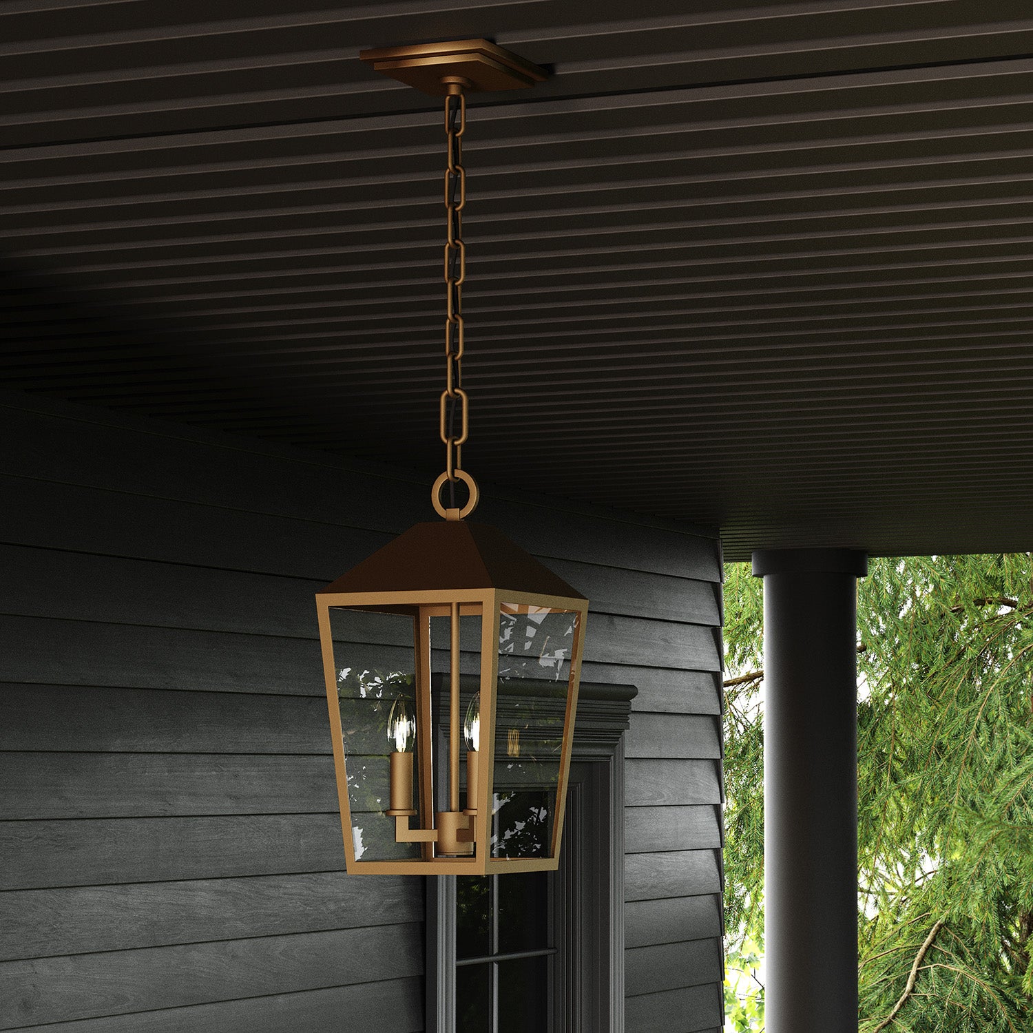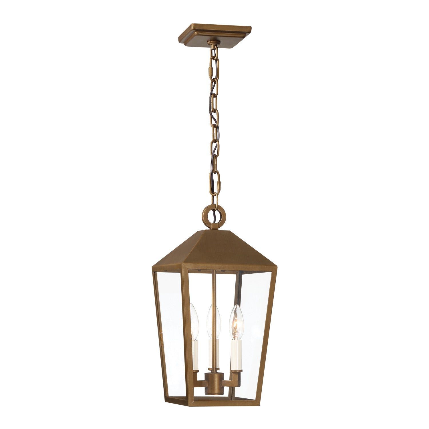 The Cole Outdoor Hanging Light is a timeless and classic lantern design with a modern sensibility. A slightly tapered silhouette reveals simple lines that seamlessly frame clear glass and three candelabra style bulbs, housed in burnished brass or cream-colored sleeves. The outdoor hanging light fixture is topped with a weatherproof canopy that blends harmoniously with the frame. A coordinated metal chain securely hangs the light and accentuates the arching ring detail. This sturdy outdoor light is designed to withstand the elements complete with a burnished brass, powder-coated finish. Perfect as a single fixture illuminating an entryway, or used in multiples for lighting a porch or patio, this fixture can also be used indoors to light up a foyer or in multiples as pendants over an island. This medium-sized outdoor pendant light is part of the larger Cole Outdoor Lighting collection, including post and wall lights to complete your exterior lighting project.