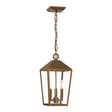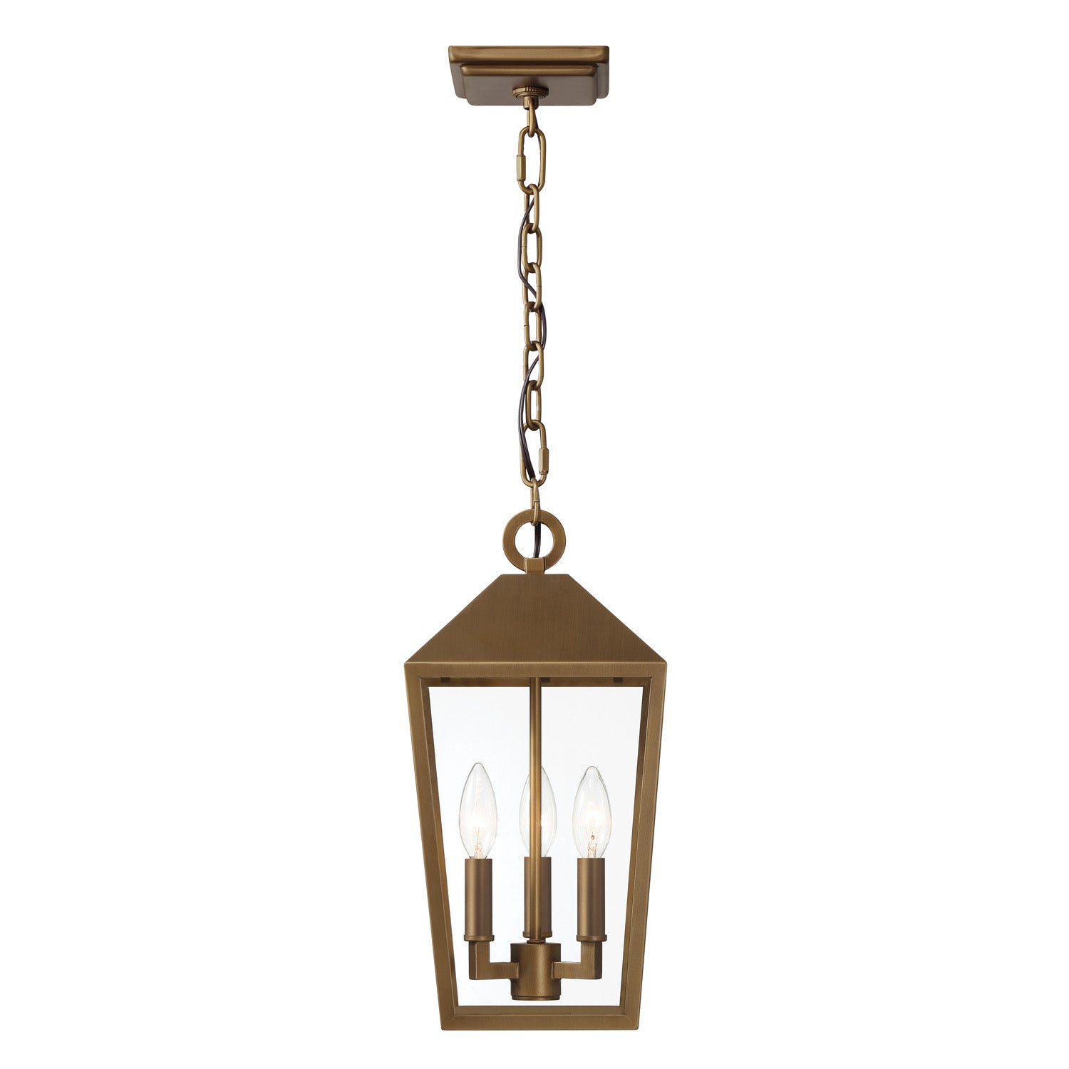 • Outdoor 16" pendant light features three candelabra bulbs set in a classic lantern-style metal and glass fixture and finished in burnished brass
