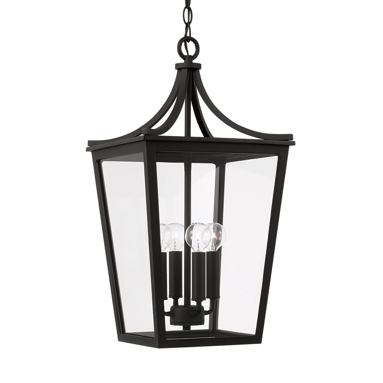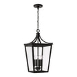 • Sculptural matte black metal lantern design with curved supports and clear glass side panels