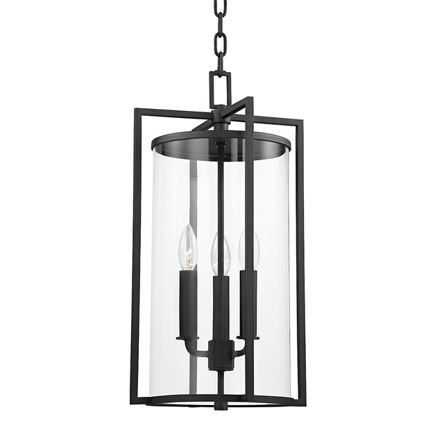 The Peyton Outdoor Hanging Light is a modern take on a traditional lantern, making a sophisticated statement with its clean lines and open cage design. The sturdy aluminum frame holds a clear glass cylinder, creating a refined silhouette that beautifully showcases the light source. Designed to withstand the elements, this outdoor hanging light provides bright, multi-directional illumination, enhancing the safety and curb appeal of your home. With its UL wet rating, it is a perfect solution for a covered entryway, porch, or gazebo. The sophisticated finish, textured black, delivers enduring, traditional style and a perfect blend of form and function.