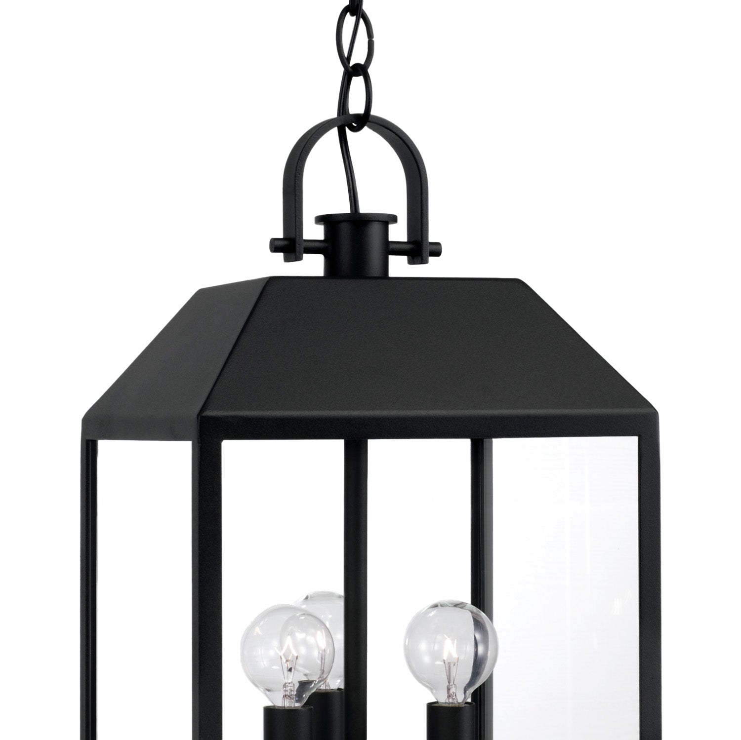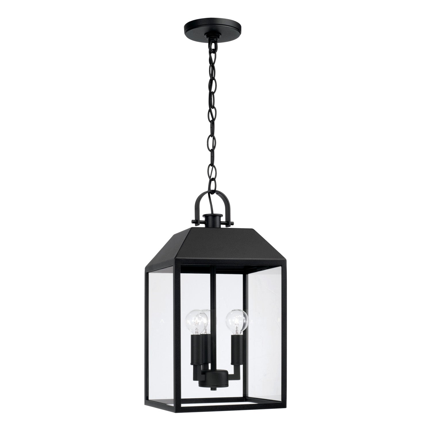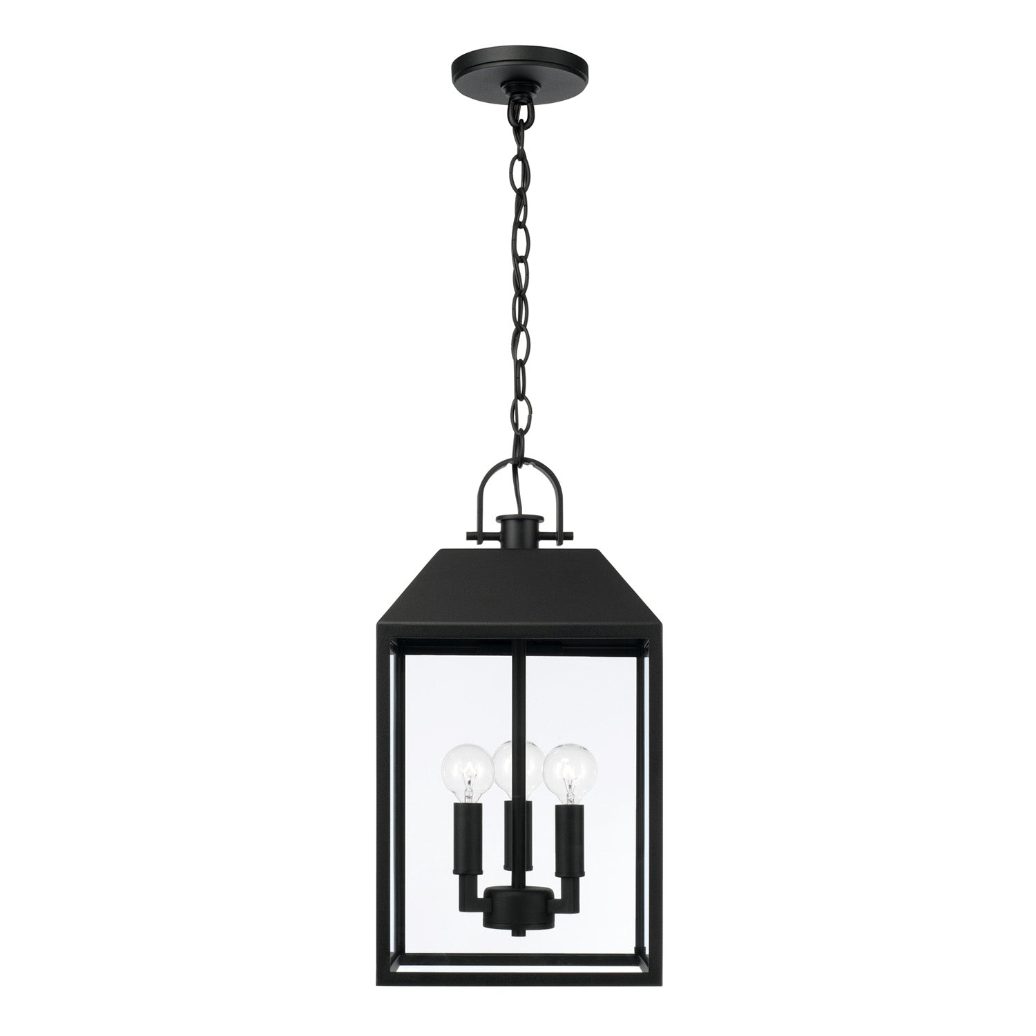 Clean lines meet industrial inspiration in the Porter Outdoor Hanging Light, delivering modern sophistication to your exterior spaces. This refined fixture features a boxy glass lantern with a flat-topped roof and distinctive decorative handle, suspended from a coordinating canopy and chain. The rich matte black finish and clear glass panels work together to provide bright, unobstructed illumination while maintaining a streamlined aesthetic. Perfect for creating a focal point in covered porches, patios, and entryways, this fixture brings professional polish to outdoor spaces that demand both style and performance.