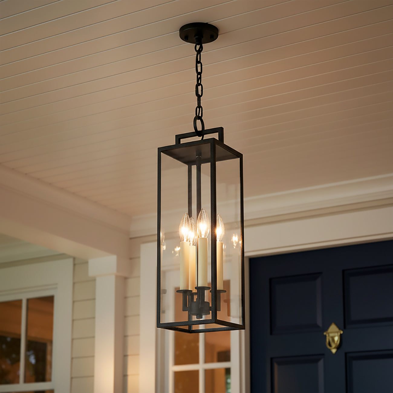 The Everett Outdoor Hanging Light brings classic design and modern durability to your exterior spaces. Crafted from durable forged iron, with clear glass side panels, this damp-rated fixture is built to withstand the elements and provides reliable illumination year-round. The outdoor pendant features three candelabra sockets with cream-colored candle sleeves, and an open bottom. With its clean, minimalist silhouette, it adds a touch of elegance to porches, patios, or entryways. Designed for both style and functionality, this hanging light enhances the ambiance of your outdoor space, offering timeless appeal and dependable lighting that will shine through all seasons.