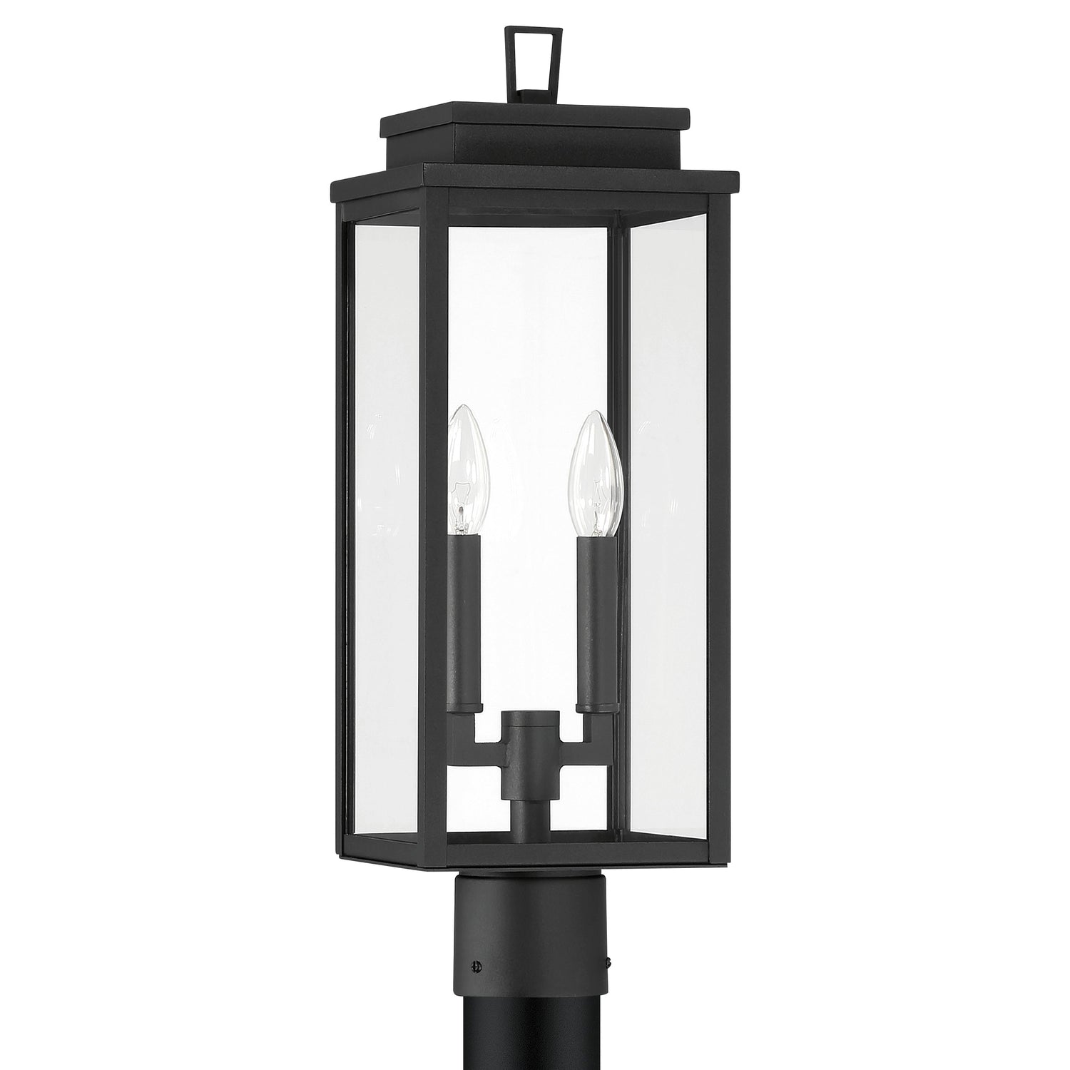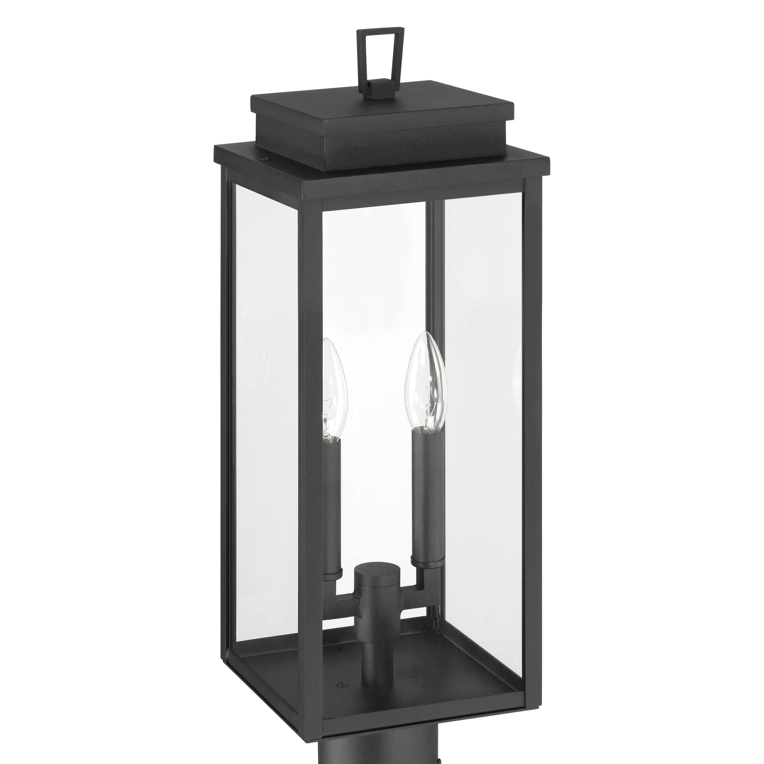 The Trevor Outdoor Post Light 20", Black presents an elevated take on the traditional lantern, blending classic charm with a clean, contemporary edge. This fixture features a simple rectangular frame with clear glass panels that perfectly frame elongated interior candles, creating a timeless architectural silhouette. As light emanates from within the transparent glass, it provides a warm and welcoming glow that enhances the curb appeal of pathways, driveways, or garden landscapes. Crafted with durable materials and a crisp black finish, this post lantern is designed to offer a sophisticated and reliable lighting solution that withstands the elements while maintaining its refined aesthetic.