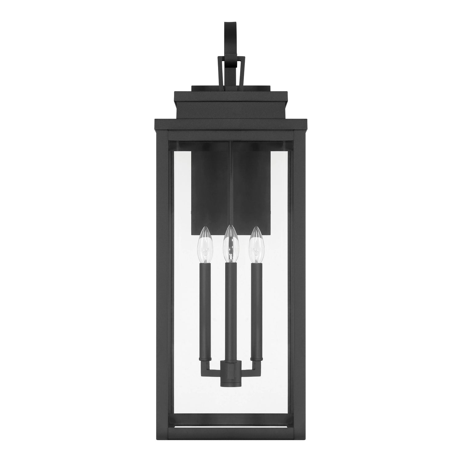 The Trevor Outdoor Wall Light, Extra Large 31", Black presents an elevated take on the traditional lantern, blending classic charm with a clean, contemporary edge. This fixture features a simple rectangular frame with clear glass panels that perfectly frame elongated interior candles, creating a timeless architectural silhouette. As light emanates from within the transparent glass, it provides a warm and welcoming glow that enhances the curb appeal of grand entryways, expansive porches, or patios. Crafted with durable materials and a crisp black finish, this wall lantern is designed to offer a sophisticated and reliable lighting solution that withstands the elements while maintaining its refined aesthetic.