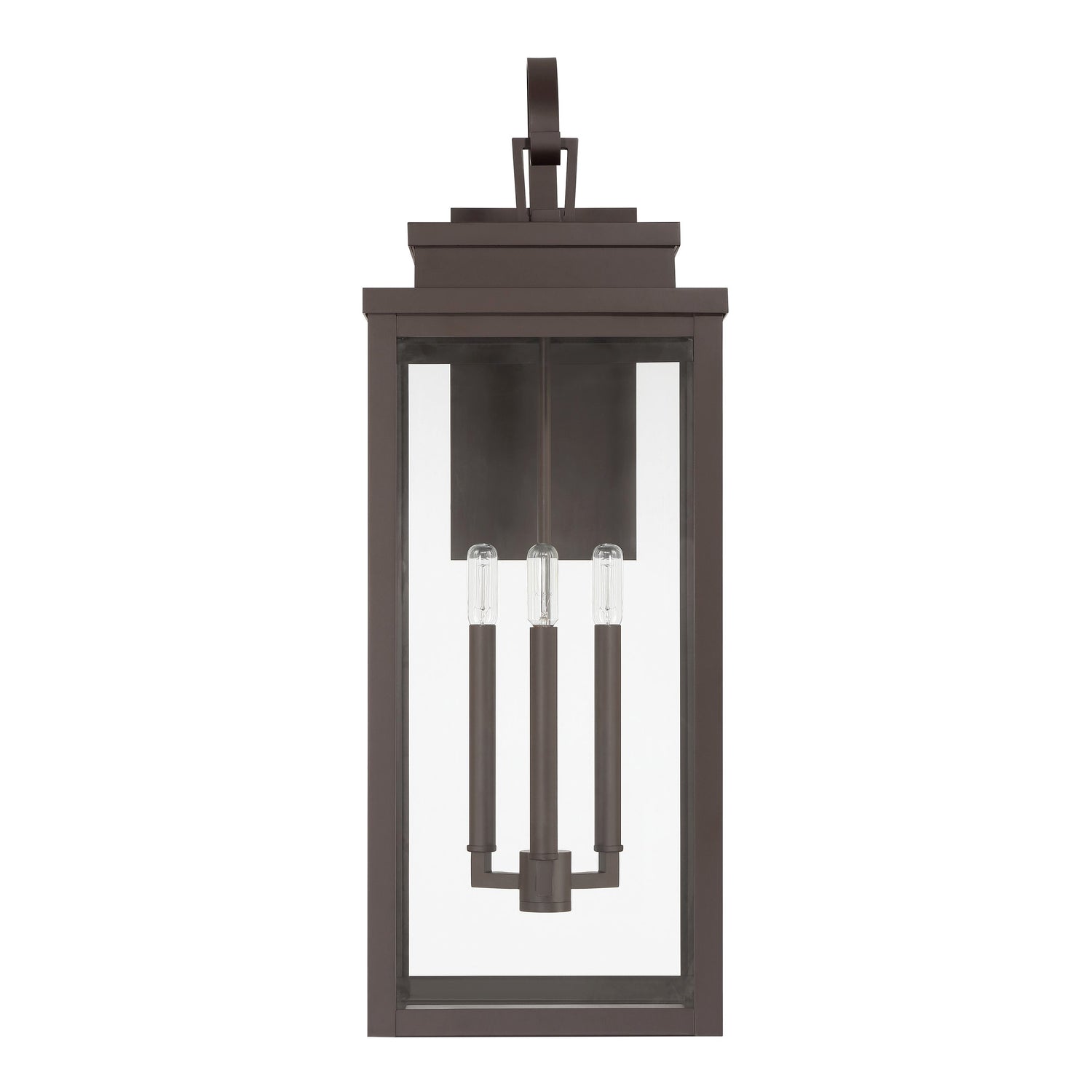 The Trevor Outdoor Wall Light, Extra Large 31", Bronze presents an elevated take on the traditional lantern, blending classic charm with a clean, contemporary edge. This fixture features a simple rectangular frame with clear glass panels that perfectly frame elongated interior candles, creating a timeless architectural silhouette. As light emanates from within the transparent glass, it provides a warm and welcoming glow that enhances the curb appeal of grand entryways, expansive porches, or patios. Crafted with durable materials and a rich bronze finish, this wall lantern is designed to offer a sophisticated and reliable lighting solution that withstands the elements while maintaining its refined aesthetic.