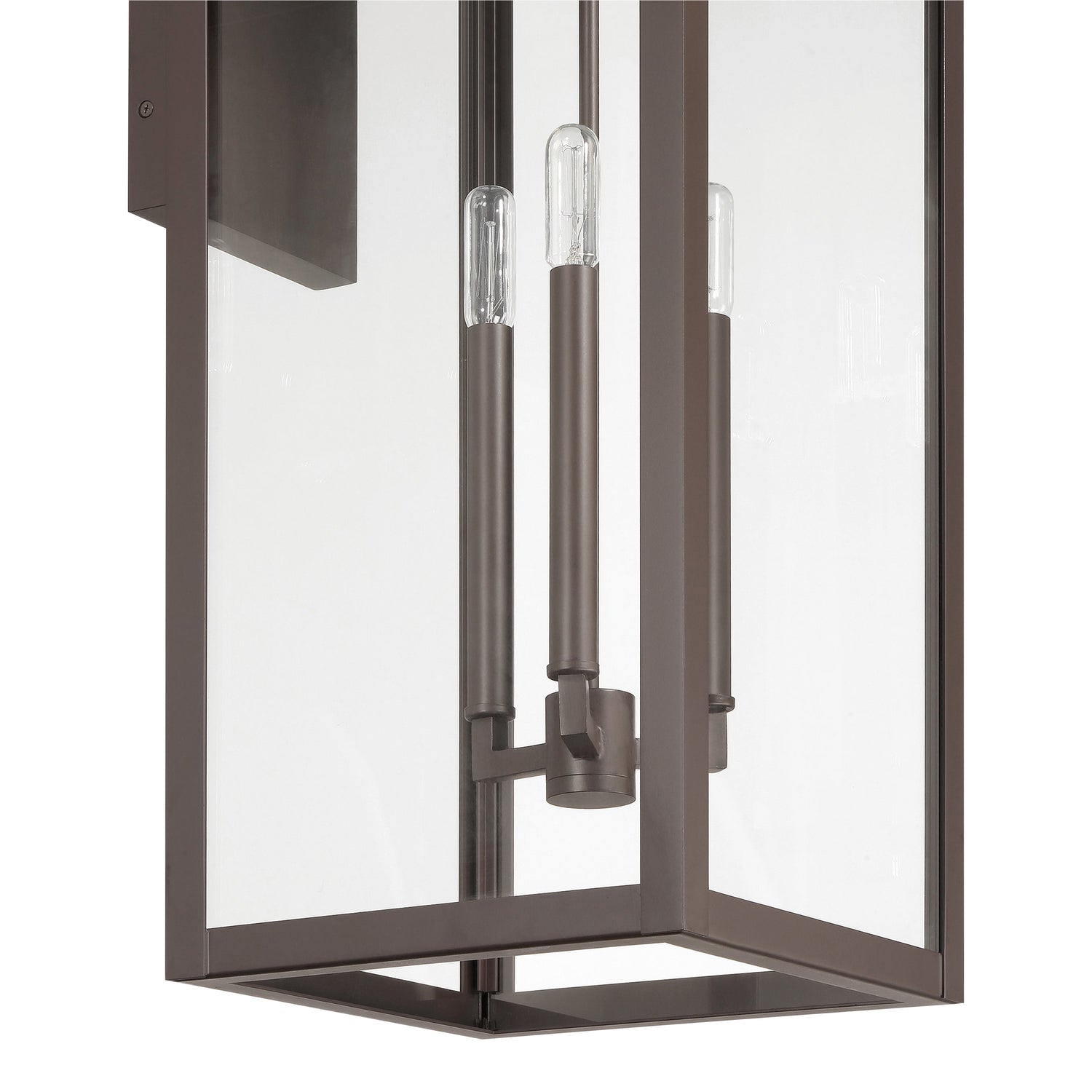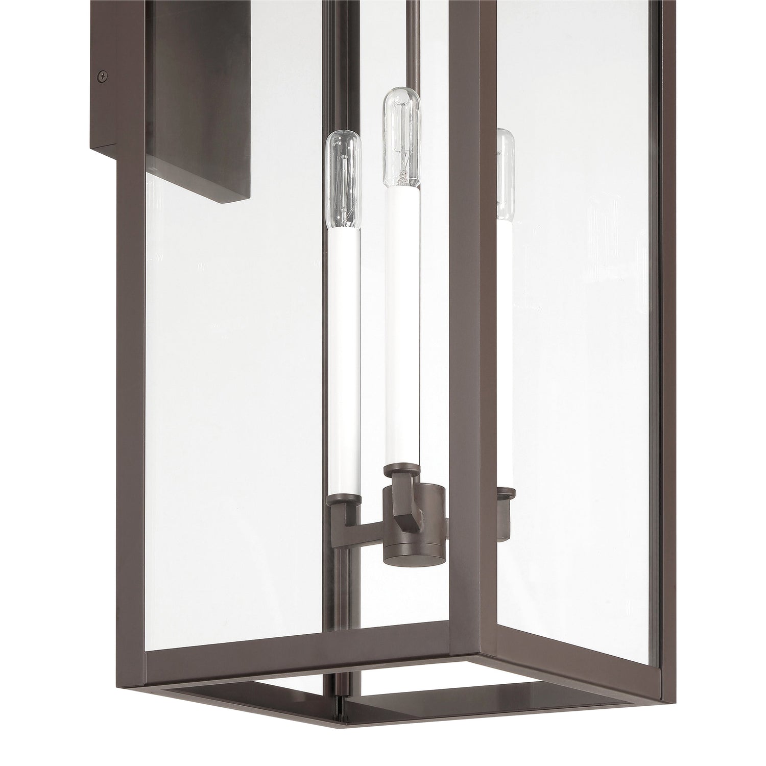 • Trevor features an elevated wall lantern design with a simple rectangular aluminum frame and clear glass panels that frame elongated interior candles