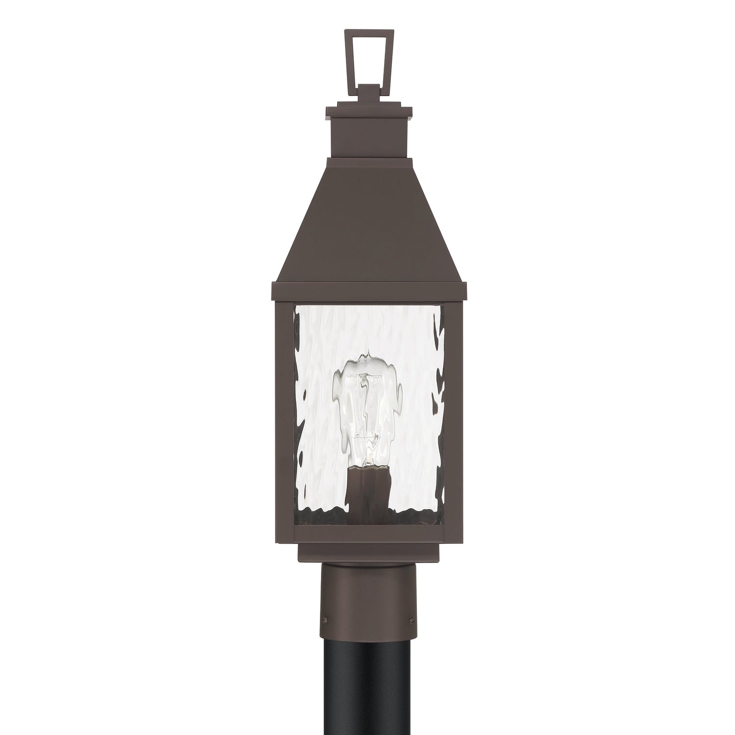 The Westin Outdoor Post Light 20", Bronze and Water Glass bridges traditional inspiration with modern craftsmanship, serving as a sophisticated and durable addition to any home's exterior. Its extended roofline and framed water glass panels bring a renewed sense of warmth and distinction to traditional design, creating an architectural silhouette that stands the test of time. As light filters through the textured glass, it creates a gentle, rippled glow, offering a welcoming atmosphere for pathways, driveways, or garden landscapes. This fixture combines a nostalgic aesthetic with high-quality materials to ensure your outdoor spaces are illuminated with elegance and clarity.
