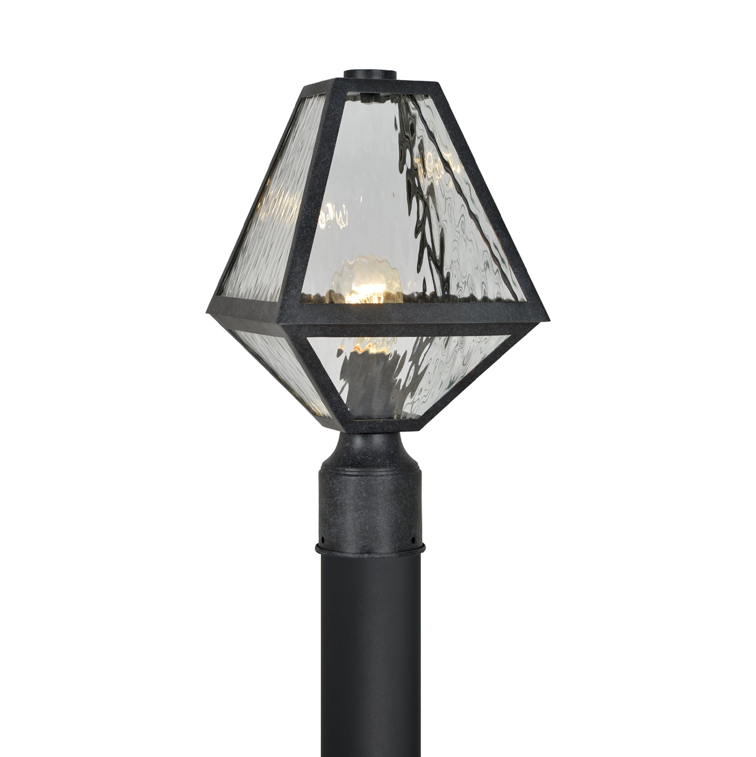 The Emmett Outdoor Post Light features a distinctive geometric design with a Black Charcoal finish. The unique diamond-shaped fixture is complemented by clear, water glass panels that diffuse light beautifully while creating visual interest. This contemporary outdoor light measures 15.5" tall and 8" wide, making it perfect for illuminating walkways, driveways, or garden areas. This versatile fixture can be mounted atop a round metal post; alternately, it can be mounted to other surfaces with a pier mount. Both mounting options are sold separately and come in matte black. The modern silhouette creates an architectural statement that enhances both traditional and contemporary landscapes. Weather-resistant and designed for outdoor use, the Emmett adds sophisticated lighting while serving as a decorative element during daylight hours.
