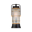 • Transitional lantern design with black and gold finish featuring protective cage structure and cylindrical clear ribbed glass shade for warm, cozy illumination