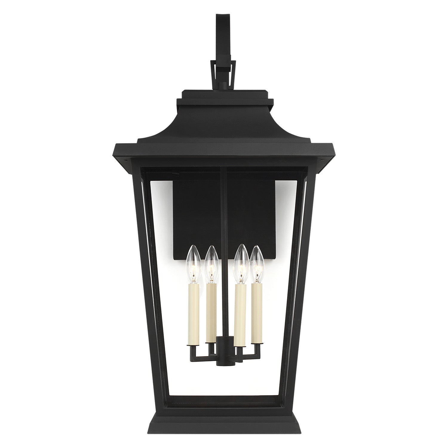 The Pembroke Extra Large Outdoor Wall Light makes a commanding statement with its classic lantern aesthetic and traditional design elements. This durable fixture is built to withstand the elements while enhancing the beauty of your property. Its clear glass panels beautifully showcase four exposed candelabra bulbs, providing bright, welcoming illumination that increases the safety and security of your home. With its ETL wet rating, this light is a perfect solution for any outdoor space. The rich Textured Black finish offers a subtle mix of traditional design elements, creating a versatile and enduring look that brings both functional beauty and curb appeal to your home.