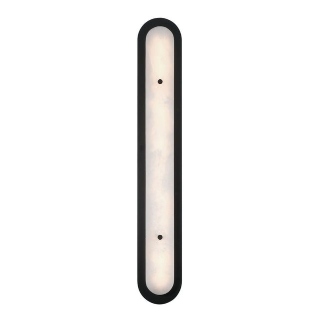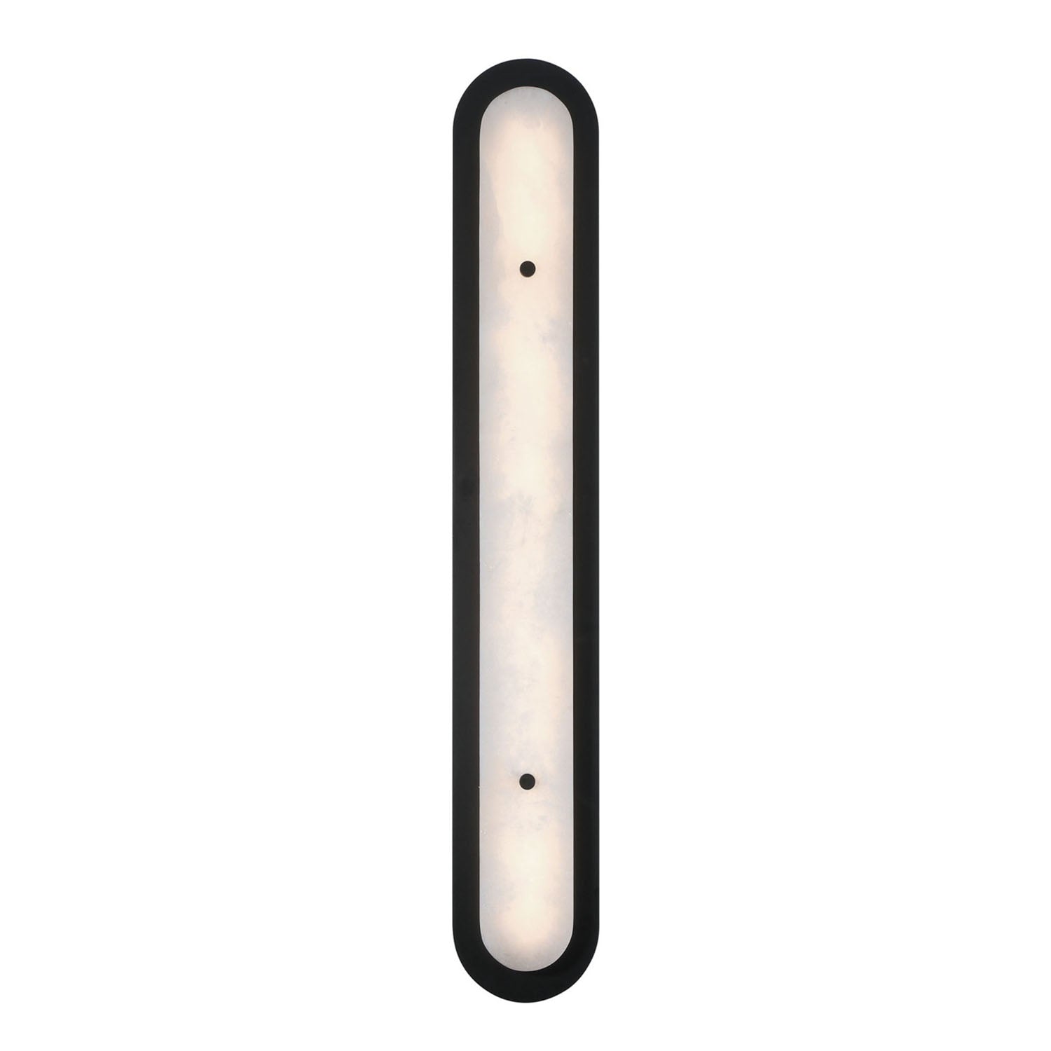 The Vance LED Outdoor Wall Light transforms exterior walls into illuminated art with its distinctive elongated oval form and bold powder-coated black frame. This elegant fixture showcases an alabaster center that creates a gentle, uniform glow when illuminated, while the surrounding black frame casts a beautiful halo effect that makes the entire piece appear to float effortlessly against the wall. The harmonious blend between the natural alabaster and black elements seamlessly merges vintage glamour with contemporary sophistication. At 38" long with weather-resistant design, this sconce delivers both striking appeal and exceptional practical illumination for outdoor spaces.