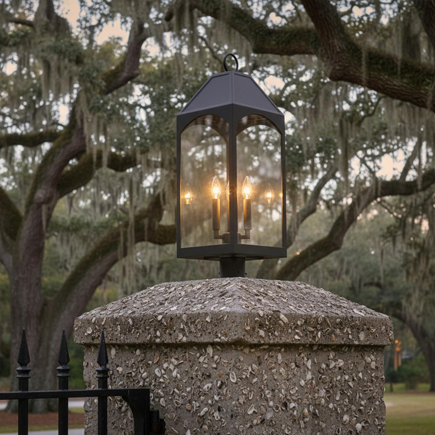 The distinctive charm of the Chester Outdoor Post Light brings timeless elegance to your exterior spaces with its unique house-shaped silhouette and classic lantern styling. This charming fixture features a peaked roof design and clean geometric lines, creating an inviting beacon for pathways, driveways, and garden areas. The rich matte black finish beautifully contrasts with the clear glass panels, while the signature ring handle adds an authentic touch of traditional craftsmanship. Perfect for illuminating outdoor walkways and creating a welcoming atmosphere throughout your landscape, this versatile post light combines nostalgic appeal with reliable performance.