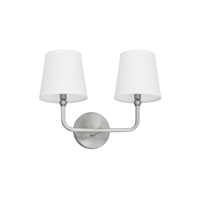 The Elowen 2 Light Vanity brings refined elegance to bathrooms and vanity areas with its curved design and sophisticated brushed nickel finish. Featuring two white fabric shades paired with sleek curved arms, this 16" fixture delivers soft, diffused lighting perfect for vanities, powder rooms, or hallways. The brushed nickel finish adds subtle sophistication that complements both traditional and transitional interiors. The Elowen vanity light combines smooth curves with premium materials to create a distinctive lighting solution that enhances your space with understated sophistication.