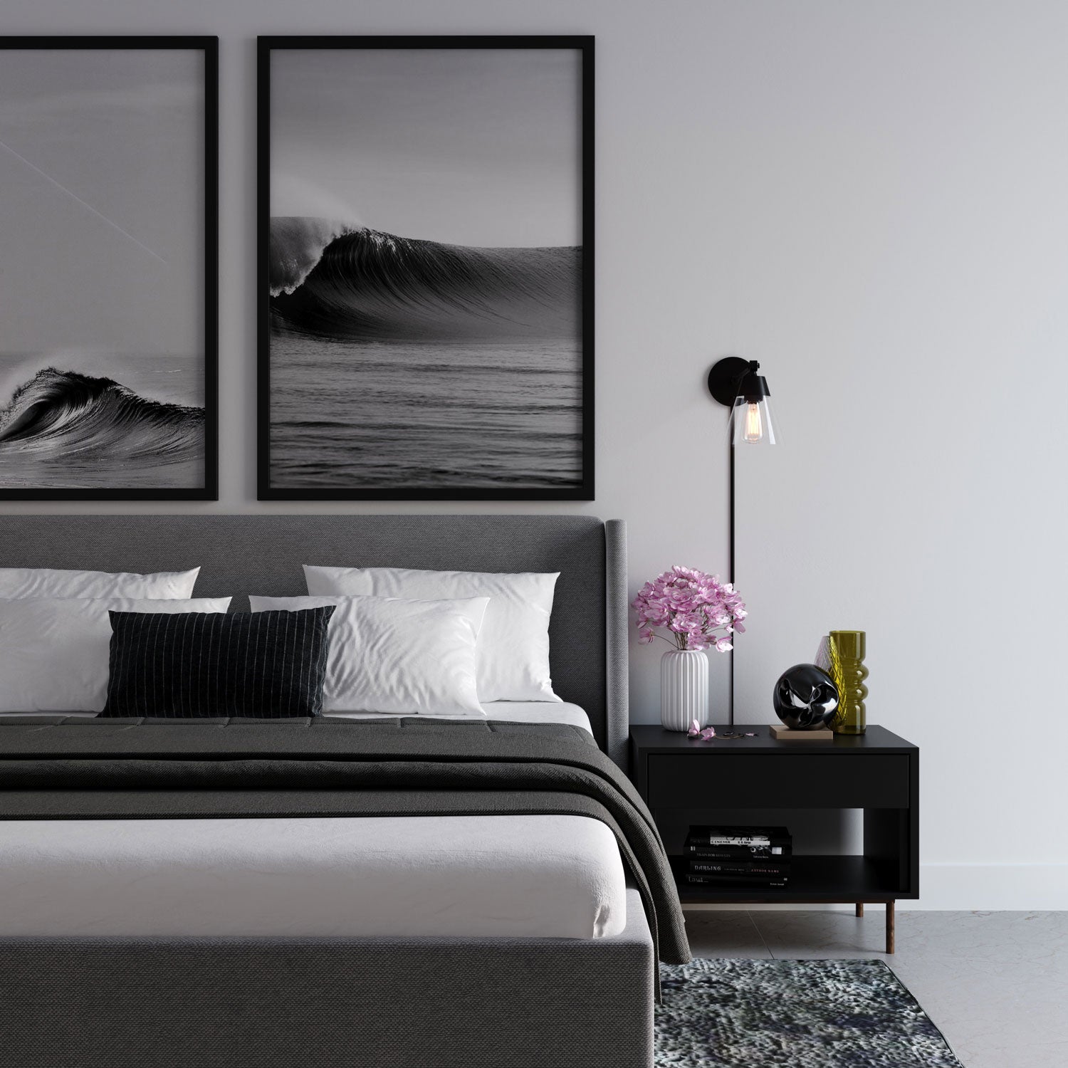 • One modern plug-in wall sconce in a striking matte black finish, adjustable in two places along the arm