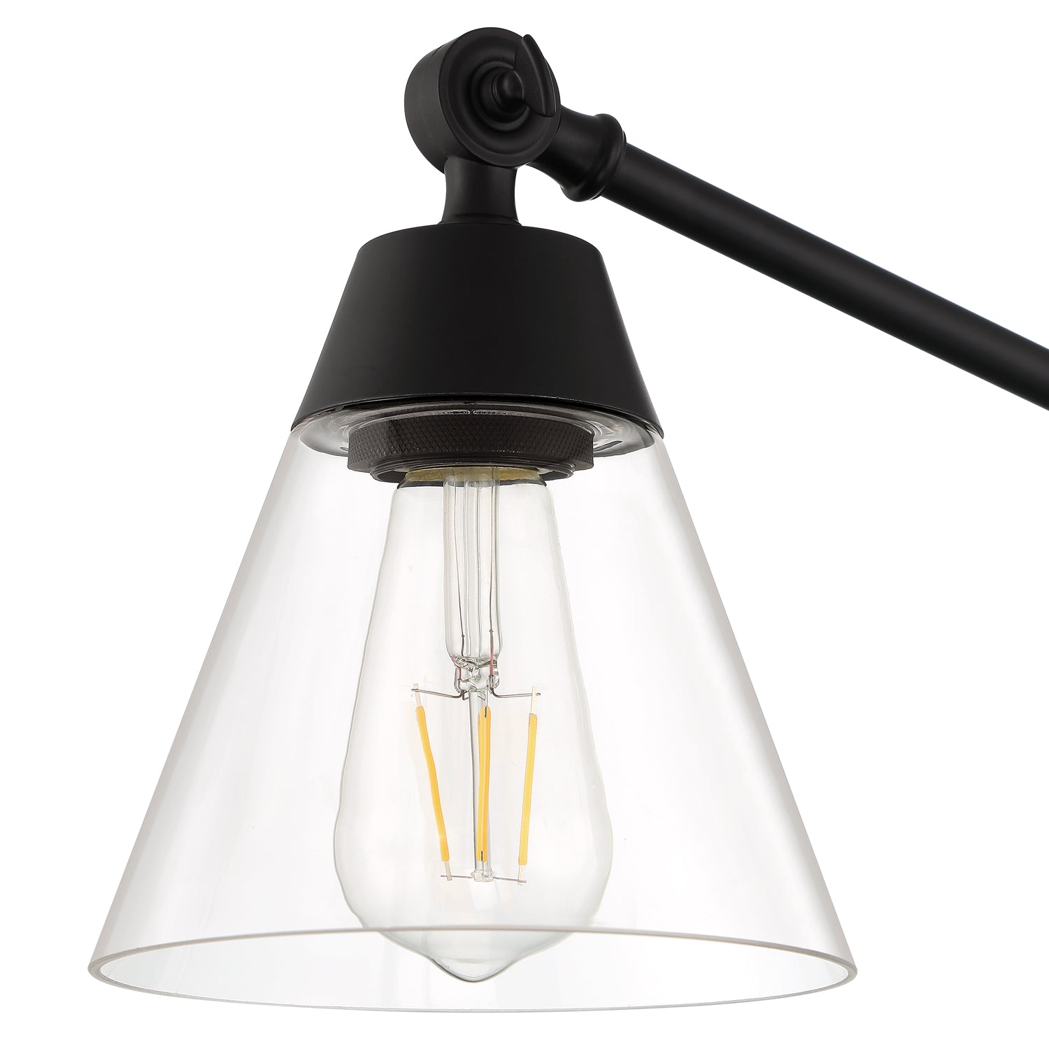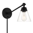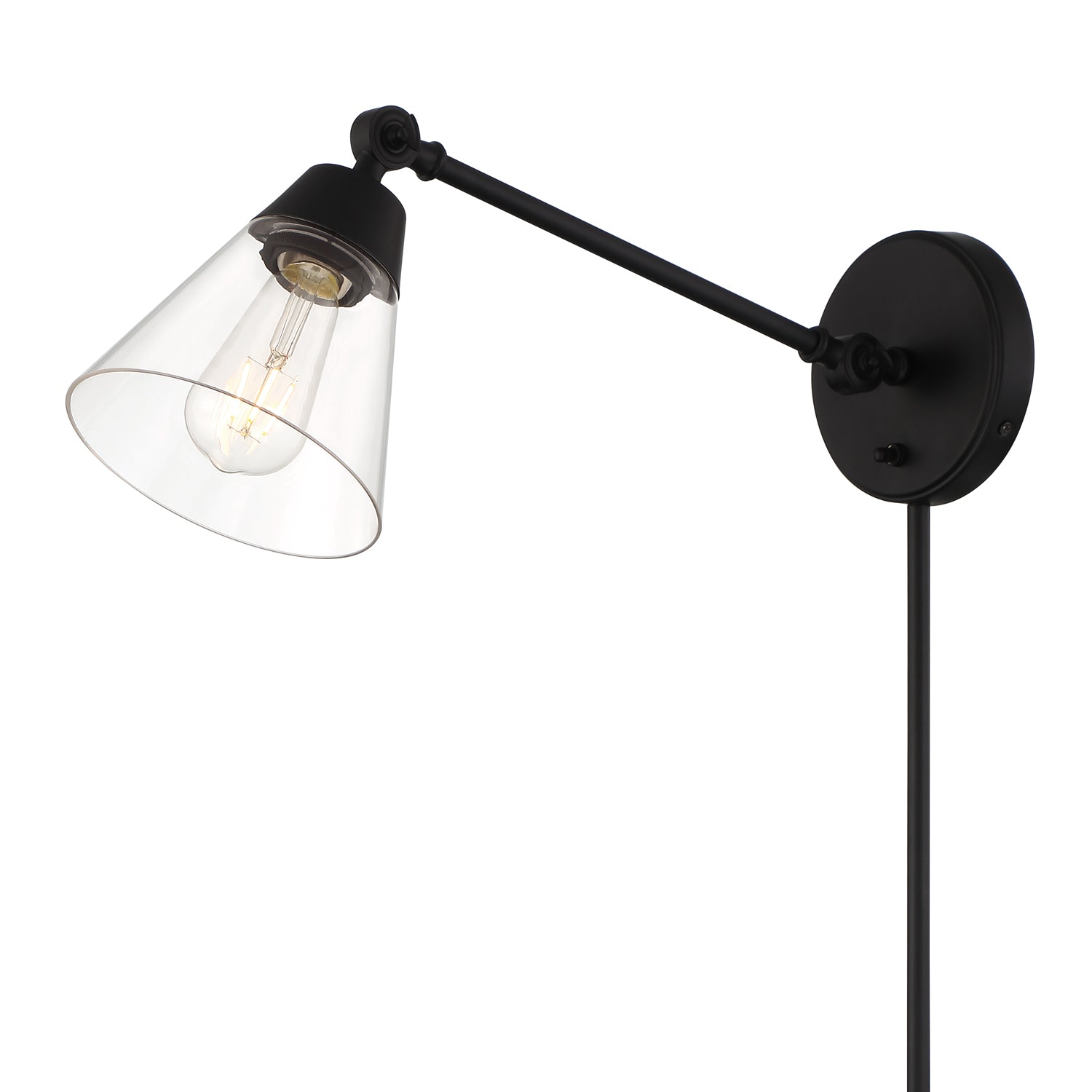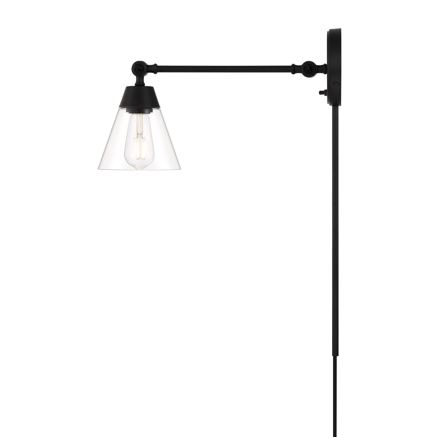 Inspired by industrial elegance and vintage style, the Owen Adjustable One-Light Plug-In Wall Sconce is a modern spin on a traditional light fixture. Featuring a tapered clear glass shade suspended by an articulating arm and embellished backplate, all in a striking matte black finish. This functional single-arm library light is a perfect addition to modern or transitional settings.