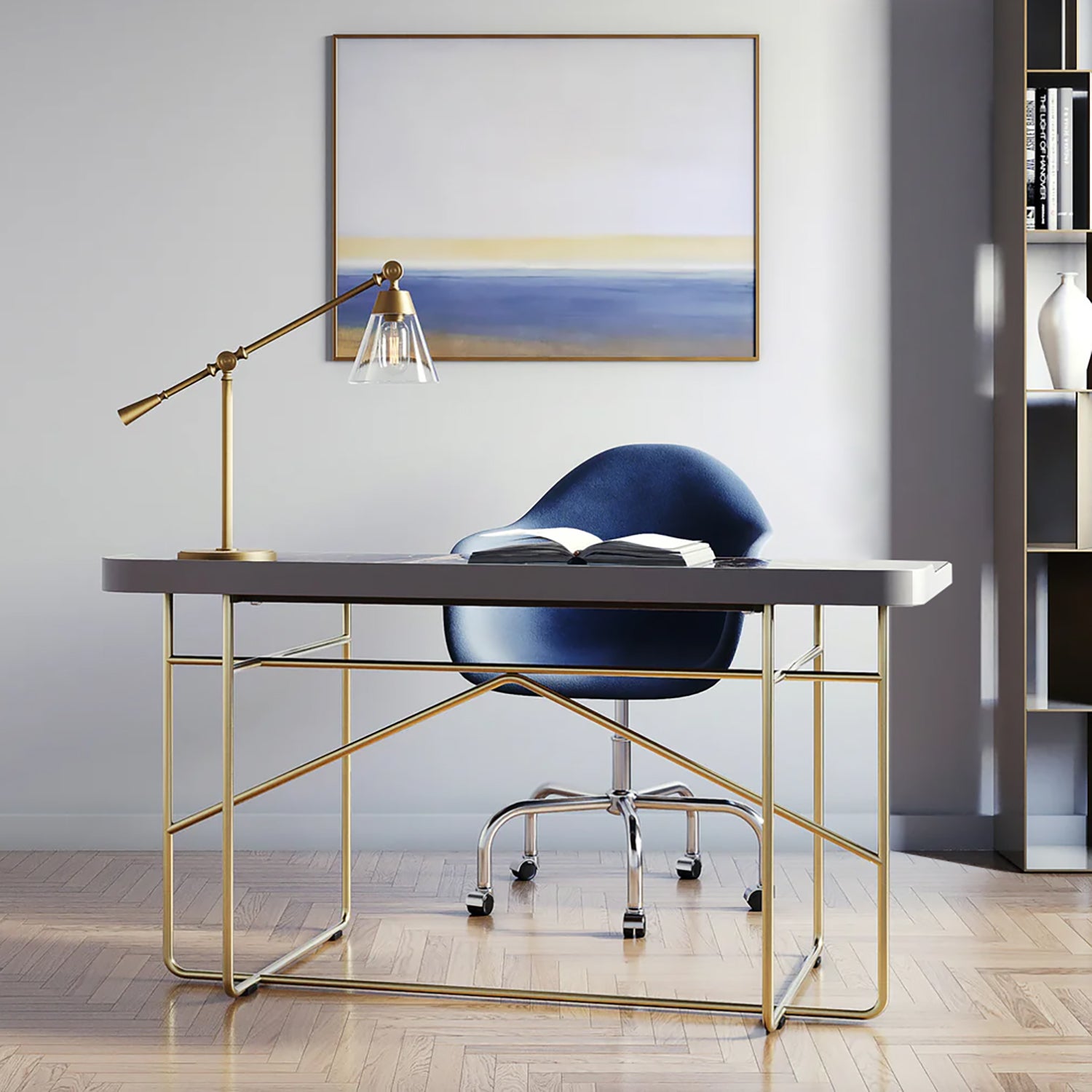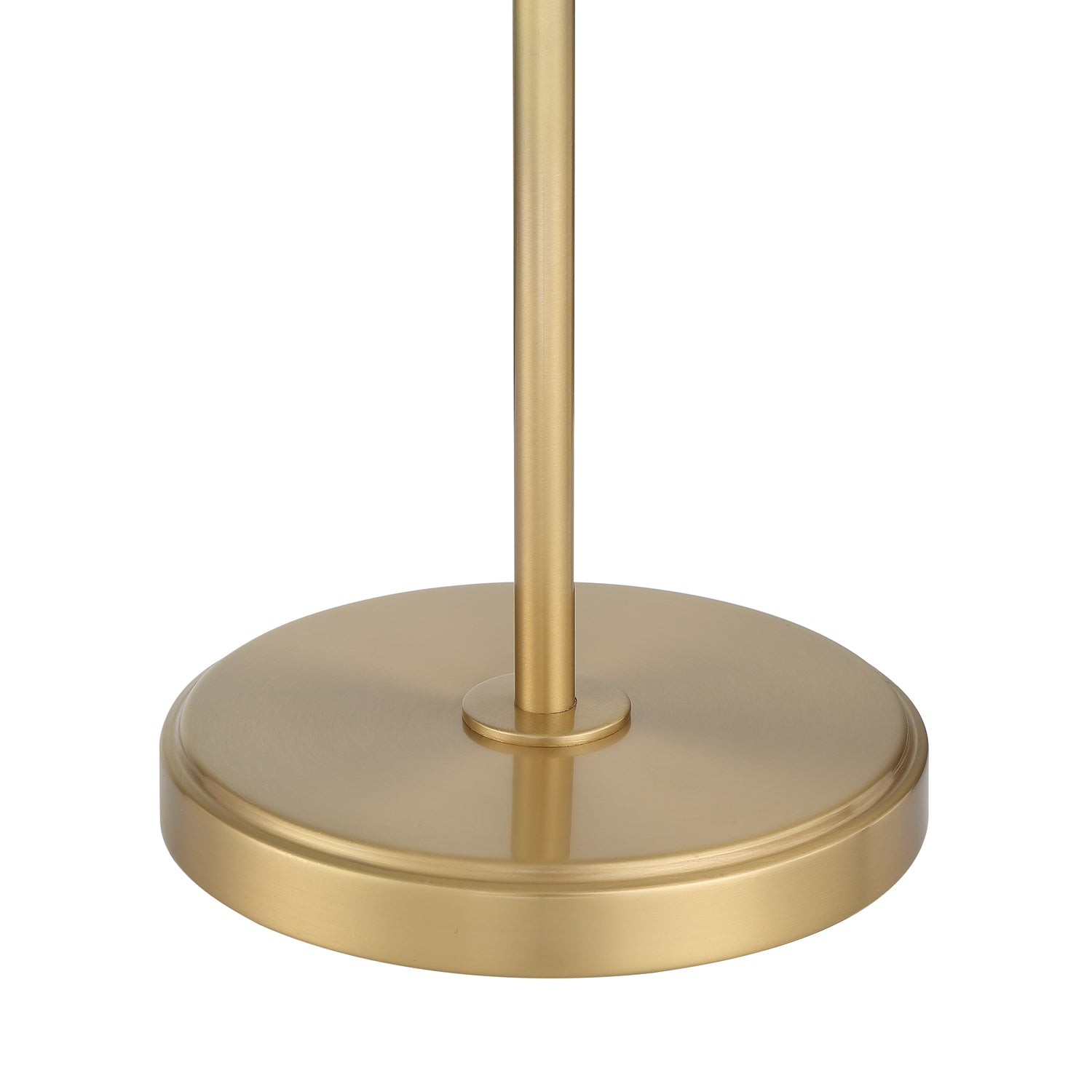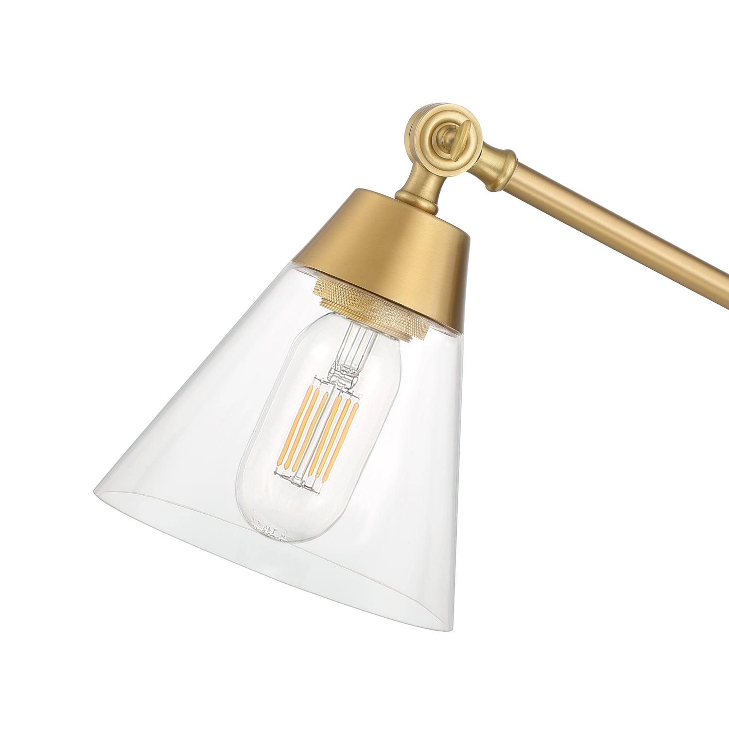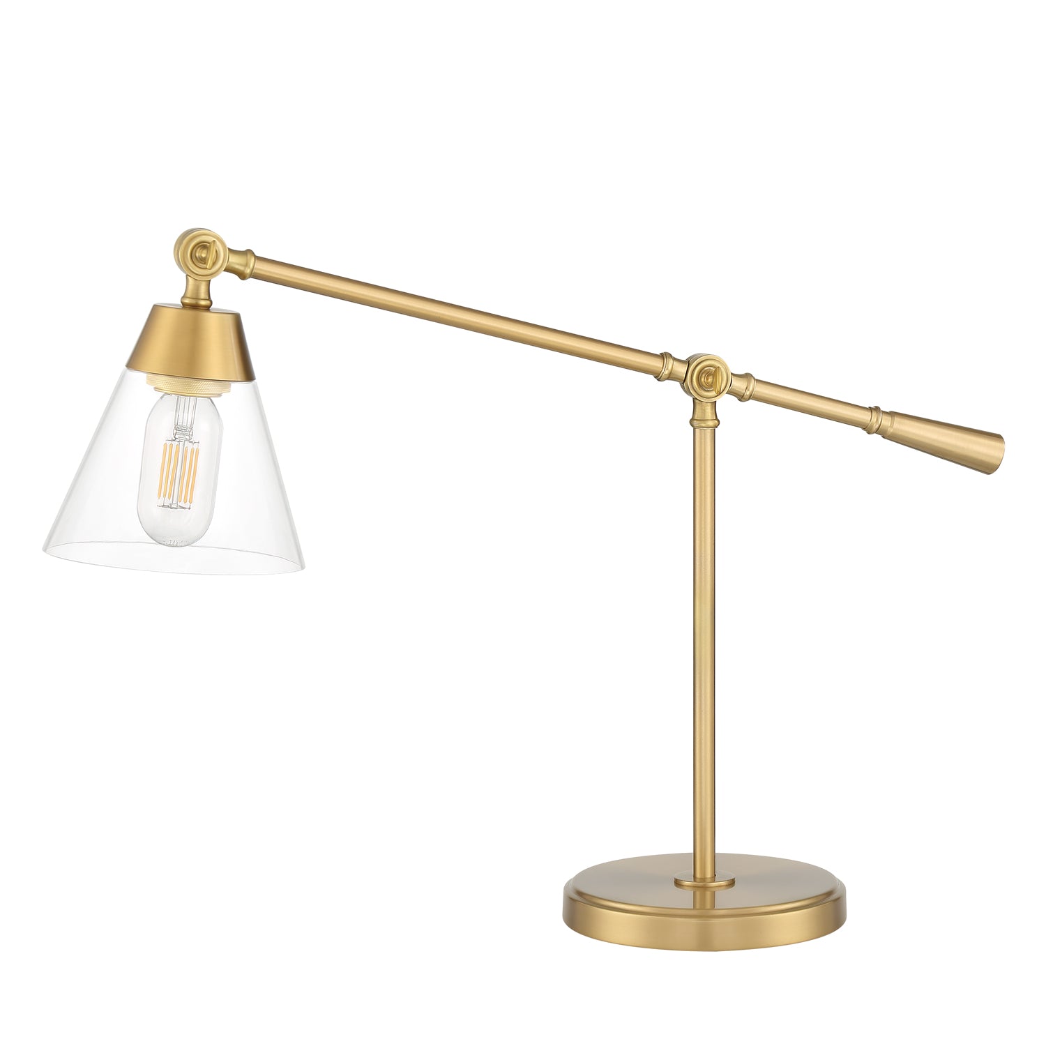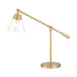 The Owen Table Lamp offers an elegant, modern approach with a distinct vintage style. A classic balance of modern farmhouse and industrial aesthetics and finished in a distinctive, warm satin brass, this table lamp balances versatility with an updated, bold style. The Owen is built with classic, lux materials and details; including masterly finished metal surfaces, crystal-clear tapered glass shades and a subtle black fabric cord. The details are updated and remarkable, movable arms and decorative keys at each joint allow for precision adjustment, embellishments along the arms and counterweight, and a smart on/of switch located on the power cord. The Owen is functional and striking, a perfect addition to chic homes or fashionable office spaces. This stylish lamp is a practical option for task lighting in your work from home refuge, or as a comfortable bedside reading lamp.