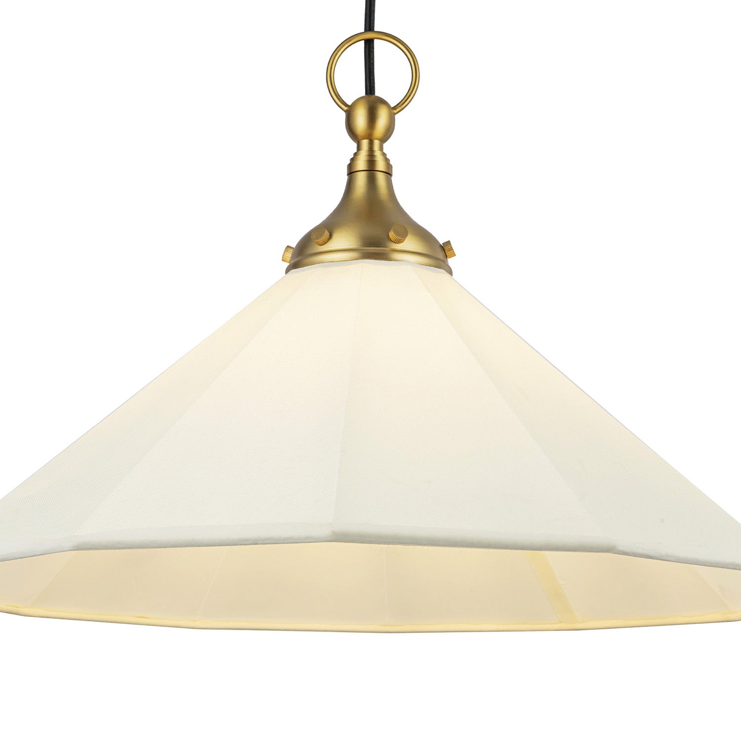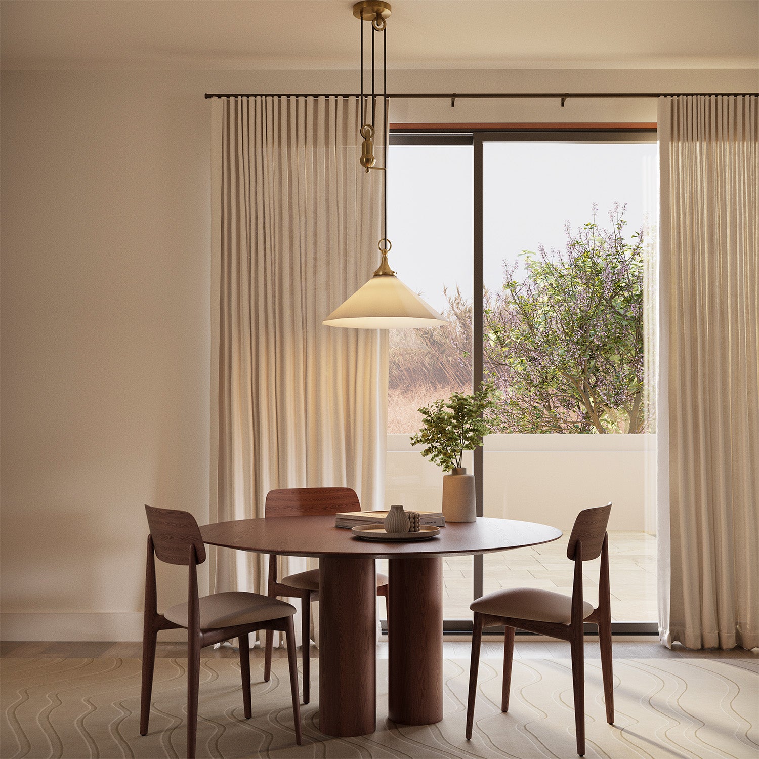 The Adele Pendant brings vintage industrial charm to interior spaces with its innovative pulley design. This distinctive fixture features a graceful, cone-shaped off-white linen shade that diffuses light beautifully while creating a warm, inviting atmosphere. The brushed brass hardware adds warmth and sophistication, with the functional pulley system allowing for easy height adjustment to suit your space. This thoughtfully engineered pendant combines historical industrial elements with refined finishes for a perfect blend of rustic and elegant. The adjustable design makes it ideal for dining areas, kitchen islands, or entry foyers, where you can raise or lower the light source to create the perfect illumination for any occasion.