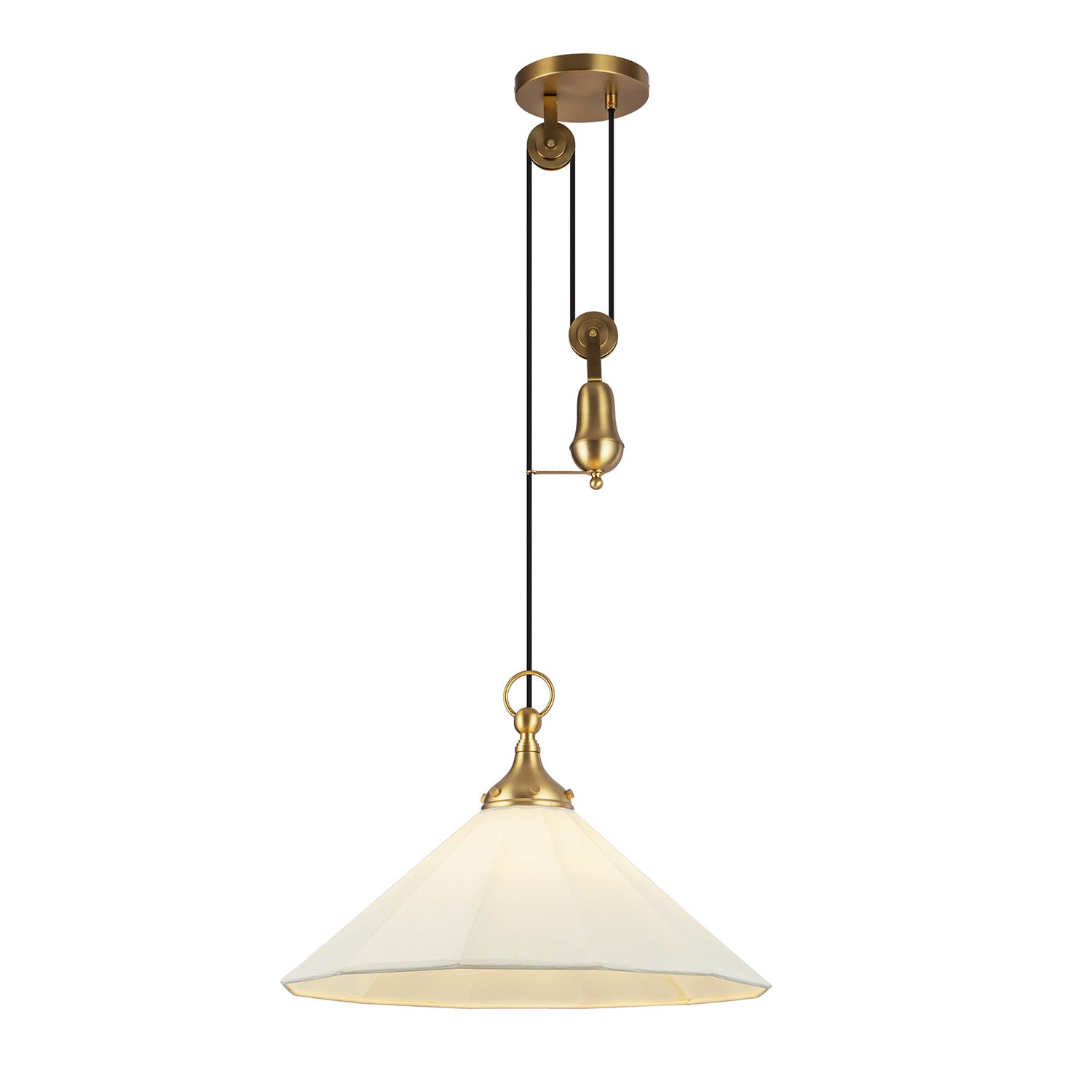 • Vintage-inspired adjustable pendant with functional pulley system in a brushed brass finish