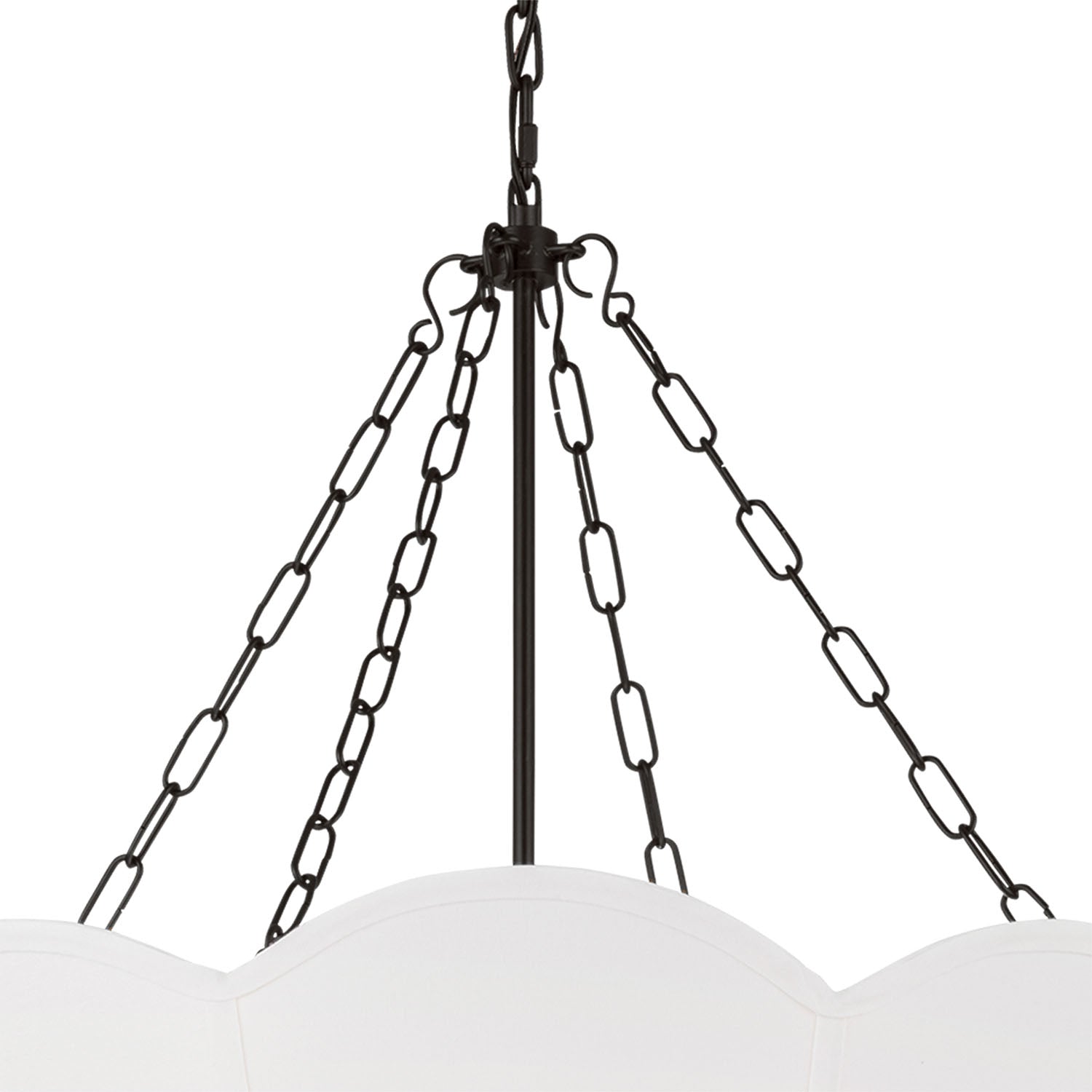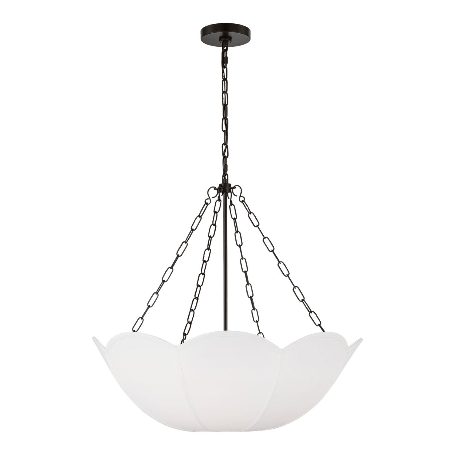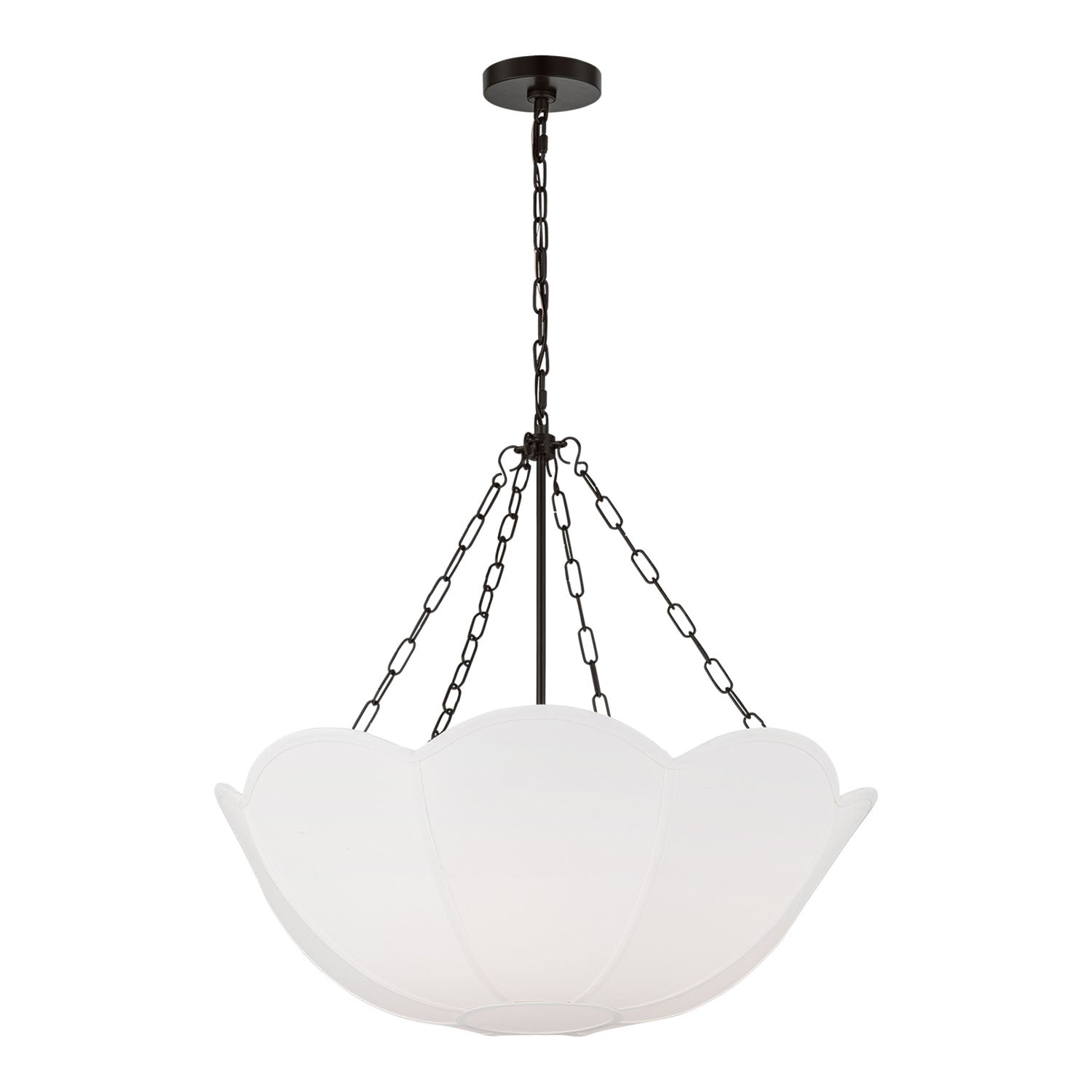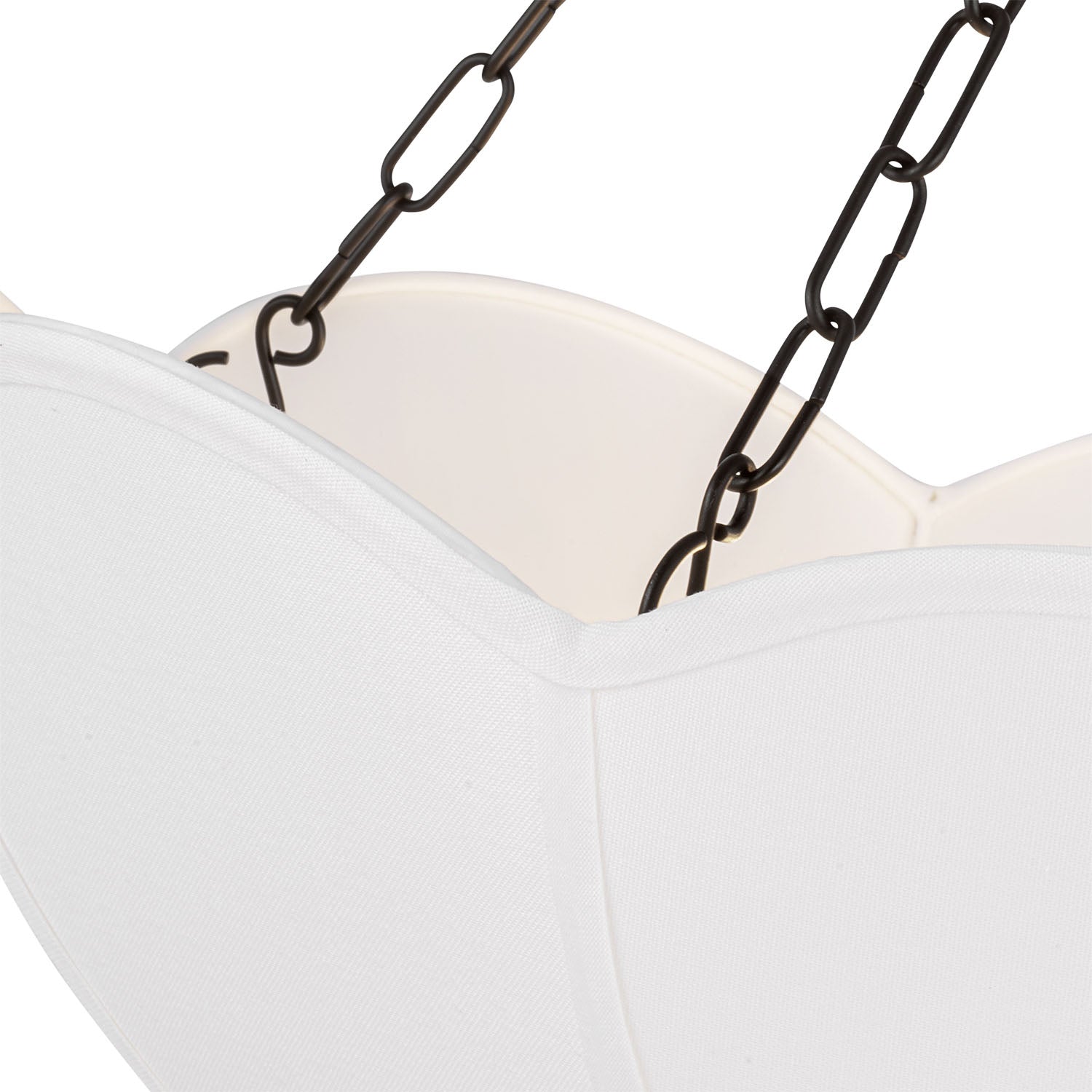 The Ava Pendant is reminiscent of a spring tulip, featuring a graceful silhouette that creates elegant illumination with organic charm and sophisticated presence. This refined 24" pendant showcases the beautiful contrast of metal chain detailing and white linen, creating a harmonious statement that enhances dining rooms, living spaces, entryways, foyers, and areas seeking substantial pendant lighting with distinctive appeal. The aged iron framework creates sophisticated depth against the curved form while the white linen shade provides soft, diffused illumination with natural elegance. With its damp-rated construction and flexible hanging height, this thoughtfully crafted pendant elevates any space with distinctive style and reliable performance.