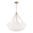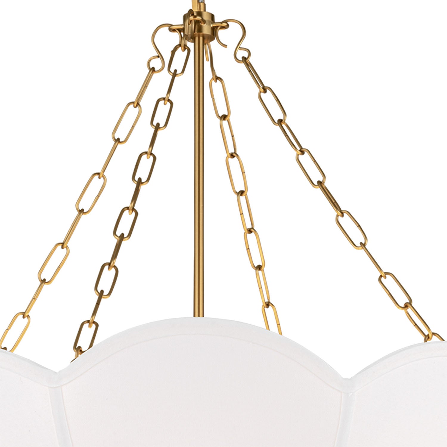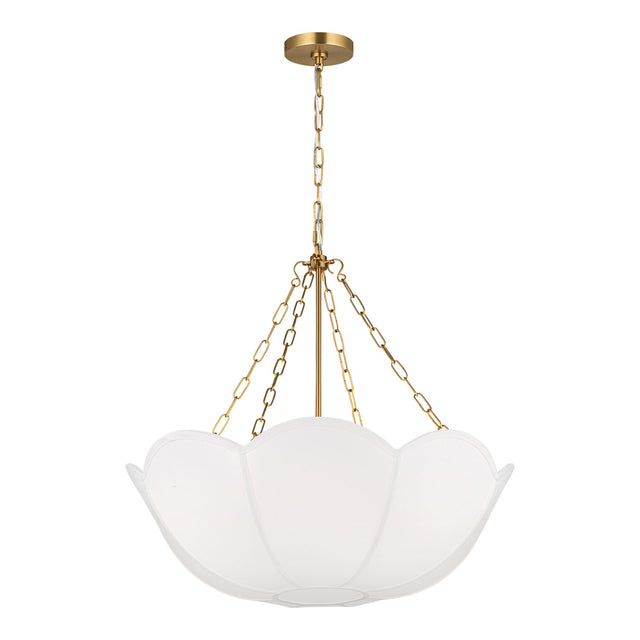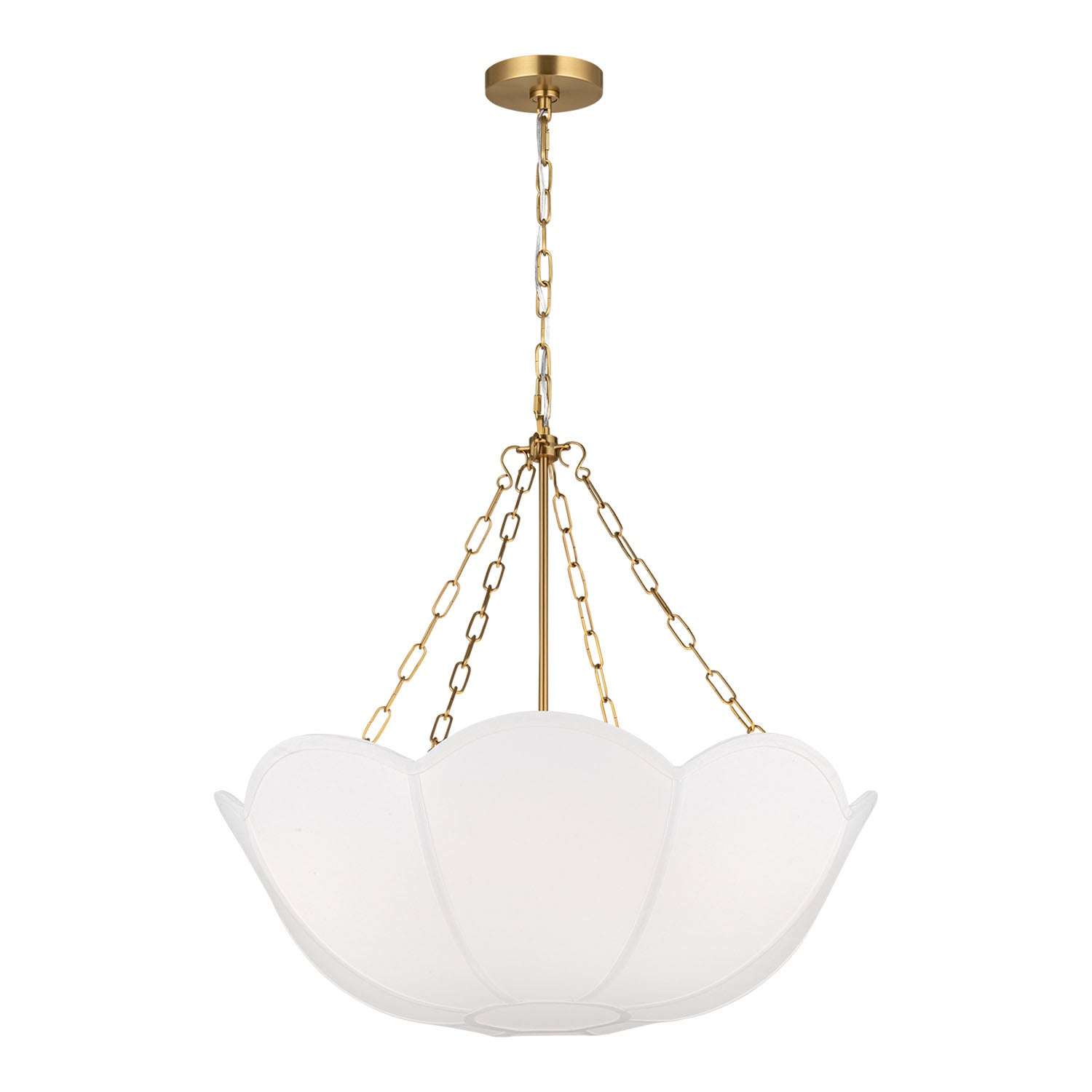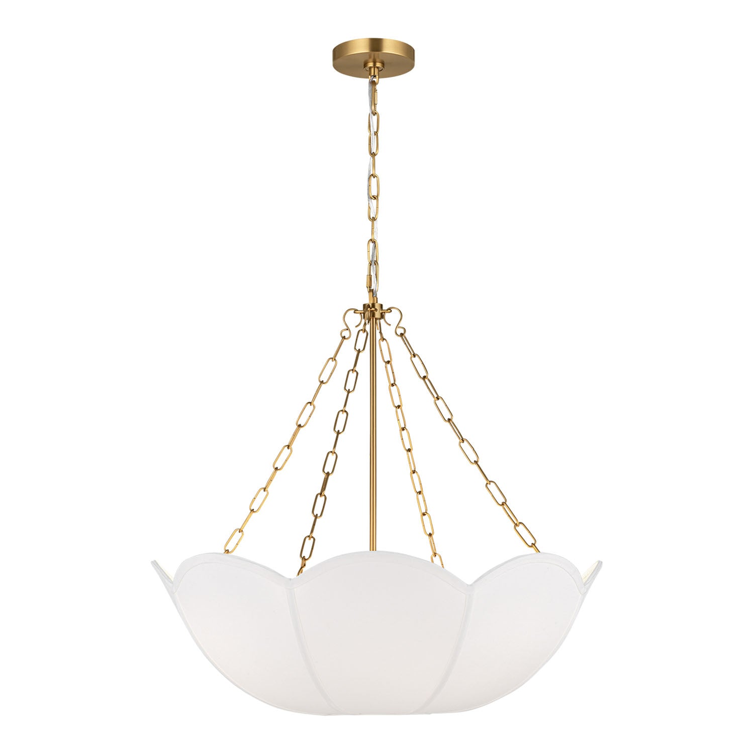 The Ava Pendant is reminiscent of a spring tulip, featuring a graceful silhouette that creates elegant illumination with organic charm and sophisticated presence. This refined 24" pendant showcases the beautiful contrast of metal chain detailing and white linen, creating a harmonious statement that enhances dining rooms, living spaces, entryways, foyers, and areas seeking substantial pendant lighting with distinctive character. The modern brass framework brings warm metallic sophistication to the curved form while the white linen shade provides soft, diffused illumination with natural elegance. With its damp-rated construction and flexible hanging height, this thoughtfully crafted pendant elevates any space with distinctive style and reliable performance.