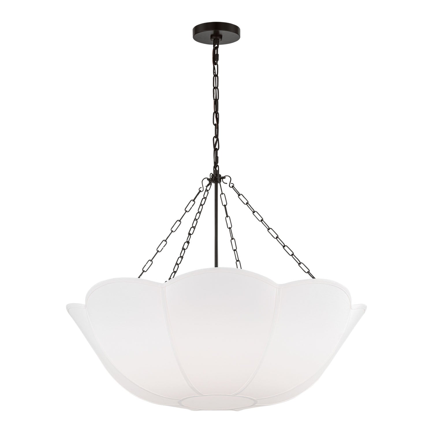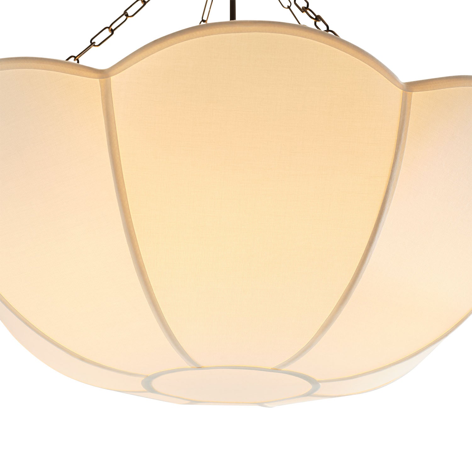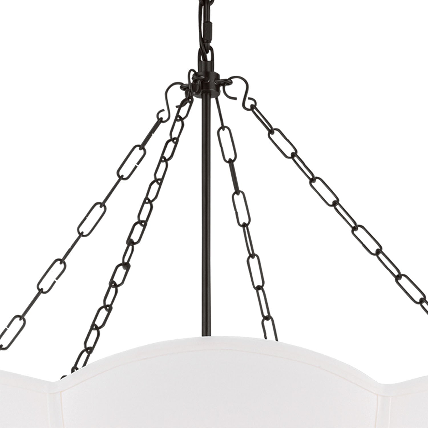 The Ava Pendant is reminiscent of a spring tulip, featuring a graceful silhouette that creates elegant illumination with organic charm and sophisticated presence. This refined 32" pendant showcases the beautiful contrast of metal chain detailing and white linen, creating a harmonious statement that enhances grand dining rooms, spacious living areas, large entryways, great rooms, and areas seeking statement pendant lighting with distinctive appeal. The aged iron framework creates sophisticated depth against the curved form while the white linen shade provides soft, diffused illumination with natural elegance. With its damp-rated construction and flexible hanging height, this thoughtfully crafted pendant elevates any space with distinctive style and reliable performance.