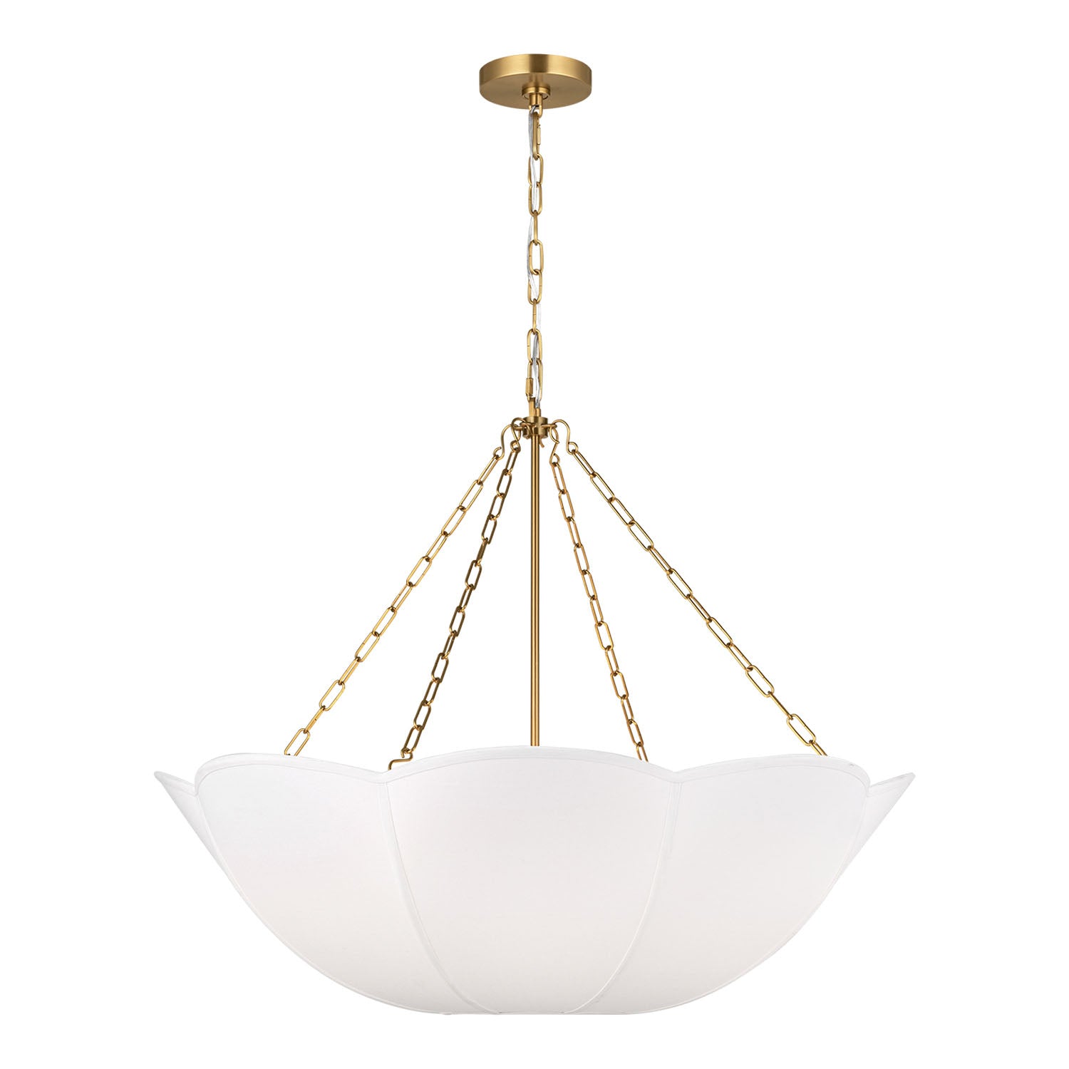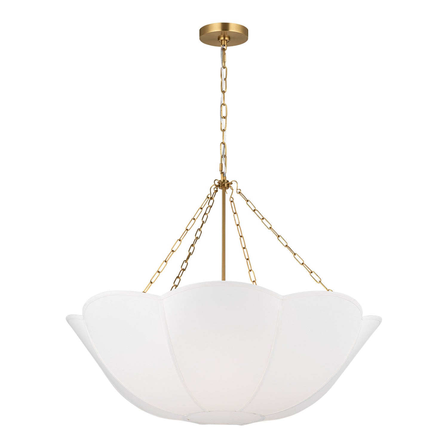 The Ava Pendant is reminiscent of a spring tulip, featuring a graceful silhouette that creates elegant illumination with organic charm and sophisticated presence. This refined 32" pendant showcases the beautiful contrast of metal chain detailing and white linen, creating a harmonious statement that enhances grand dining rooms, spacious living areas, large entryways, great rooms, and areas seeking statement pendant lighting with distinctive character. The modern brass framework brings warm metallic sophistication to the curved form while the white linen shade provides soft, diffused illumination with natural elegance. With its damp-rated construction and flexible hanging height, this thoughtfully crafted pendant elevates any space with distinctive style and reliable performance.