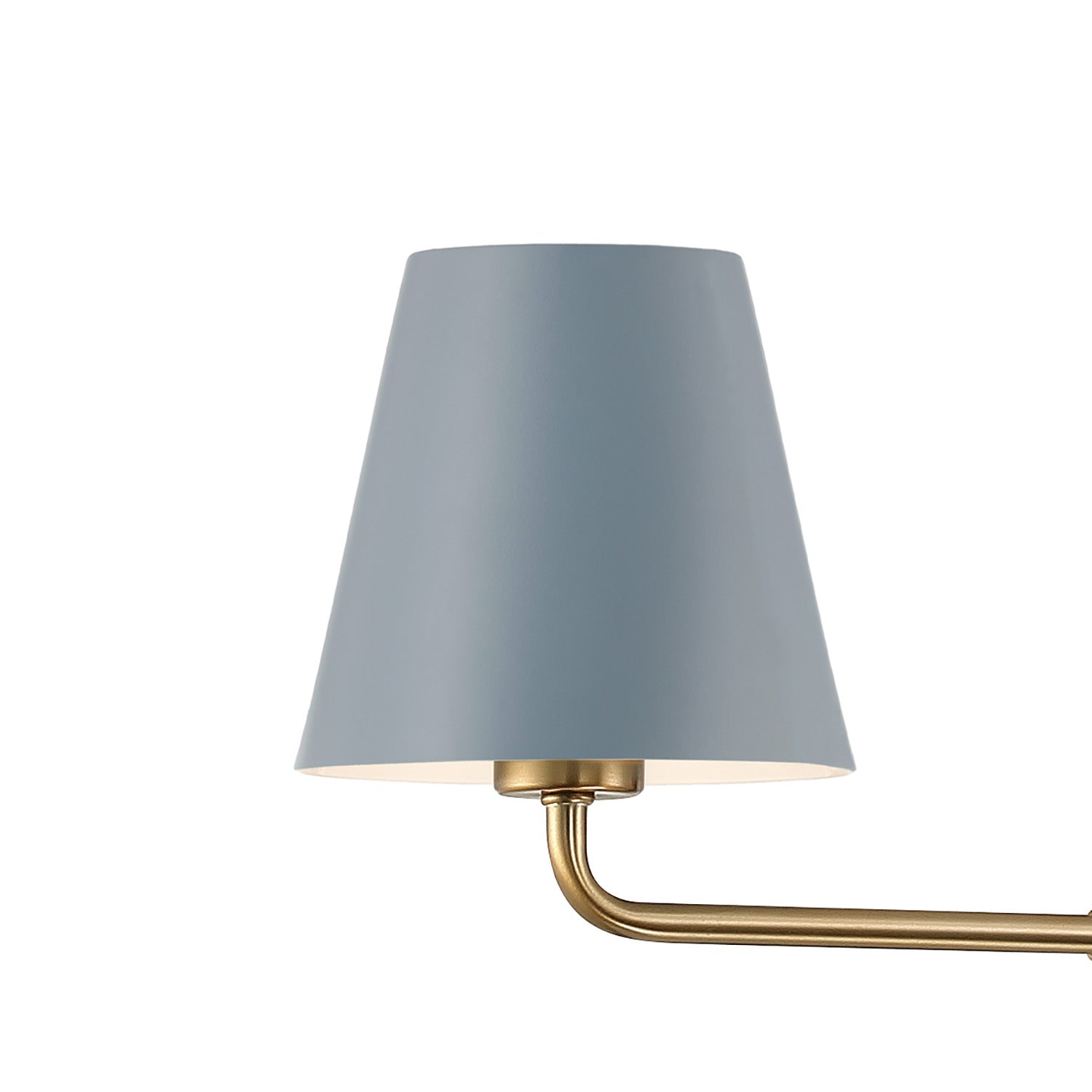The Banks 2 Shade Linear Pendant blends modern sophistication with a refined touch of color. Featuring two French blue conical metal shades with white interiors and a brass body, this 42" wide pendant directs focused light where it’s needed, creating both ambiance and functionality. The combination of French blue and brass adds warmth and contemporary style, effortlessly complementing both industrial and modern interiors. Its sleek, minimal profile and linear design emphasize horizontal space while maintaining a clean, uncluttered aesthetic—perfect for enhancing dining areas, kitchen islands, or long tables.