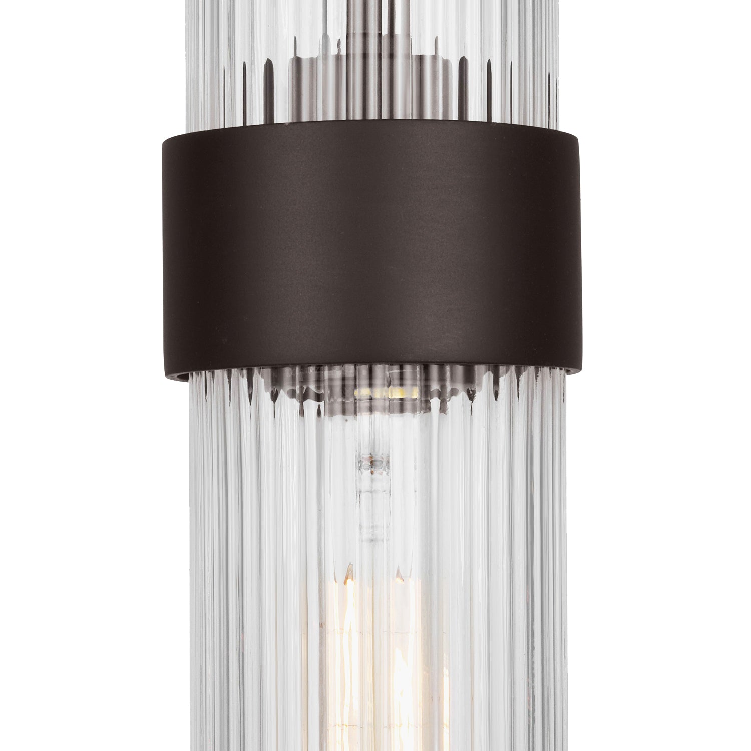 The Barclay Small Pendant makes a sophisticated statement with its elegant, vertical design. A single clear fluted glass shade forms a refined look that is beautifully accented by a bold metal band. The fixture is thoughtfully designed to cast a unique, diffused glow, providing ample illumination for a kitchen island, entryway, or hallway. With its ETL damp rating and sloped ceiling compatibility, it adds both functional beauty and versatile appeal to any interior. The deep Aged Iron finish brings a classic, timeless feel that beautifully complements the fixture's elegant silhouette. This striking pendant is a perfect blend of style and functionality, adding a touch of refined elegance to your interior.