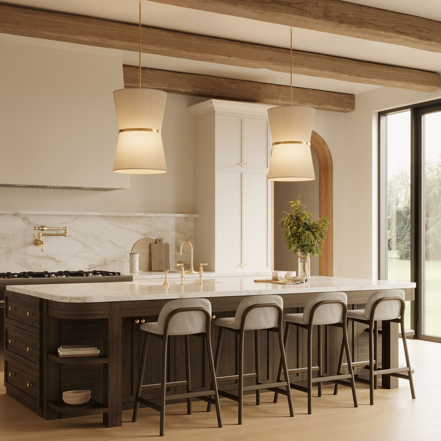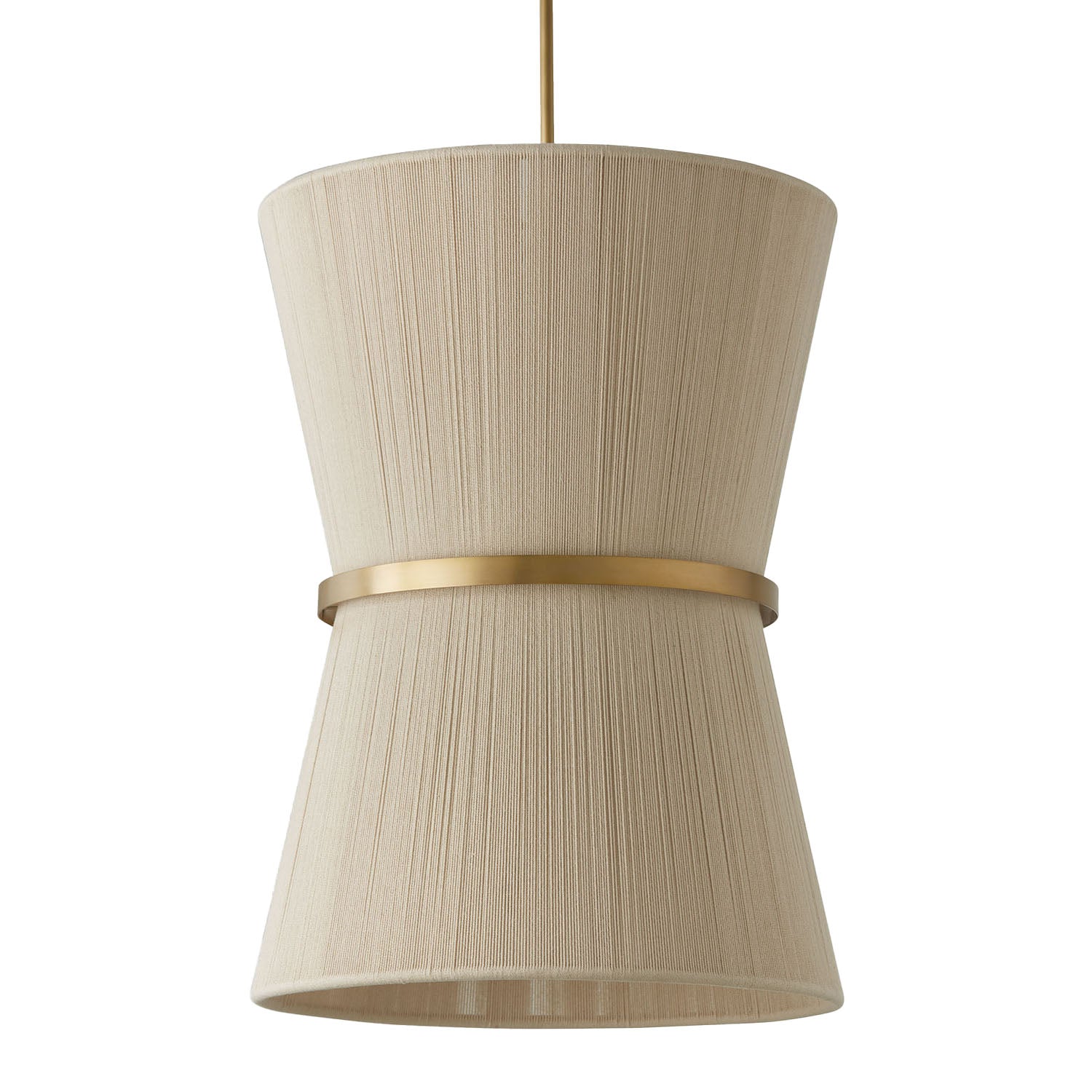 The Beacon Pendant brings artisanal luxury to any space with its impressive hourglass silhouette and refined patina brass with natural rope finish. The aged patina brass complements the natural rope wrapping to create warm, textured illumination perfect for dining rooms, great rooms, or spacious living areas. Featuring a substantial double-cone form enhanced by handcrafted rope detailing, this commanding fixture delivers both organic character and modern elegance with timeless appeal. The patina brass finish creates weathered richness that elevates any space with artisanal sophistication. The Beacon pendant combines textural craftsmanship with refined materials to create a distinctive lighting centerpiece that brings handcrafted elegance to your space.
