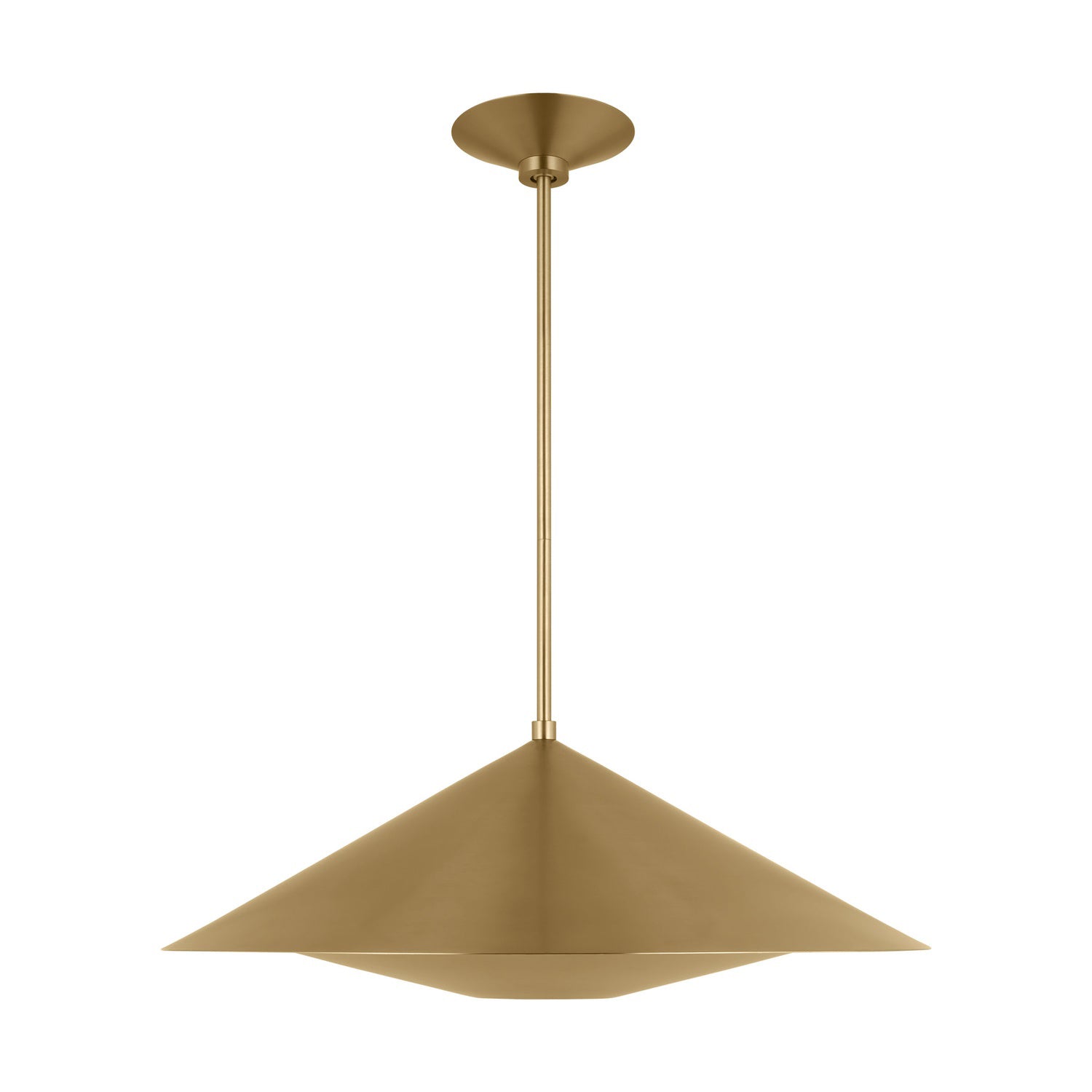 The Belvin Large Pendant features expertly crafted spun metal construction that creates a refined conical silhouette with a clean, minimalist aesthetic throughout the space. This sophisticated 24" pendant delivers innovative dual illumination with direct downlighting and gentle indirect light that washes from within the shade's interior, perfect for dining rooms, kitchen islands, living spaces, and areas seeking substantial statement pendant lighting with commanding presence. The modern brass finish brings warm metallic sophistication to the sleek conical form while accommodating standard bulbs for flexible lighting options. Drawing inspiration from classic small-aperture fixtures while embracing contemporary design principles, this large-scale pendant elevates any space with streamlined elegance and impressive visual impact.