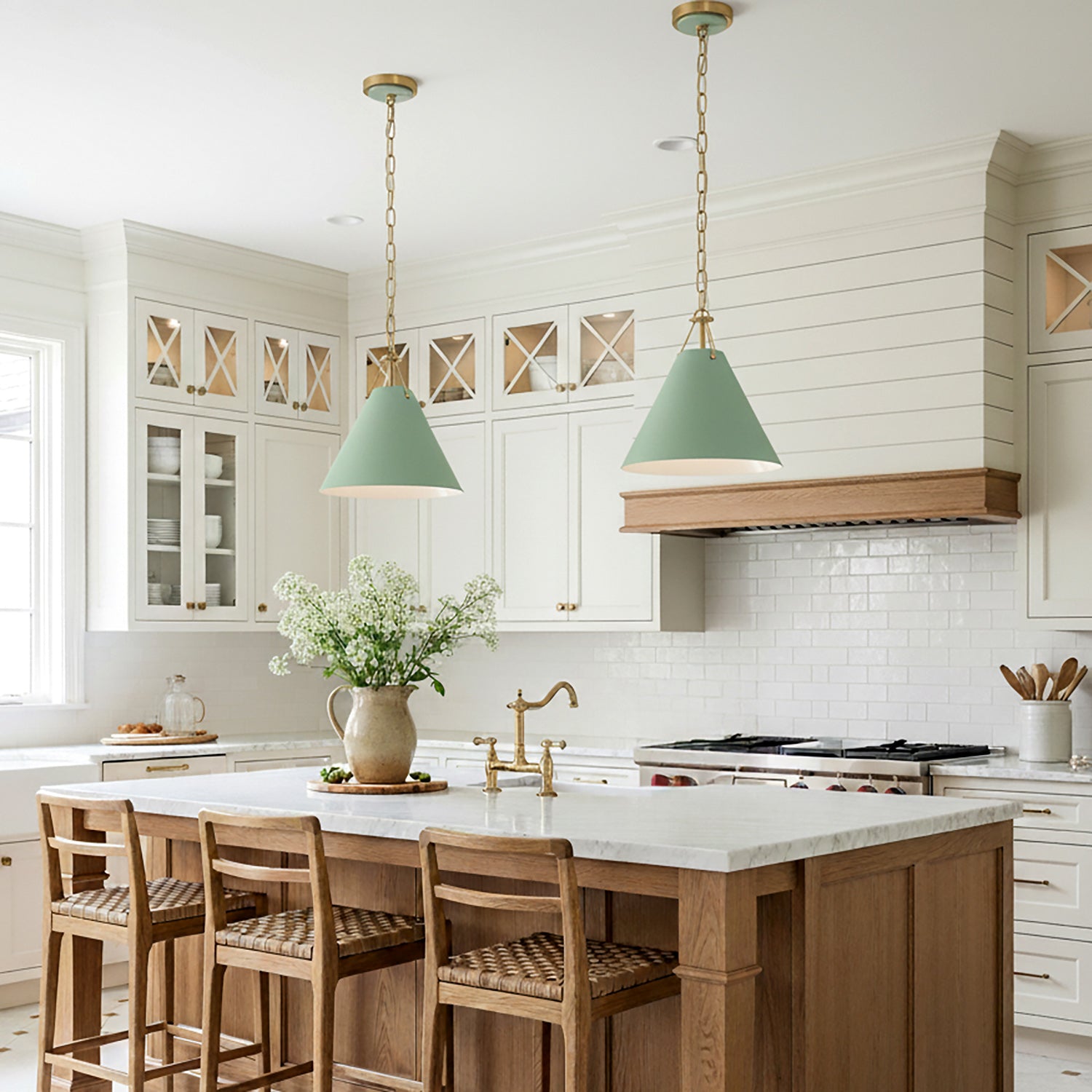 • A single-bulb pendant light with a conical metal shade, finished in sage green with brass detailings, and a crisp white interior for enhanced illumination.