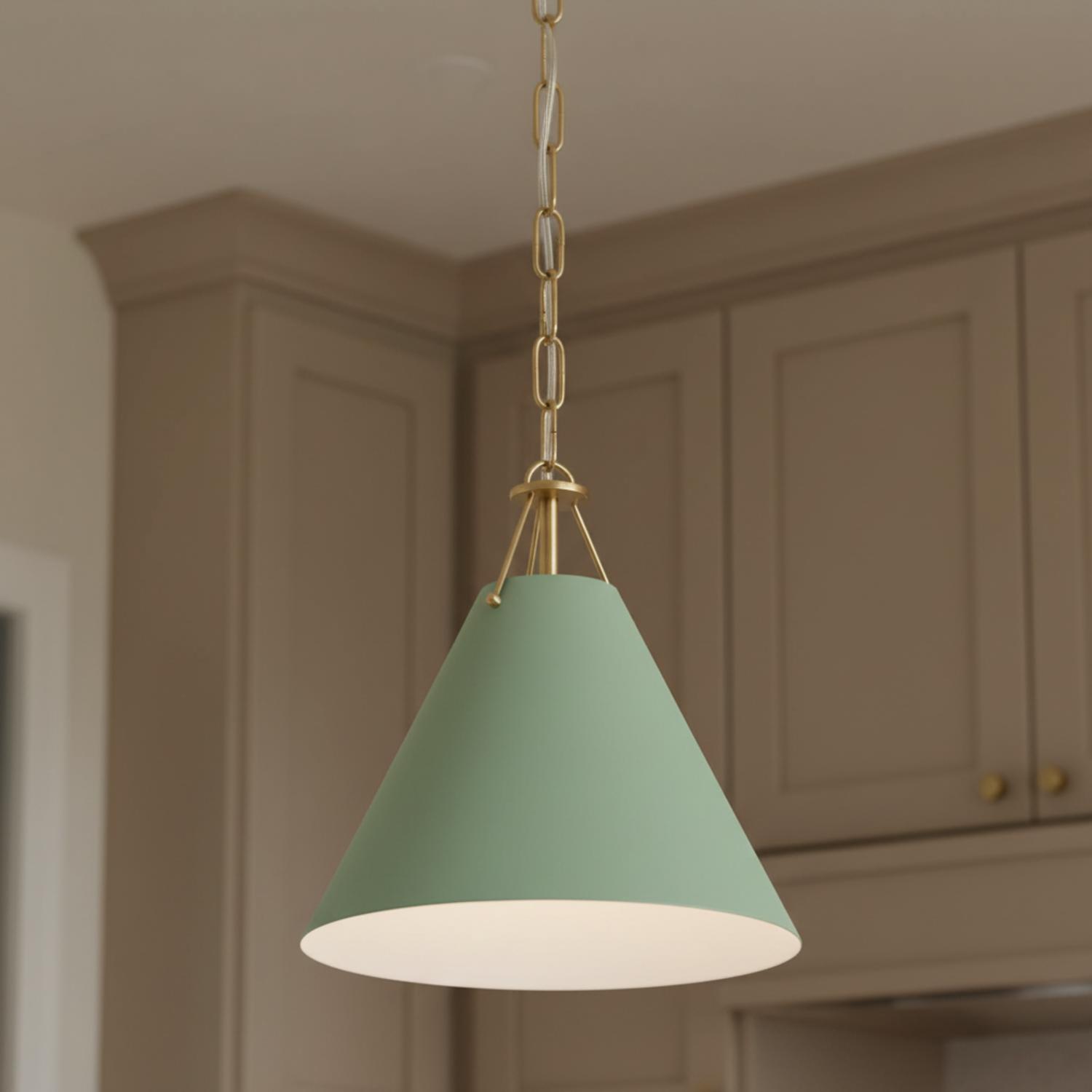 The Bowie Small 12" Metal Pendant adds a refined touch with its sleek conical shade in a vibrant sage green finish, complemented by aged brass accents for a warm, inviting contrast. The white interior enhances illumination, casting a focused downward light ideal for task lighting. Perfectly scaled for smaller spaces, this pendant makes a bold statement on its own or in multiples over kitchen islands, breakfast bars, or dining tables. Designed for versatility, it features an adjustable hanging height for a customized fit. With its elegant blend of color and brass details, the Bowie seamlessly integrates into a variety of interiors, offering the perfect balance of form and function.