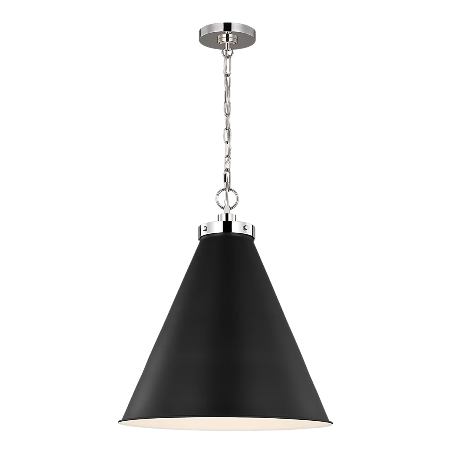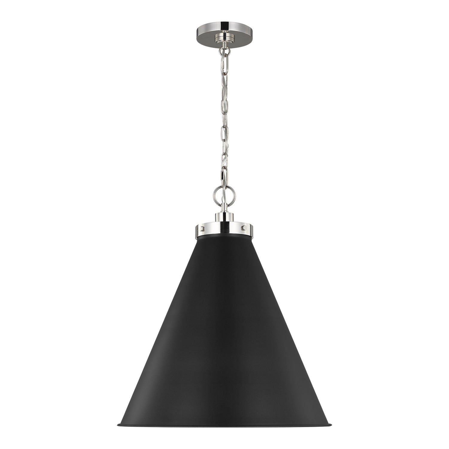 The Classon Large Pendant makes a bold statement with its substantial form and minimalist appeal. This impressive fixture features a bold matte black cone shade suspended from a clean, polished nickel chain, creating a versatile centerpiece that is both grand and sophisticated. Its generous scale and thoughtful design provide powerful downward illumination, making it an ideal choice for larger dining areas, grand entryways, or open-concept living spaces where a significant and stylish light is needed. With its commanding presence and timeless finish, this pendant brings a layer of curated style and refined function to any interior.