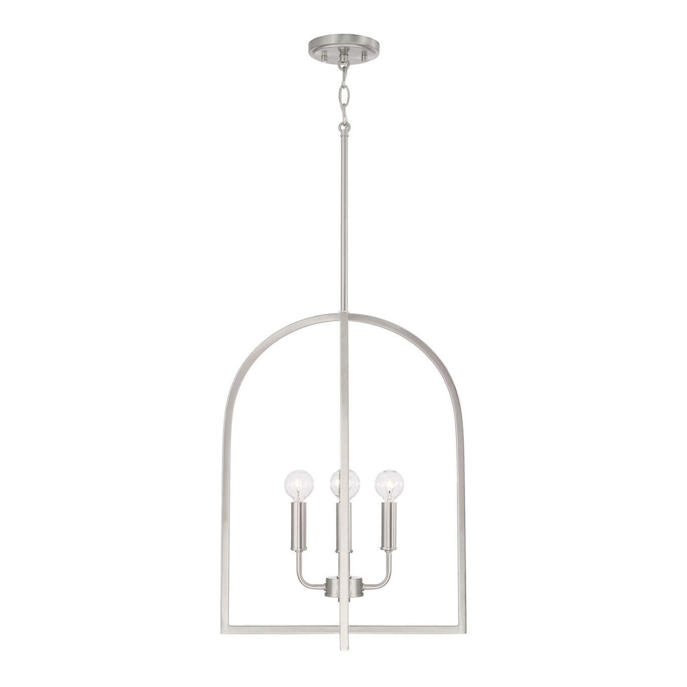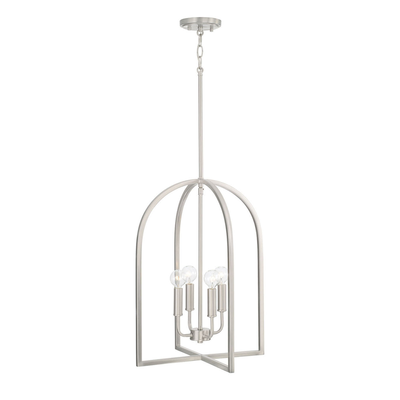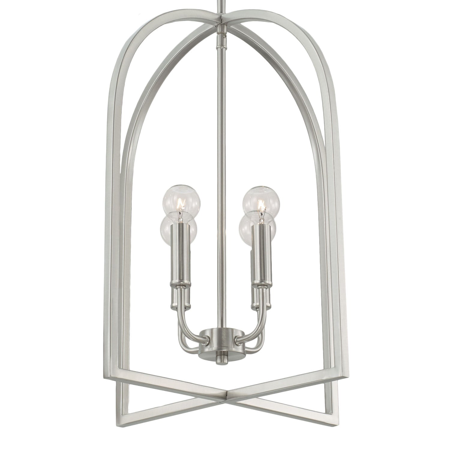 • Arched lantern design with a brushed nickel finish featuring an open cage frame and four candelabra bulbs