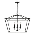 • Farmhouse design with textured black finish featuring large open cage frame and four candelabra bulbs