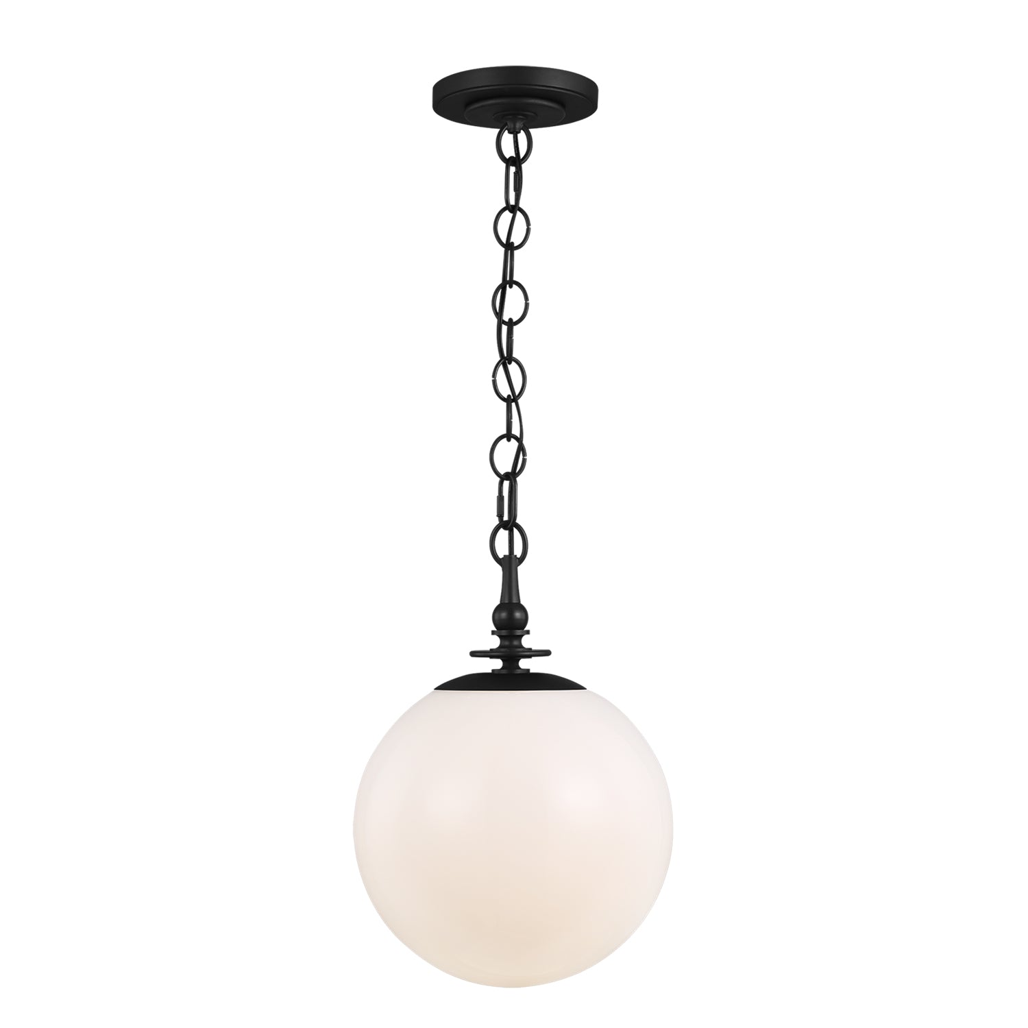 • Timeless globe pendant with a classic silhouette and a white glass globe shade
