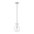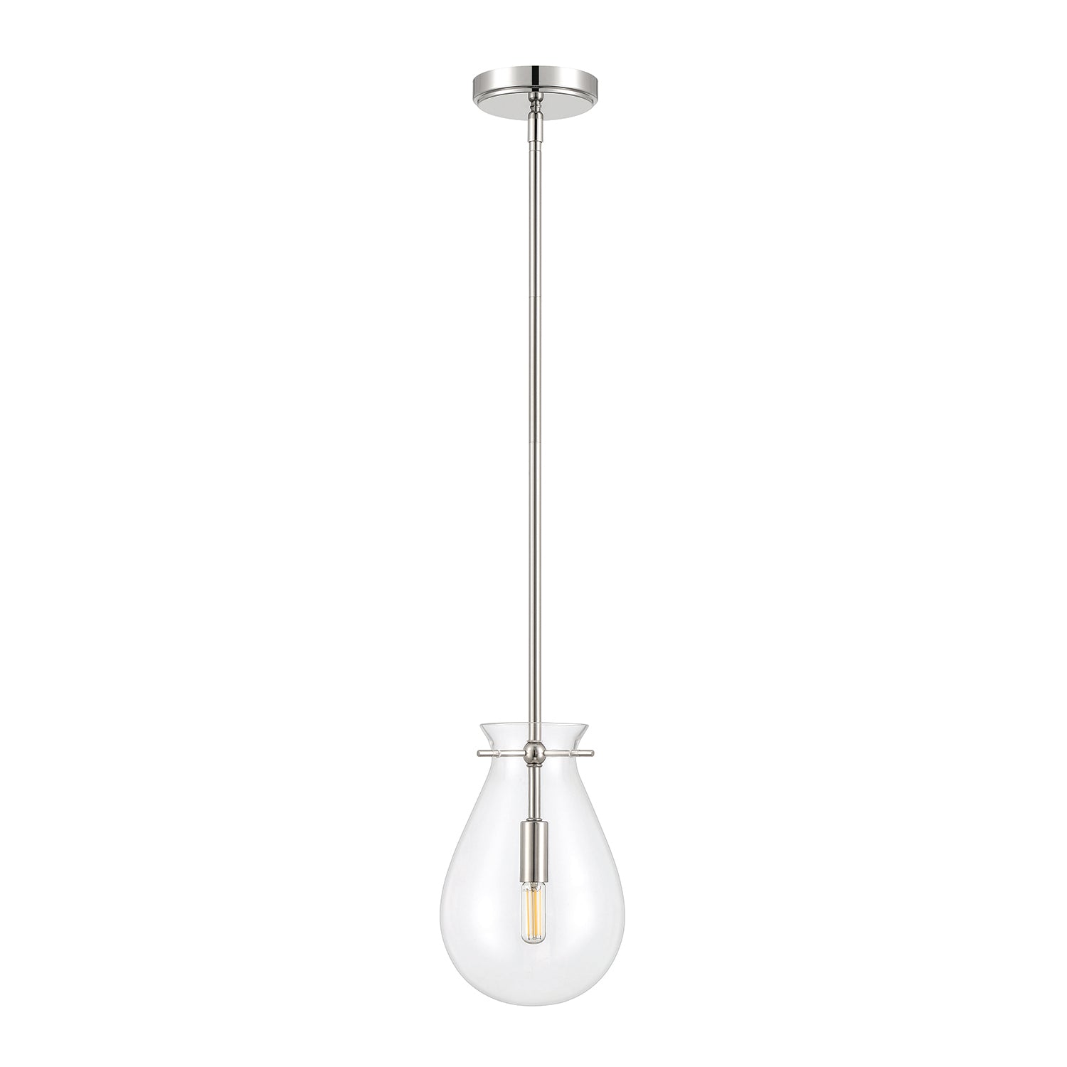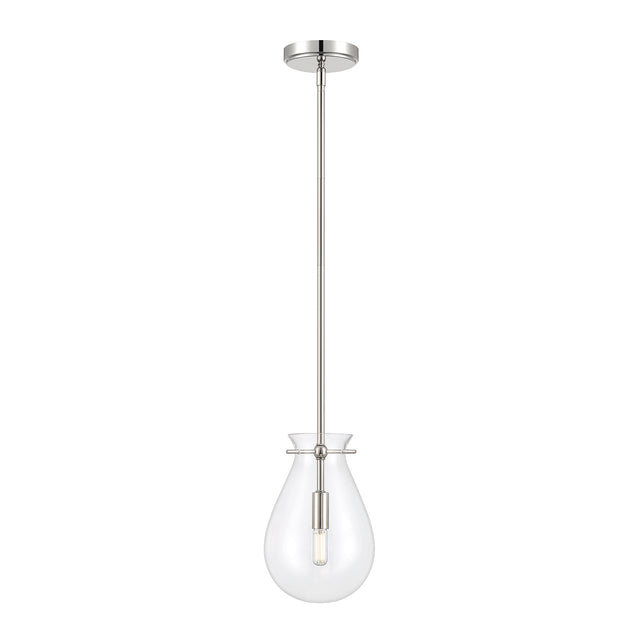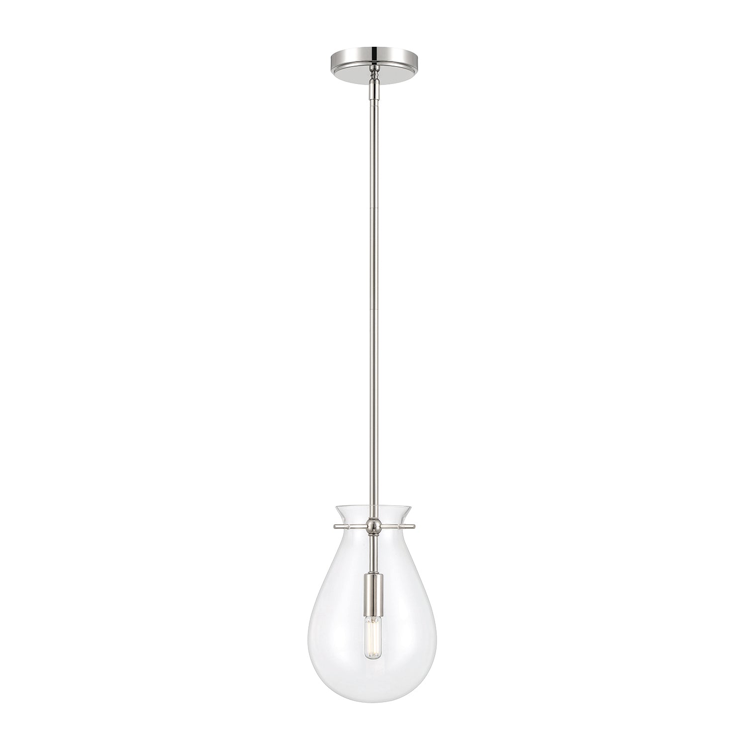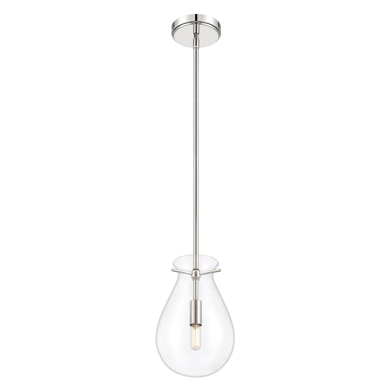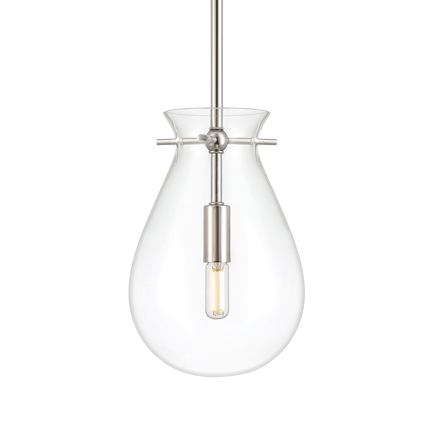 This refined and contemporary pendant adheres to the "less is more" principle. Features a clear, tear drop shaped glass shade surrounding a smooth metal socket, and suspended by elegant side pins. Adjustable down rods and a finely detailed circular canopy support this chic silhouette - all in a gleaming polished nickel finish. This updated fixture pairs superior materials with exceptional style, for a look that is both timeless and chic. Perfect for an entryway, above a small dining table, or in multiples above a kitchen island.