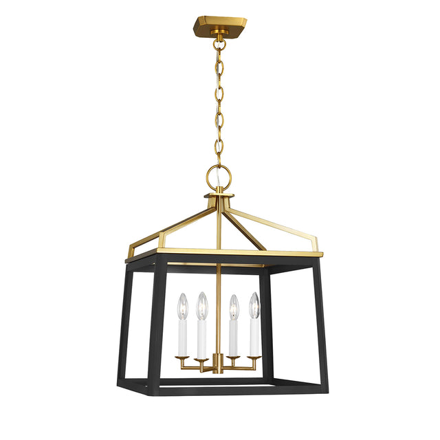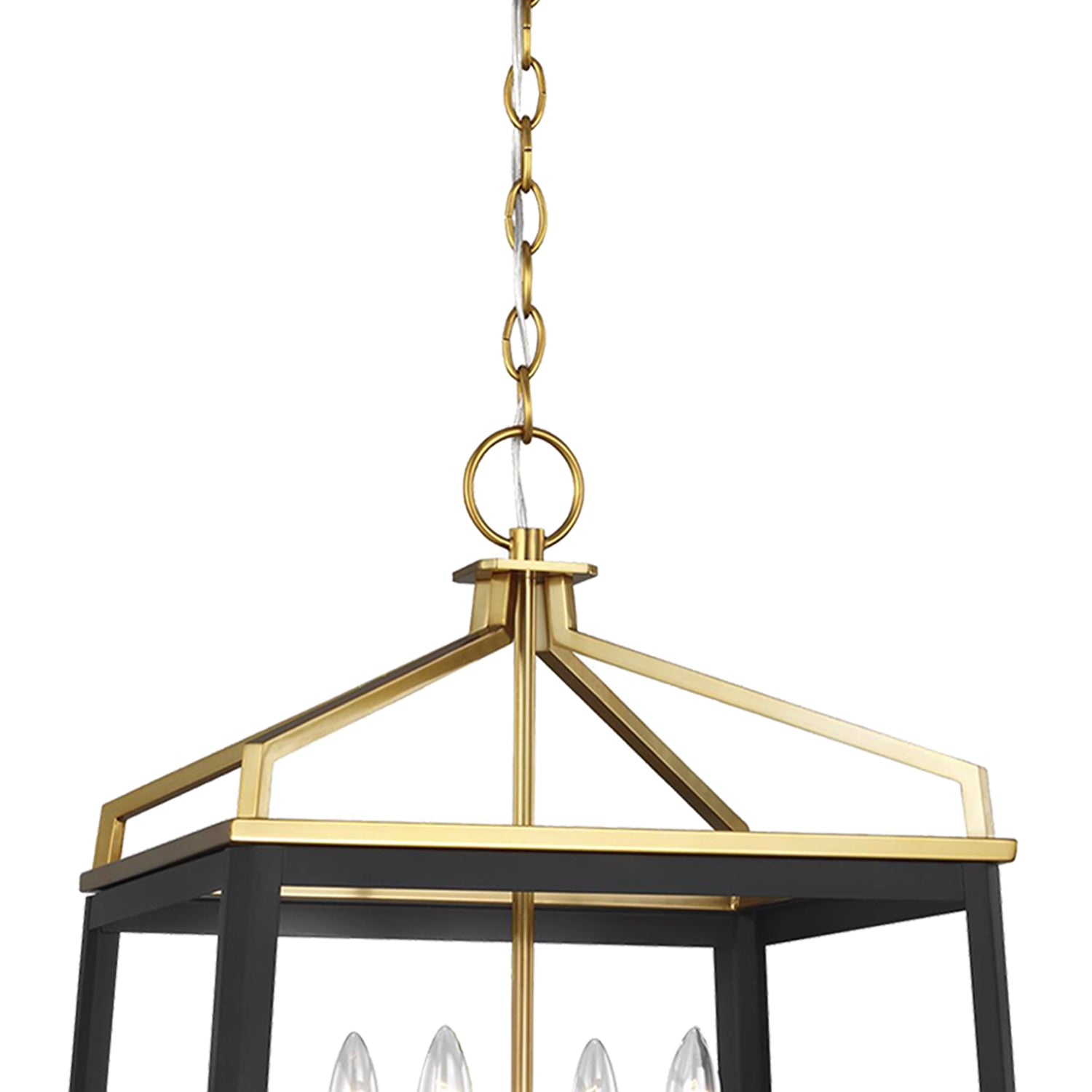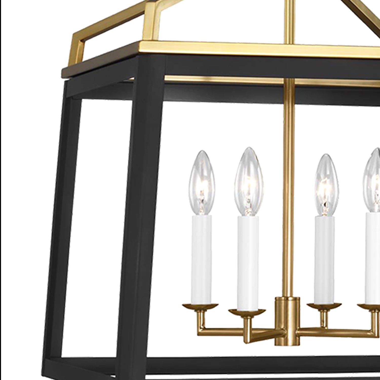 The Fillmore Large Lantern Pendant makes a refined statement with its traditional form and timeless appeal. Its beautifully tapered square silhouette is suspended from a clean-lined modern brass frame, creating a striking lantern design. This commanding fixture is thoughtfully designed with a four-light candelabra cluster, providing sophisticated illumination that is perfect for a grand entryway, living room, or covered porch. The sophisticated two-tone finish of a matte black exterior and a warm modern brass frame creates a high-contrast statement that adds both functional beauty and enduring style to any space.