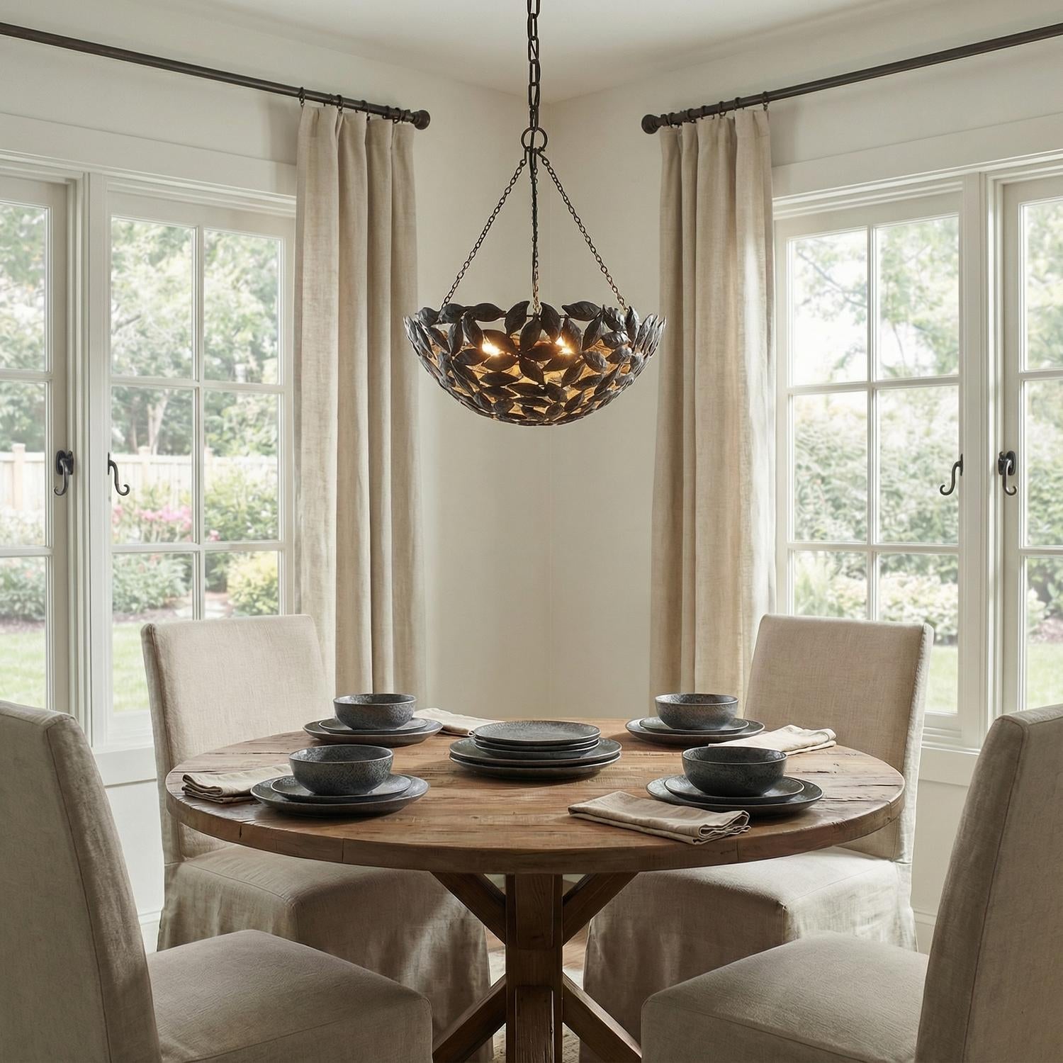 The Floren Small Pendant brings vintage-inspired elegance to any space with its elegant leaf motif and graceful bowl silhouette that instantly elevates interiors with classic appeal. This beautifully detailed fixture features meticulous craftsmanship that creates a captivating focal point with timeless sophistication. Perfect for dining areas, breakfast nooks, and intimate spaces where radiant beauty meets enduring style. The aged iron finish adds dramatic character that enhances the intricate leaf detailing, while the classic bowl design provides beautiful ambient illumination. With its elegant craftsmanship and vintage-inspired design, this pendant brings radiant beauty to any interior.