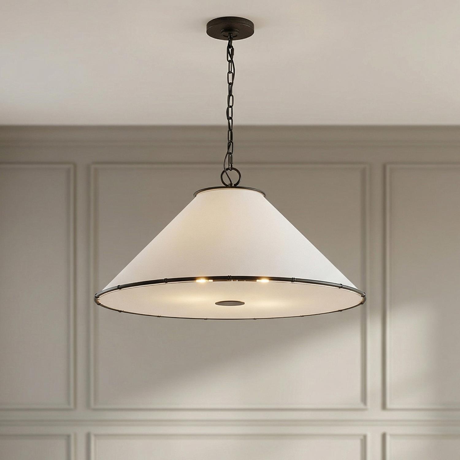 The Gael Large Pendant in Aged Iron delivers commanding sophistication with its expansive conical silhouette and distinctive metal rim framework that brings dramatic elegance to any space. This expertly crafted 28" pendant features bamboo-inspired metal rims that circle both the top and bottom of the white silk shade, adding structural definition to the silhouette while creating warm, diffused illumination that eliminates glare. Perfect for large kitchen islands, spacious dining areas, grand entryways, and open floor plans seeking statement lighting with classic charm, this fixture offers full dimming capability to suit various lighting needs. The rich aged iron finish complements both contemporary and industrial interiors with sophisticated appeal. With its damp-rated construction and straightforward installation, this thoughtfully designed pendant elevates any interior with enduring style and reliable performance.
