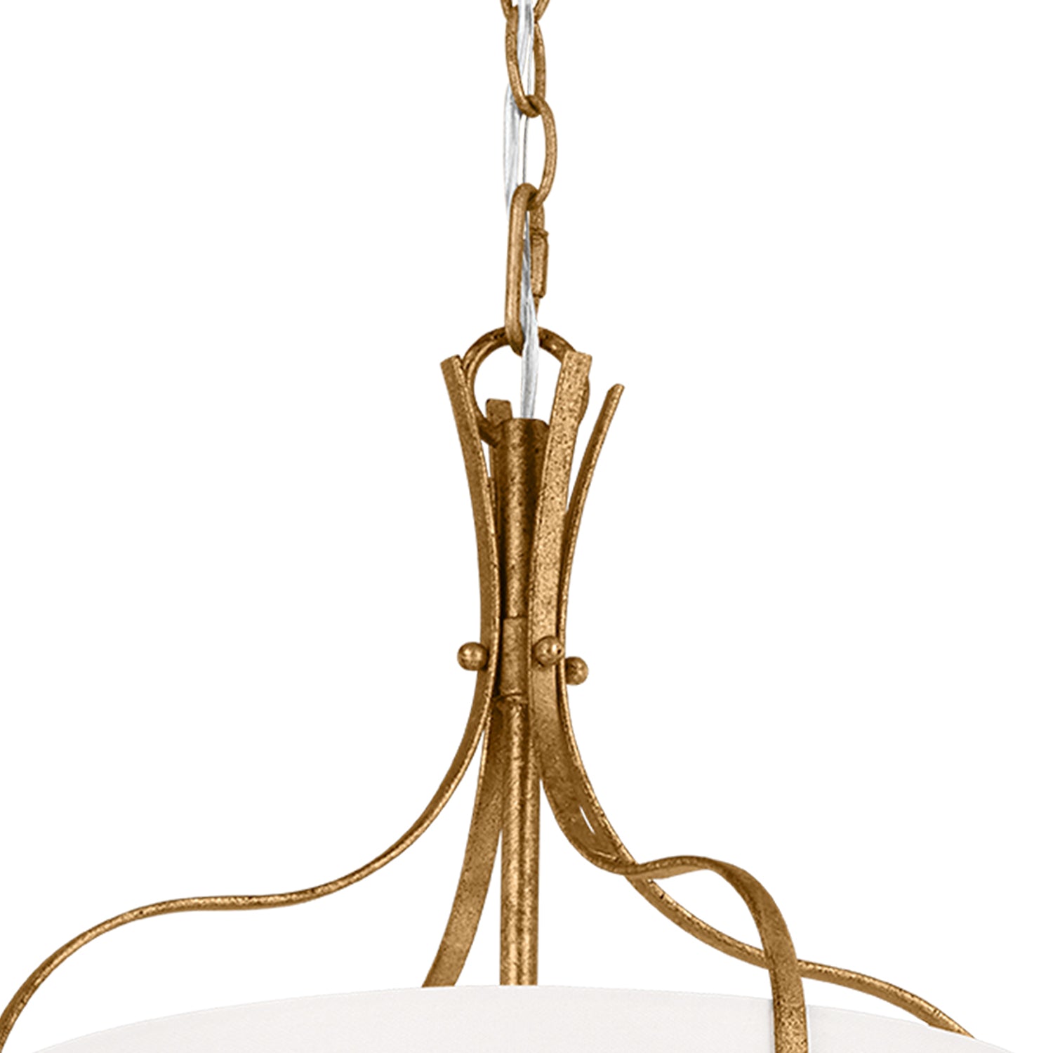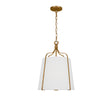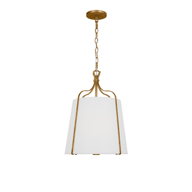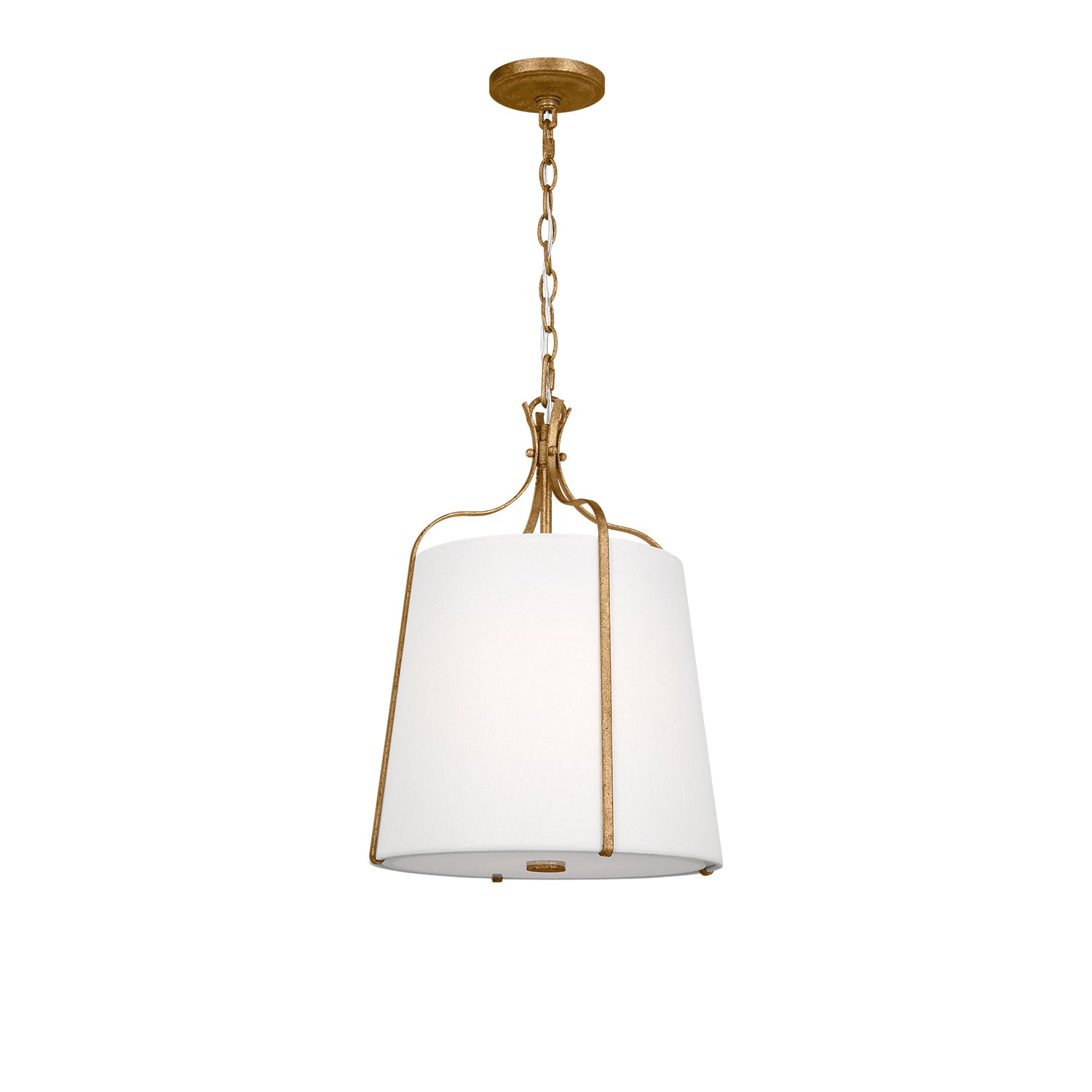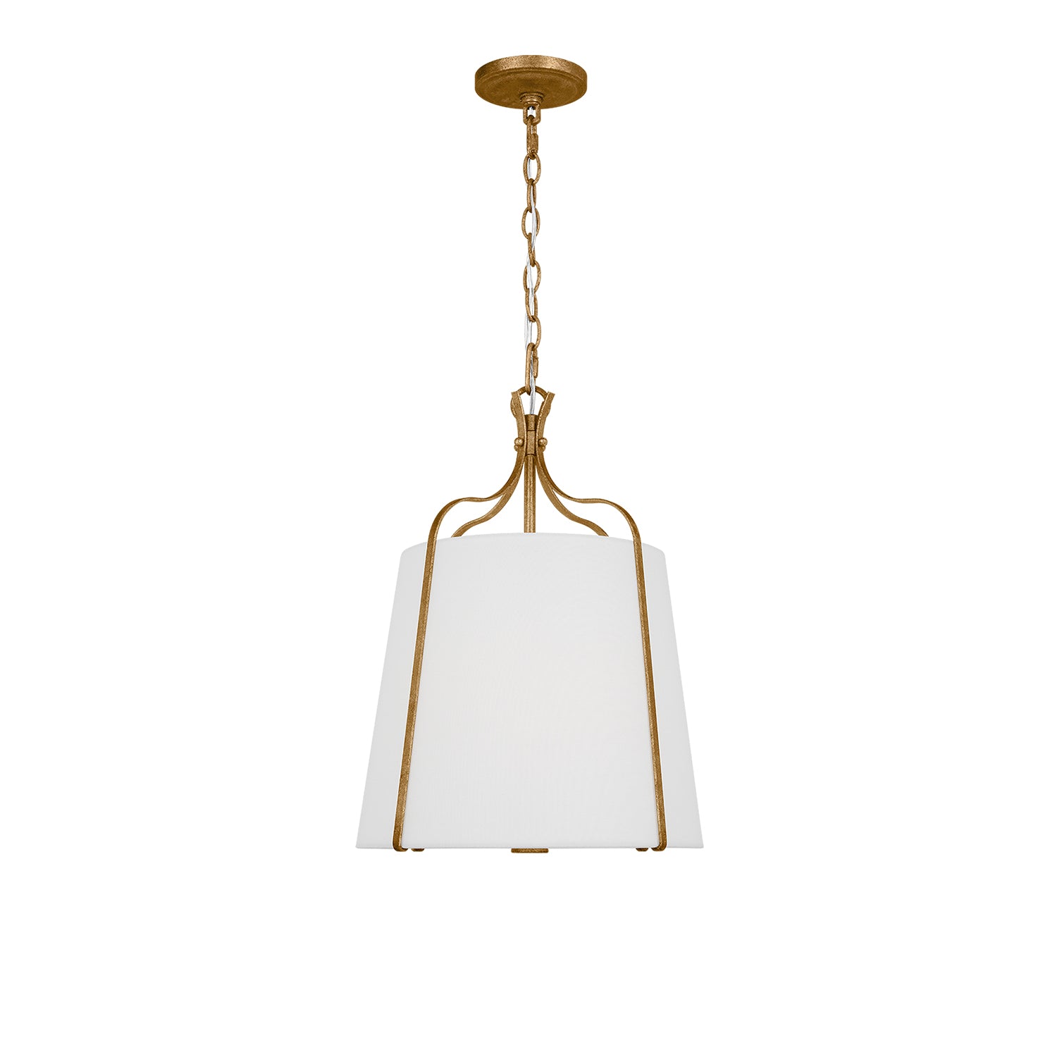 • Contemporary pendant with aged gilded brass finish featuring a structured frame and white linen shade for modern appeal