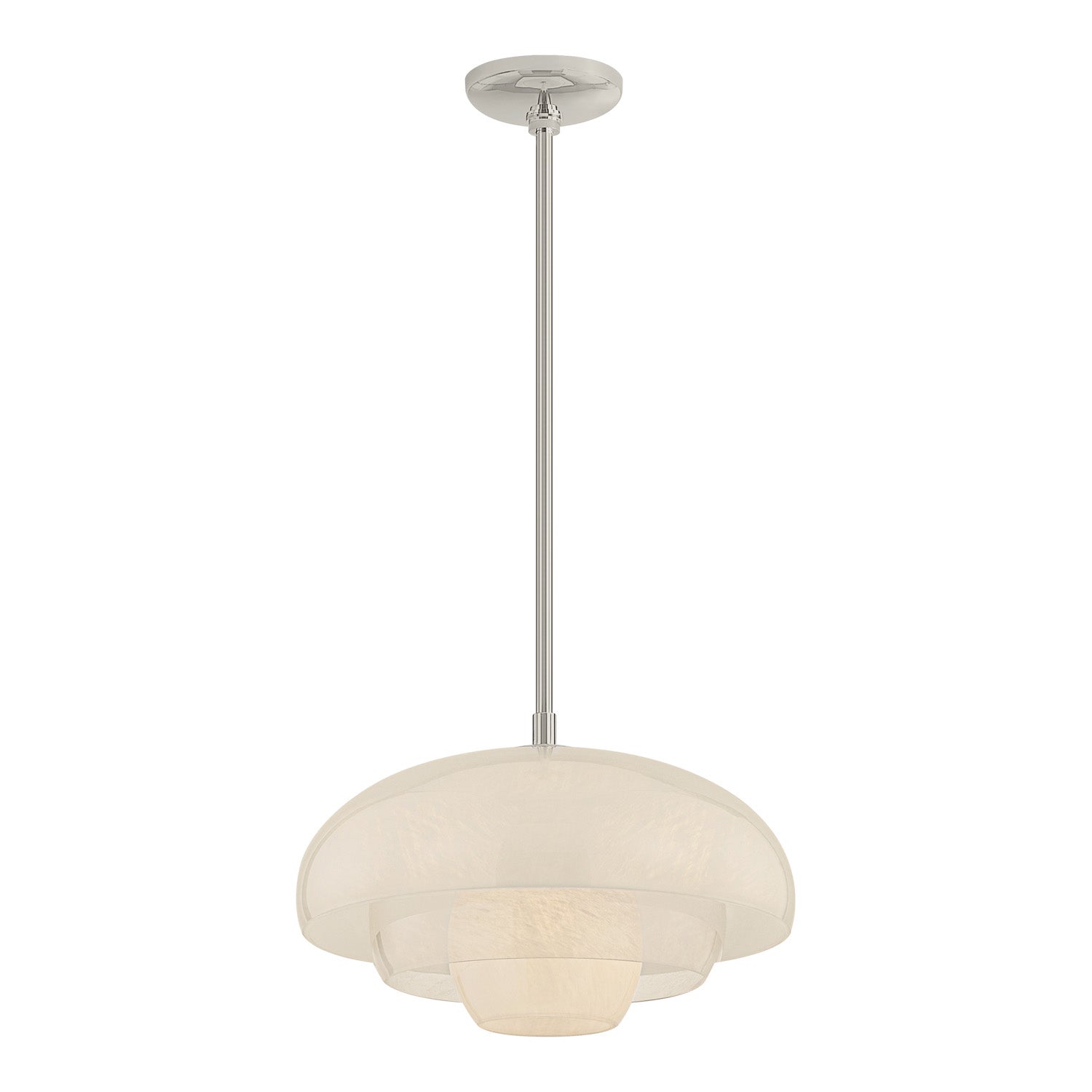 The Jalina Pendant 18" redefines modern hanging lighting as a captivating sculptural piece, defined by its three nested shades that create a voluminous and ethereal silhouette. This imaginative design utilizes the graceful layering of art glass to provide multi-level diffusion, beautifully softening the light to produce a gentle, ambient glow that transforms the atmosphere of the room. The Polished Nickel hardware provides a crisp, mirror-like contrast to the ethereal glass, making it a striking choice for modern living spaces, grand foyers, or minimalist dining rooms.