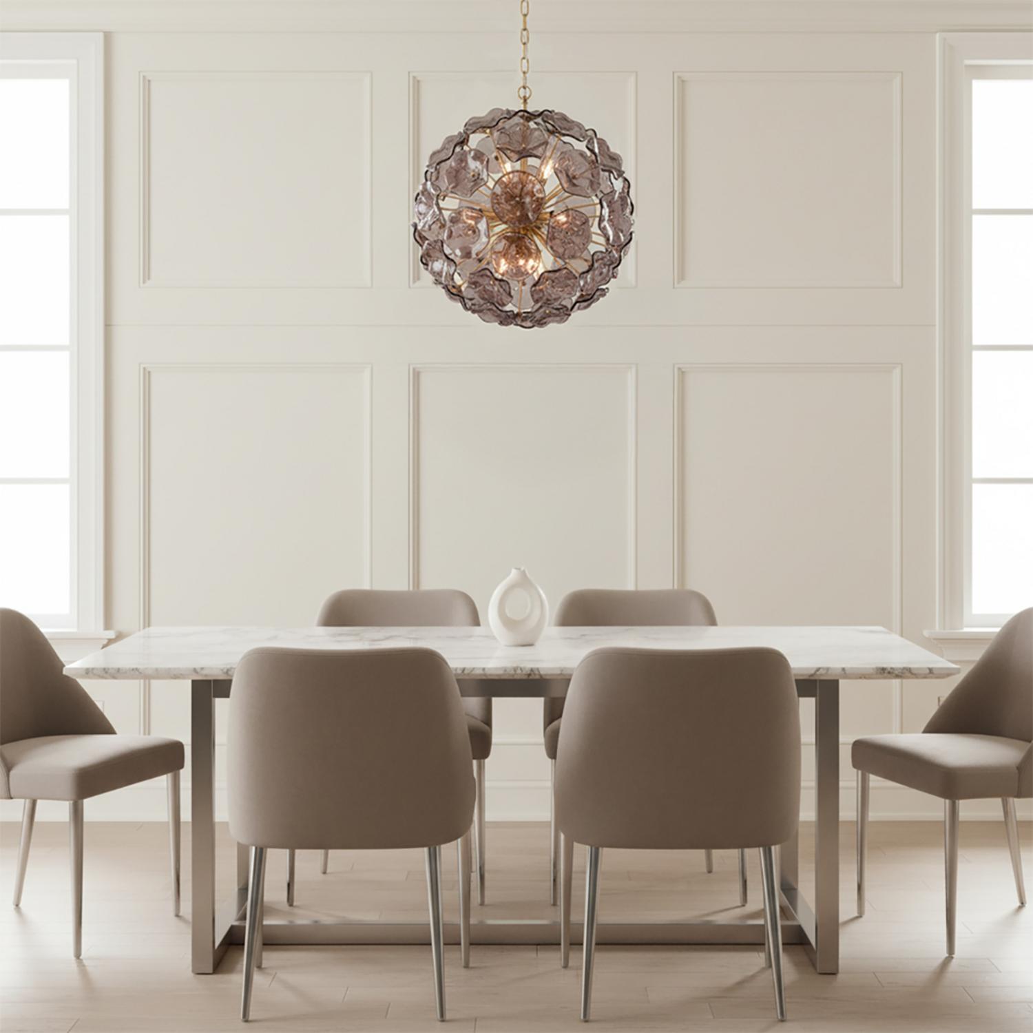The Layla Glass Pendant brings mid-century modern lighting to striking new heights with its breathtaking silhouette. From its central aged brass hub, slender arms radiate outward like rays of light, each culminating in a hand-blown smoke glass petal. This 9-light pendant captivates both day and night—standing as a sculptural centerpiece when unlit and casting a soft, intimate glow through its smoky glass petals when illuminated. The aged brass finish provides a warm counterpoint to the sophisticated smoke glass, balancing vintage charm with contemporary elegance. At 22.5" in diameter, the Layla makes a dramatic statement in dining areas, foyers, or living rooms, becoming not just a source of illumination but a conversation-starting work of art.