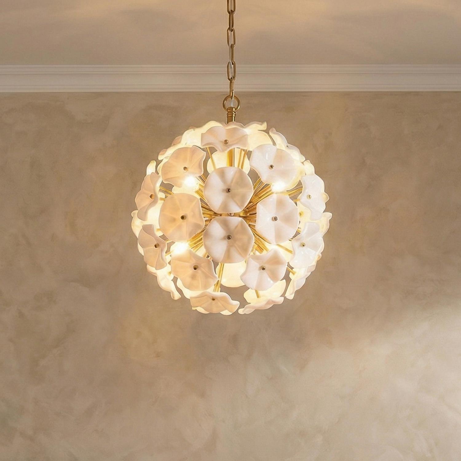 • Illuminated by six E12 candelabra bulbs (not included), creating a warm glow from behind the glass petals