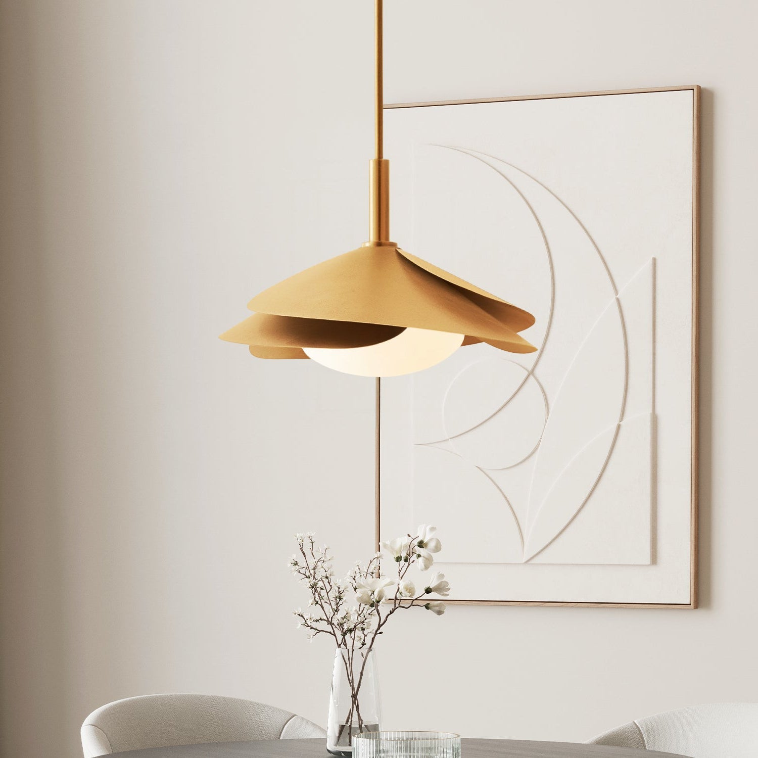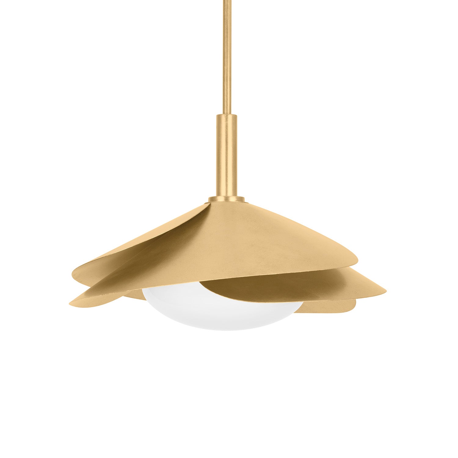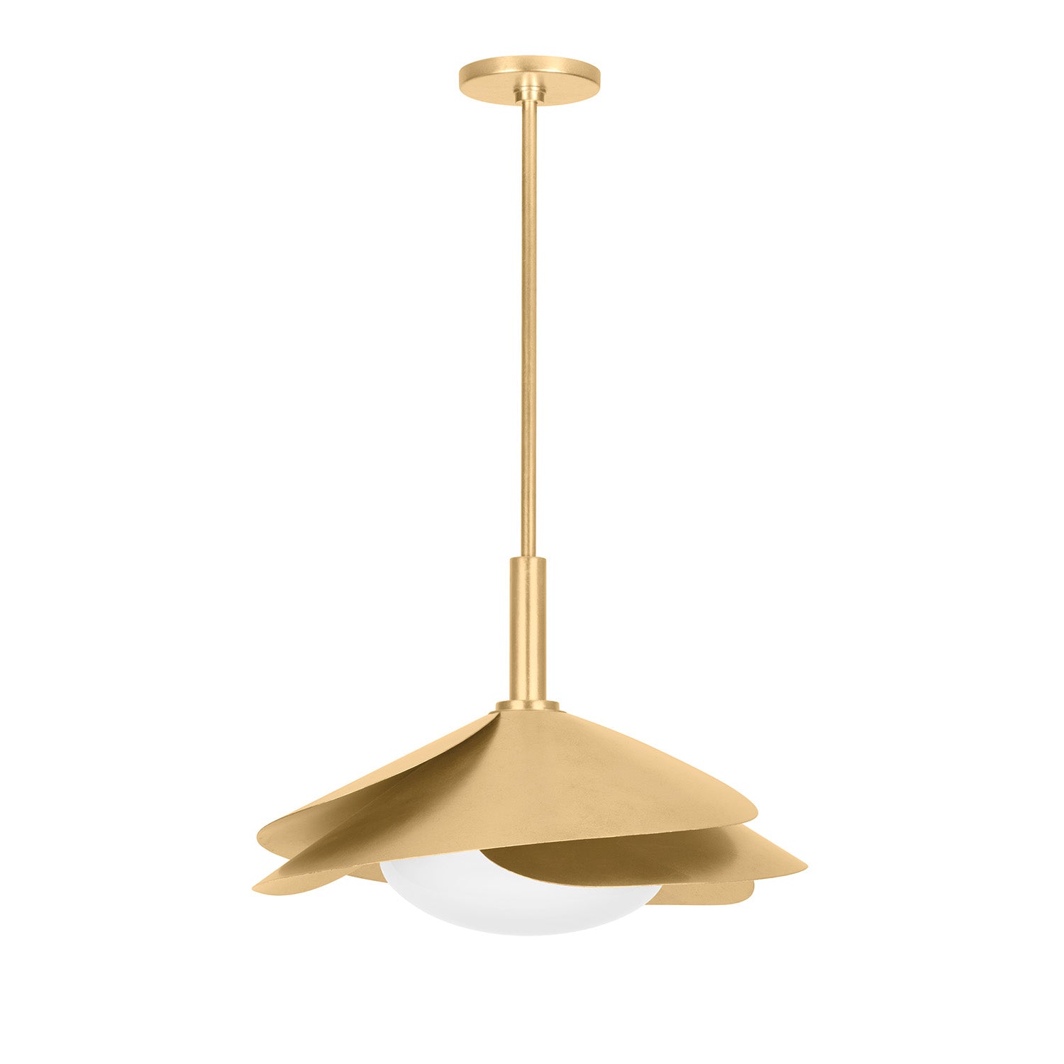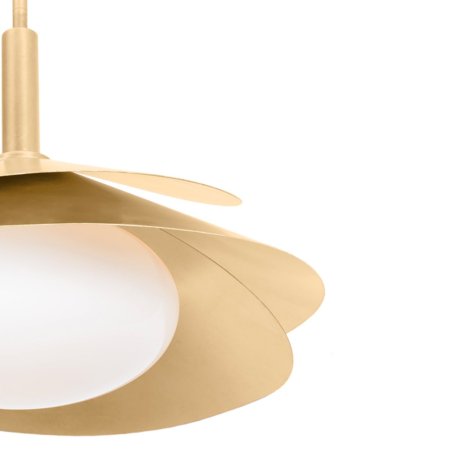 The Lola Pendant 22" captures nature's beauty with overlapping gold leaf petals that swirl gracefully to form an artful yet sophisticated floral shade. Light from the opal glossy glass globe reflects off the sculptural petals to fill your space with a warm, golden glow that draws the eye from every angle. This botanical-inspired fixture combines organic forms with luxurious metallic finishes, creating a stunning focal point that enhances dining rooms, kitchen islands, and living areas. The Lola pendant brings timeless elegance and artistic sophistication to both traditional and contemporary interiors with its captivating floral silhouette.