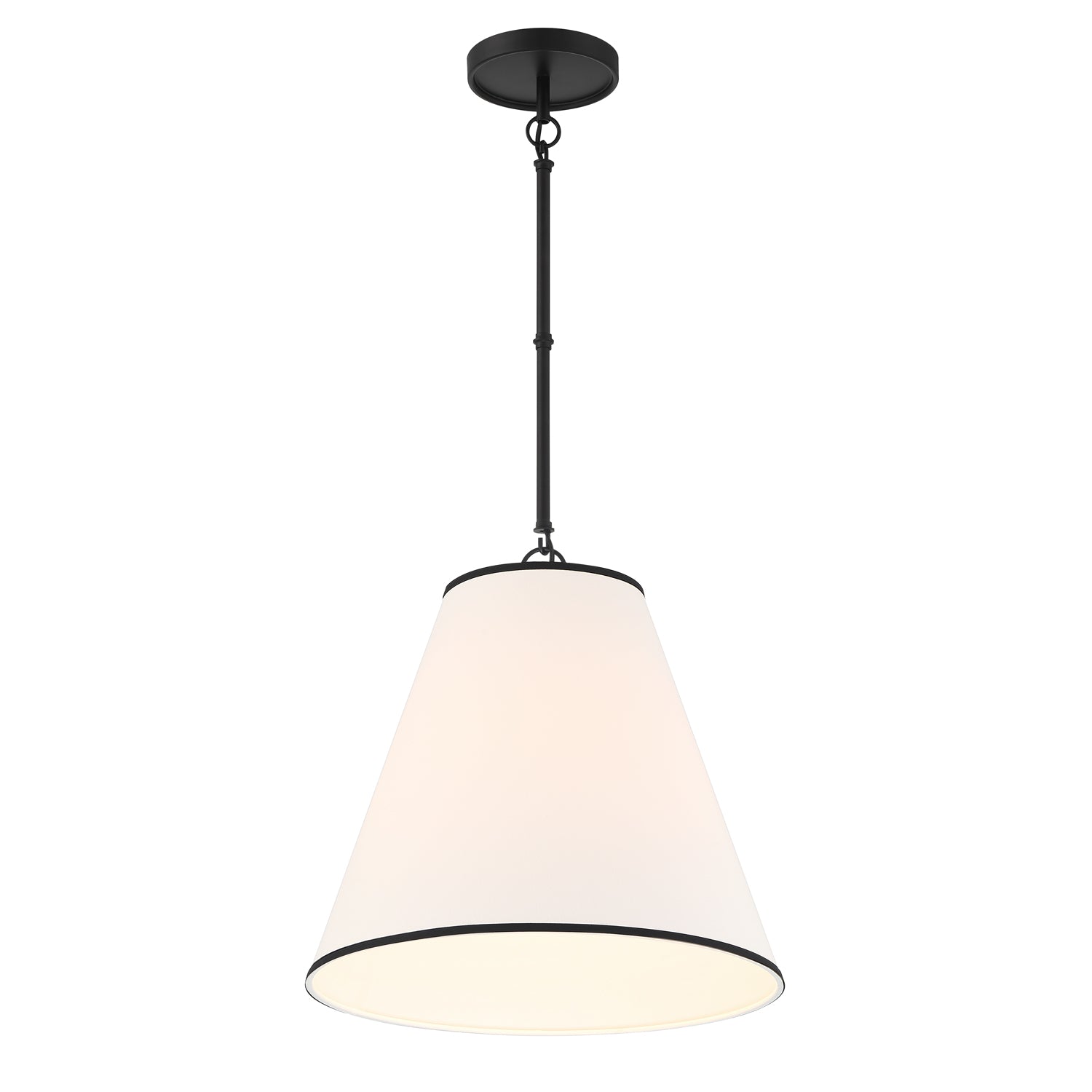 • One classic single-bulb pendant light furnished with a contrasting 18" white fabric shade tapering to a conical shape