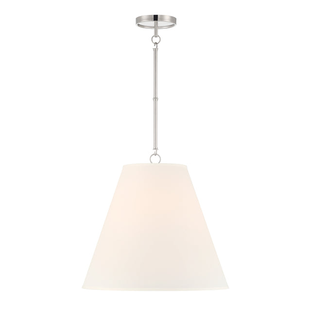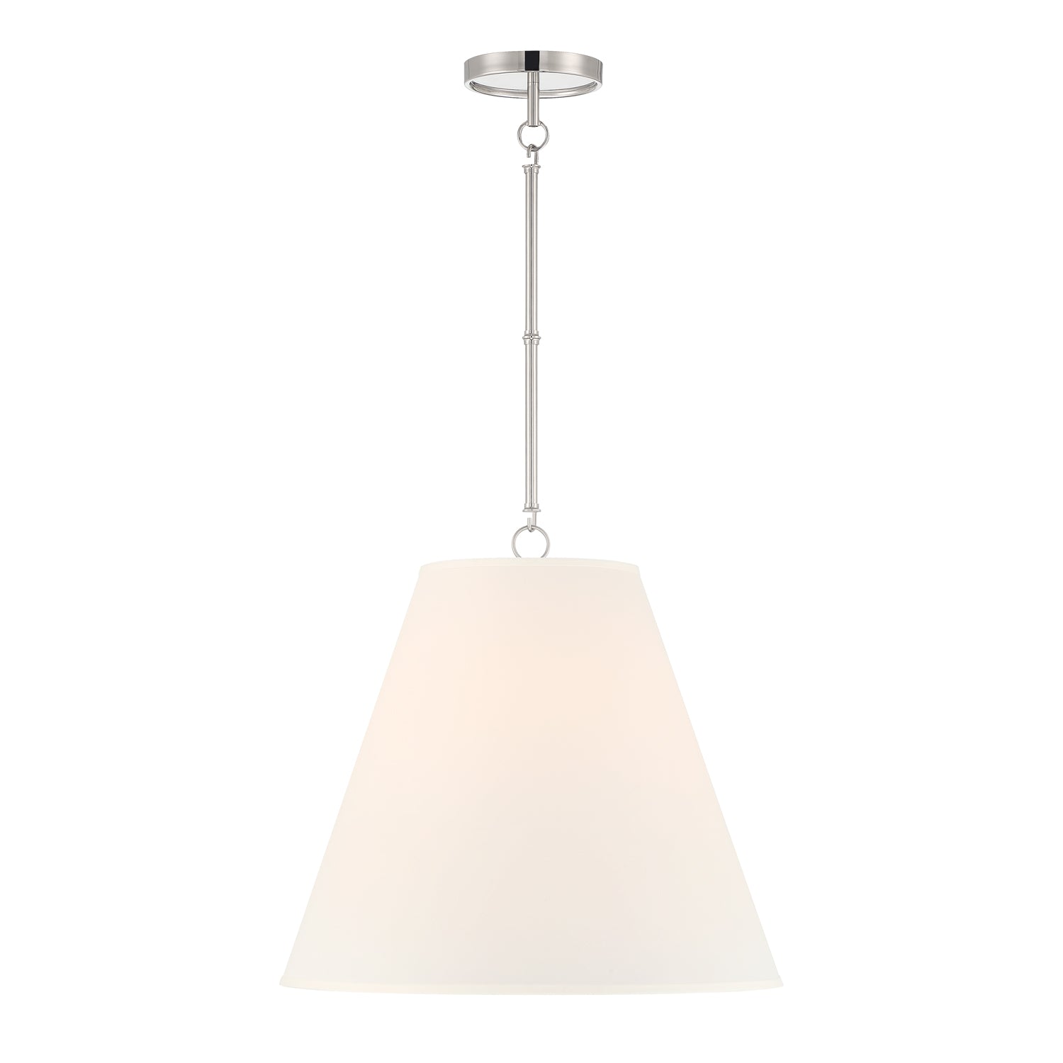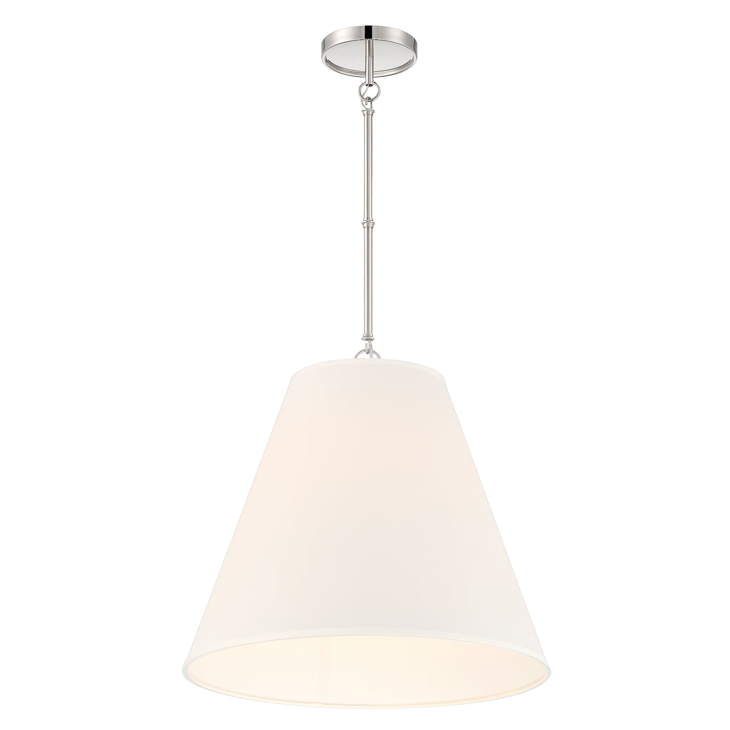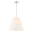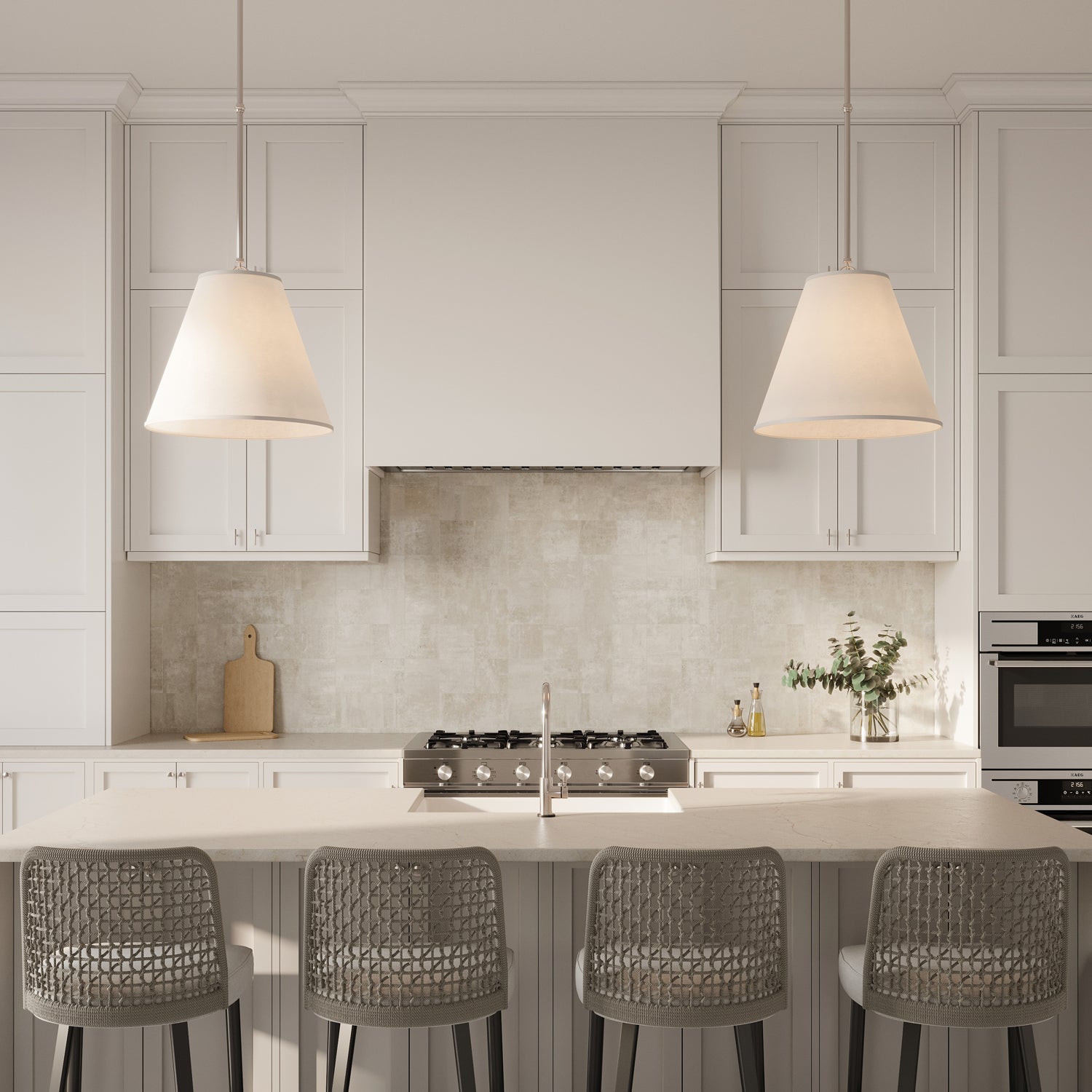 The Luca Large 18" Conical Pendant is comprised of a gleaming polished nickel metal body paired with a dramatic, tapered white fabric shade. While boasting a classic tapered drum pendant silhouette, the Luca provides updated, smart details- perfectly executed complementary white fabric shade, and adjustable hanging height by way of six-inch rods and decorative couplers. With a traditional shape and modern finishes and textures, this pendant works well in transitional, traditional, or modern spaces. The gorgeous fabric shade is optimal for overhead lighting, helping to diffuse and soften the light from any bulb. The Luca series of fabric pendant lights are perfect in sets above dining room tables, kitchen islands or as a single light in a bedroom, entryway, or kitchenette.