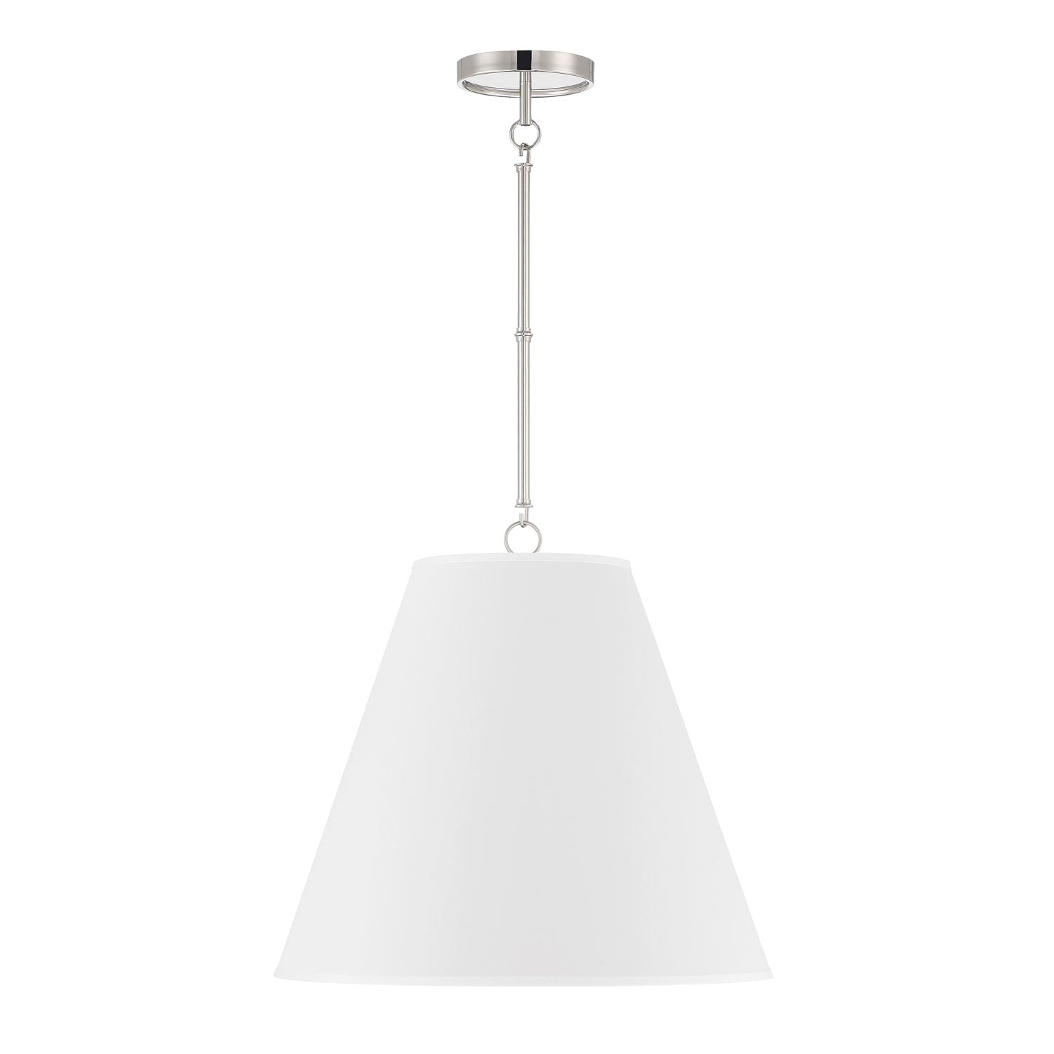 • One classic single-bulb pendant light furnished with a complementary 18" white fabric shade tapering to a conical shape
