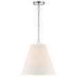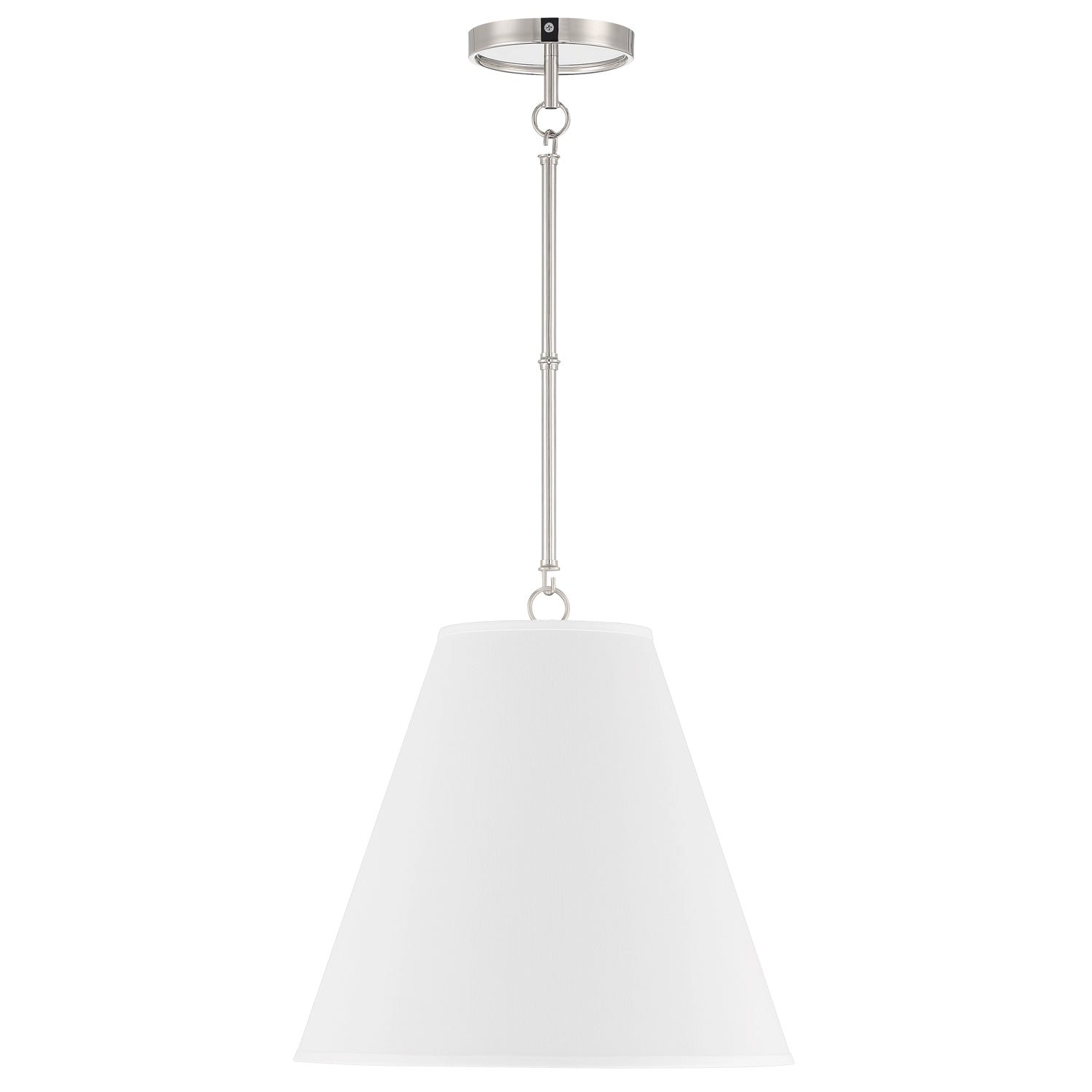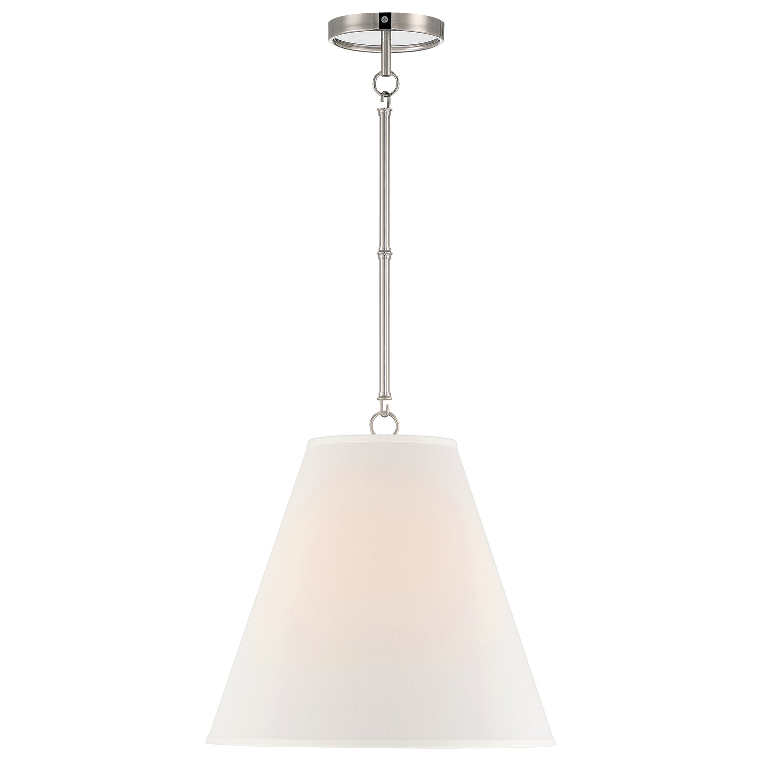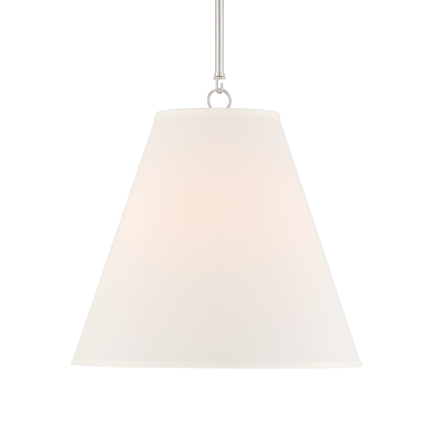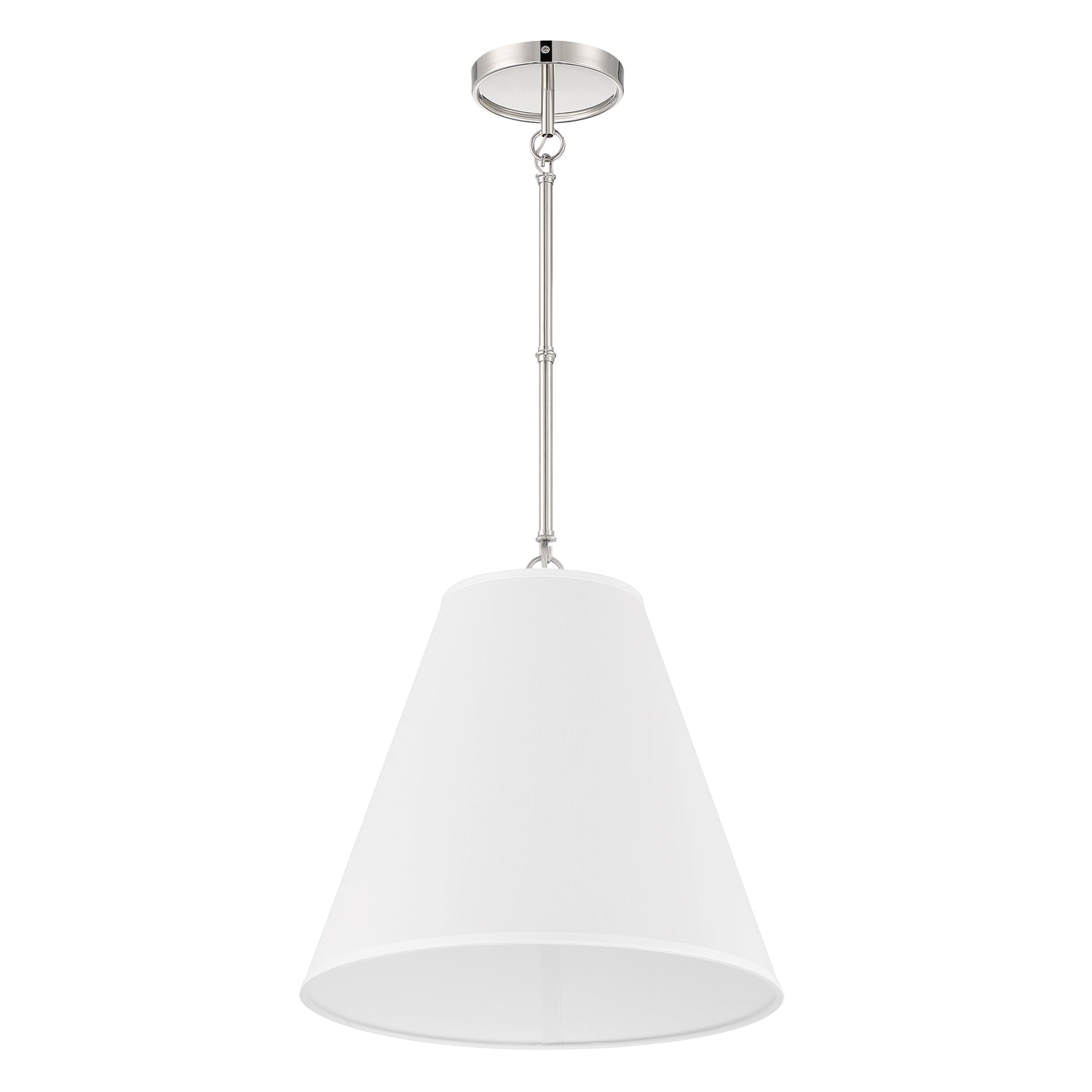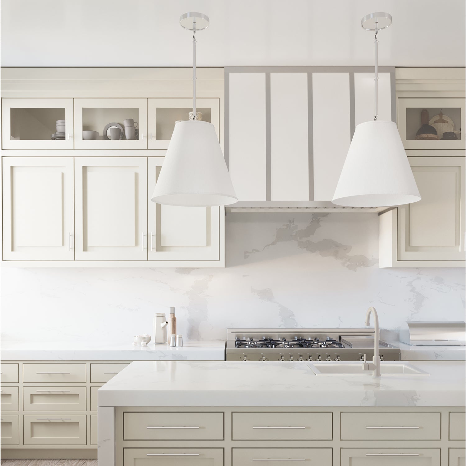 The Luca Medium 15" Conical Pendant is comprised of a gleaming polished nickel metal body paired with a dramatic, tapered white fabric shade. While boasting a classic tapered drum pendant silhouette, the Luca provides updated, smart details- perfectly executed complementary white fabric shade, and adjustable hanging height by way of six-inch rods and decorative couplers. With a traditional shape and modern finishes and textures, this pendant works well in transitional, traditional, or modern spaces. The gorgeous fabric shade is optimal for overhead lighting, helping to diffuse and soften the light from any bulb. The Luca series of fabric pendant lights are perfect in sets above dining room tables, kitchen islands or as a single light in a bedroom, entryway, or kitchenette.